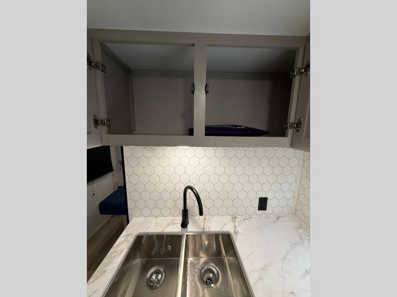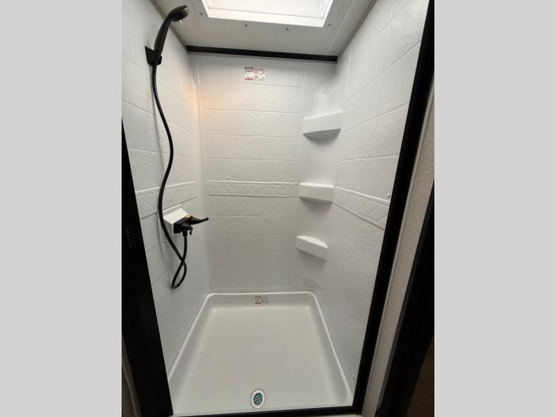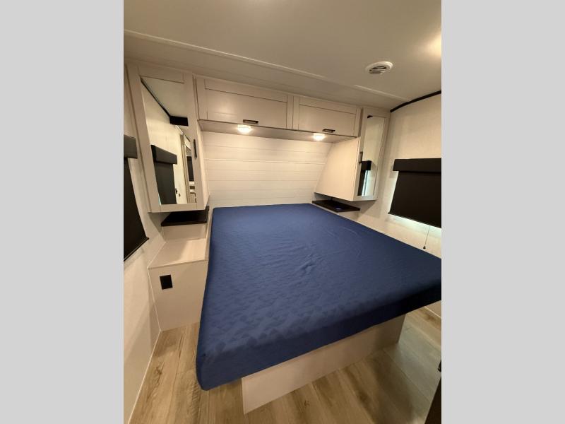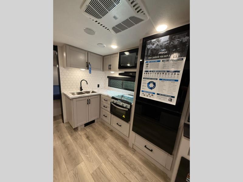 With any Jay Feather travel trailer by Jayco, you will enjoy lightweight towing, convenient exterior amenities, and at-home comforts inside! The Overlander 1 Solar Package included within the Jay Sport Package comes with a 200W solar panel and a 30-amp digital controller so you can enjoy some off-grid camping. There is also a modern graphics package with a dual-colored sidewall, LCI Solid Step fold-down aluminum tread steps on the main entry door, and Climate Shield 0 -100° F tested weather insulation package that will allow you to camp in all sorts of climates. The Customer Value Package will make time outdoors easier than ever with a power tongue jack and a Rock Solid stabilizer system, plus American-made nitro-filled Goodyear tires with self-adjusting electric brakes. More exterior features include a Keyed-Alike locking system, marine grade exterior speakers, a Magnum Truss roof system, and the list goes on! And we haven't even touched on the interior comforts, like the residential style seamless countertops and vinyl flooring throughout, decorative backsplash, handcrafted hardwood door/drawer fronts, and multiple USB charging ports to keep you going!