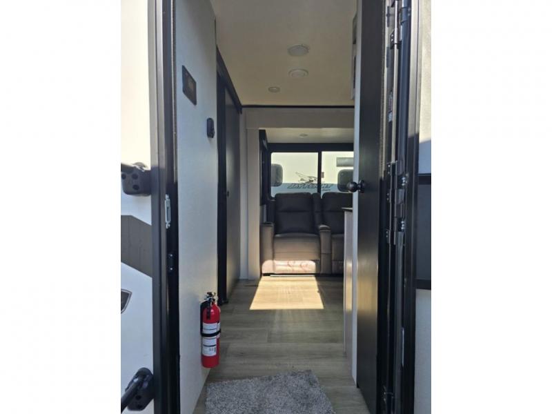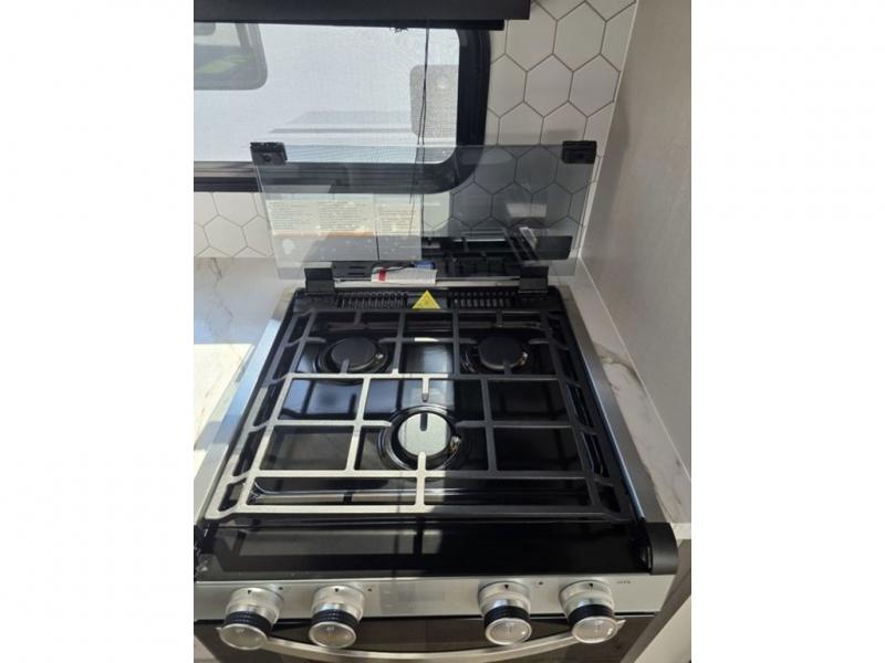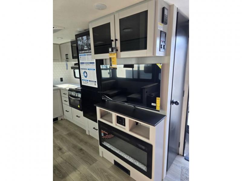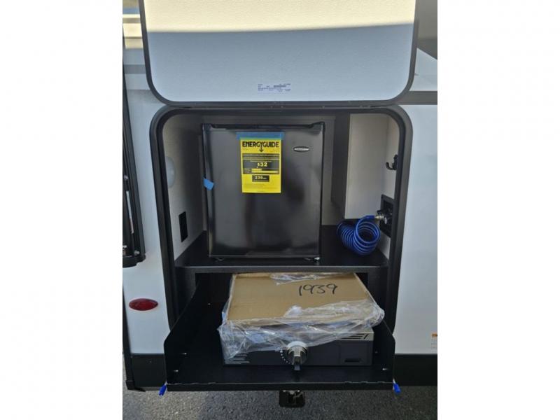 This travel trailer with a full rear bath is sure to bring you comfort wherever you camp. The front private bedroom with queen bed and dual wardrobes will have you feeling right at home. You can enjoy home cooked meals while at the campsite thanks to the three-burner cooktop and 11 cu. ft. 12V refrigerator, plus there is a walk-in pantry to store all of your favorite snacks along with a stainless-steel sink. The tri-fold sofa and booth dinette within the slide out offer comfortable places to relax and dine, both of them acting as extra sleeping space if needed. You can even cook breakfast outdoors using the outside kitchen and stay protected from the elements by the 19' power awning!
