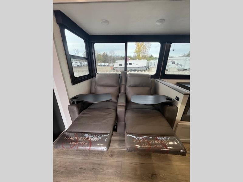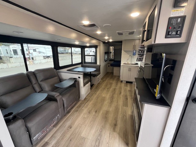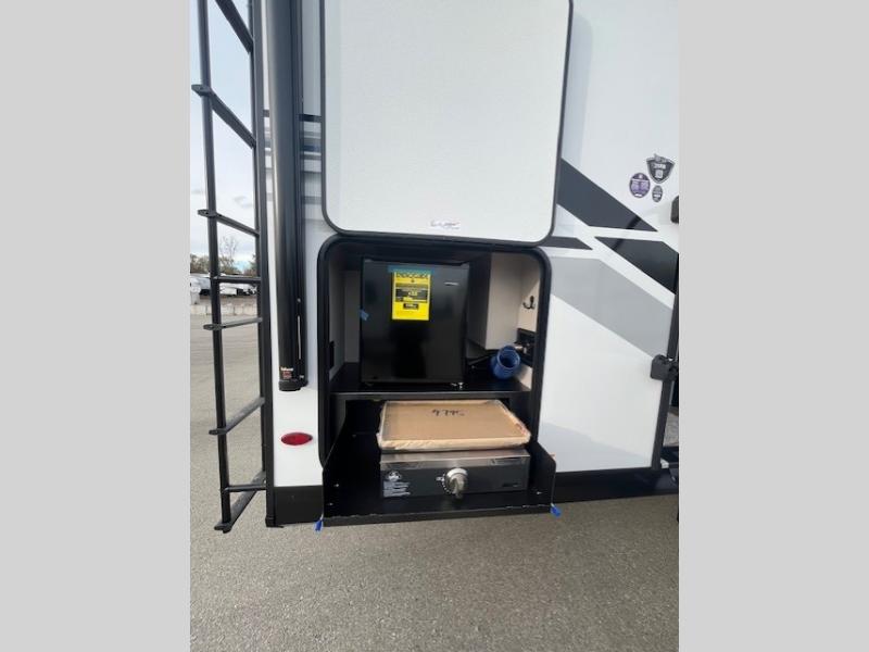 This travel trailer with a full rear bath is sure to bring you comfort wherever you camp. The front private bedroom with queen bed and dual wardrobes will have you feeling right at home. You can enjoy home cooked meals while at the campsite thanks to the three-burner cooktop and 11 cu. ft. 12V refrigerator, plus there is a walk-in pantry to store all of your favorite snacks along with a stainless-steel sink. The tri-fold sofa and booth dinette within the slide out offer comfortable places to relax and dine, both of them acting as extra sleeping space if needed. You can even cook breakfast outdoors using the outside kitchen and stay protected from the elements by the 19' power awning!