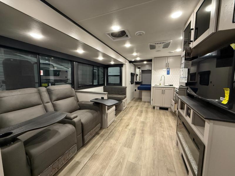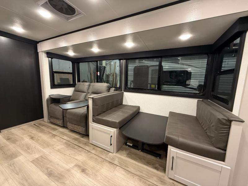 This travel trailer with a full rear bath is sure to bring you comfort wherever you camp. The front private bedroom with queen bed and dual wardrobes will have you feeling right at home. You can enjoy home cooked meals while at the campsite thanks to the three-burner cooktop and 11 cu. ft. 12V refrigerator, plus there is a walk-in pantry to store all of your favorite snacks along with a stainless-steel sink. The tri-fold sofa and booth dinette within the slide out offer comfortable places to relax and dine, both of them acting as extra sleeping space if needed. You can even cook breakfast outdoors using the outside kitchen and stay protected from the elements by the 19' power awning!