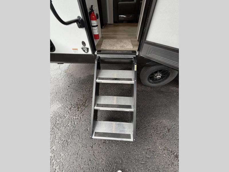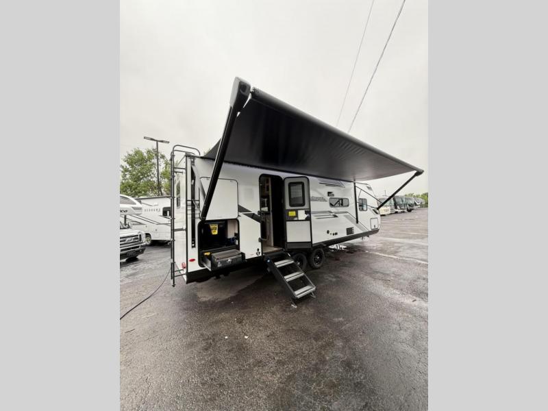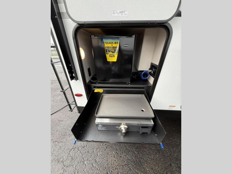 This travel trailer with a full rear bath is sure to bring you comfort wherever you camp. The front private bedroom with queen bed and dual wardrobes will have you feeling right at home. You can enjoy home cooked meals while at the campsite thanks to the three-burner cooktop and 11 cu. ft. 12V refrigerator, plus there is a walk-in pantry to store all of your favorite snacks along with a stainless-steel sink. The tri-fold sofa and booth dinette within the slide out offer comfortable places to relax and dine, both of them acting as extra sleeping space if needed. You can even cook breakfast outdoors using the outside kitchen and stay protected from the elements by the 19' power awning!