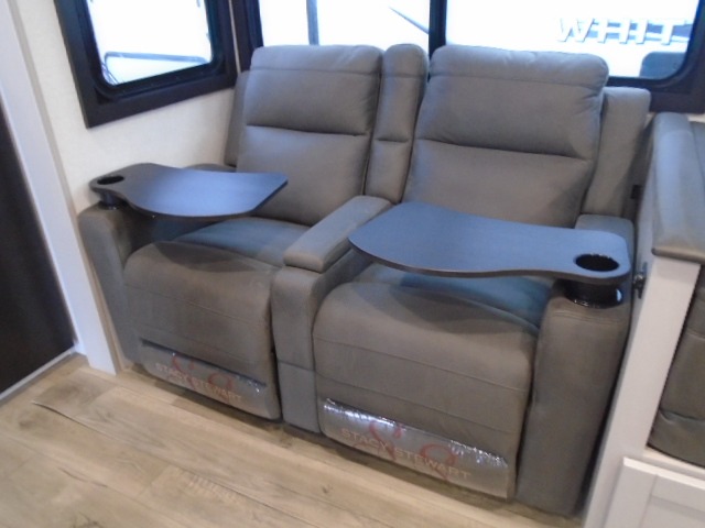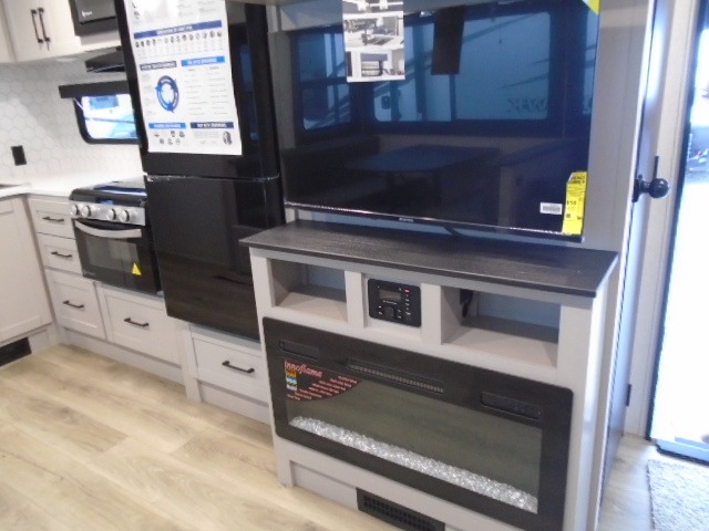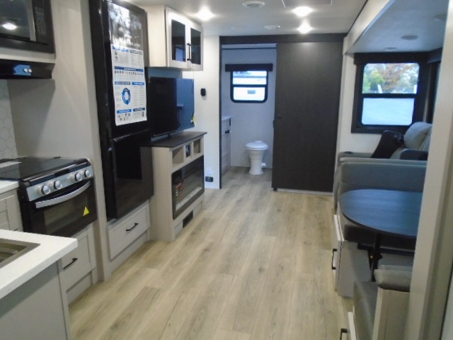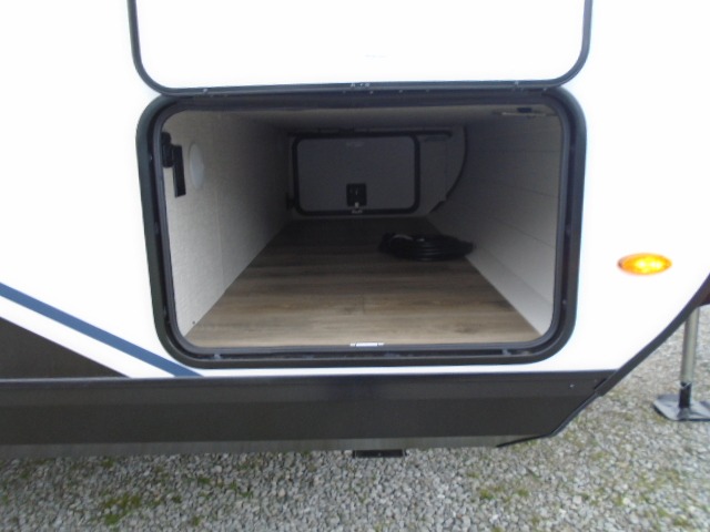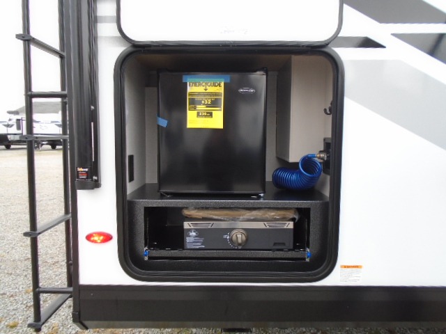 This travel trailer with a full rear bath is sure to bring you comfort wherever you camp. The front private bedroom with queen bed and dual wardrobes will have you feeling right at home. You can enjoy home cooked meals while at the campsite thanks to the three-burner cooktop and 11 cu. ft. 12V refrigerator, plus there is a walk-in pantry to store all of your favorite snacks along with a stainless-steel sink. The tri-fold sofa and booth dinette within the slide out offer comfortable places to relax and dine, both of them acting as extra sleeping space if needed. You can even cook breakfast outdoors using the outside kitchen and stay protected from the elements by the 19' power awning!