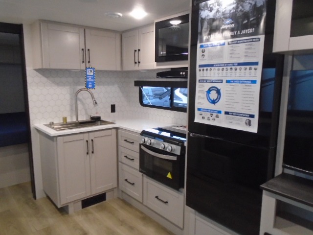 With any Jay Feather travel trailer by Jayco, you will enjoy lightweight towing, convenient exterior amenities, and at-home comforts inside! The Overlander 1 Solar Package included within the Jay Sport Package comes with a 200W solar panel and a 30-amp digital controller so you can enjoy some off-grid camping. There is also a modern graphics package, Solid fold-down step with aluminum tread steps on the main entry doorstep, and Climate Shield 0 -100° F tested weather insulation package that will allow you to camp in various types of climates. The Customer Value Package will make time outdoors easier than ever with a power tongue jack and Automotive-style aluminum rims, plus radial tires with self-adjusting electric brakes. More exterior features include a Keyed-Alike doors, a Magnum Truss roof system, and the list goes on! And we haven't even touched on the interior comforts, like the seamless countertops and Residential vinyl flooring throughout, decorative kitchen backsplash, handcrafted hardwood door/drawer fronts, and multiple USB charging ports to keep you going!