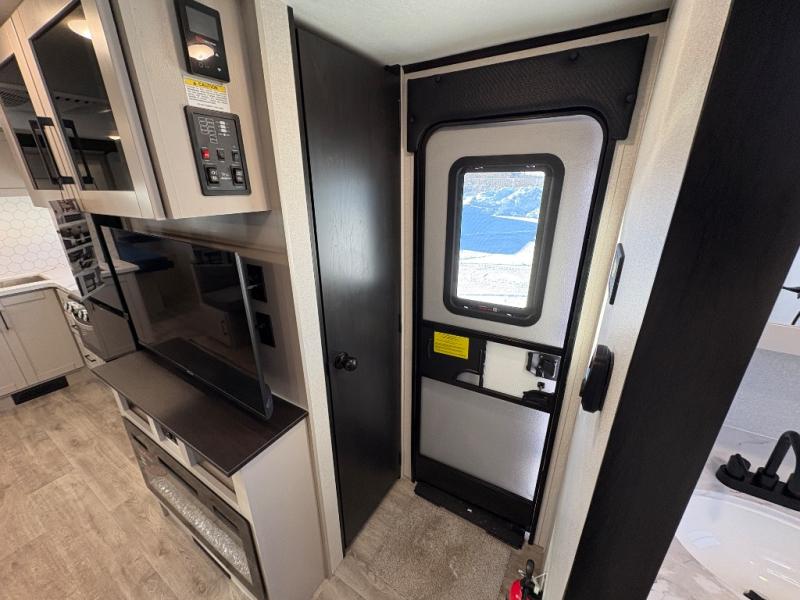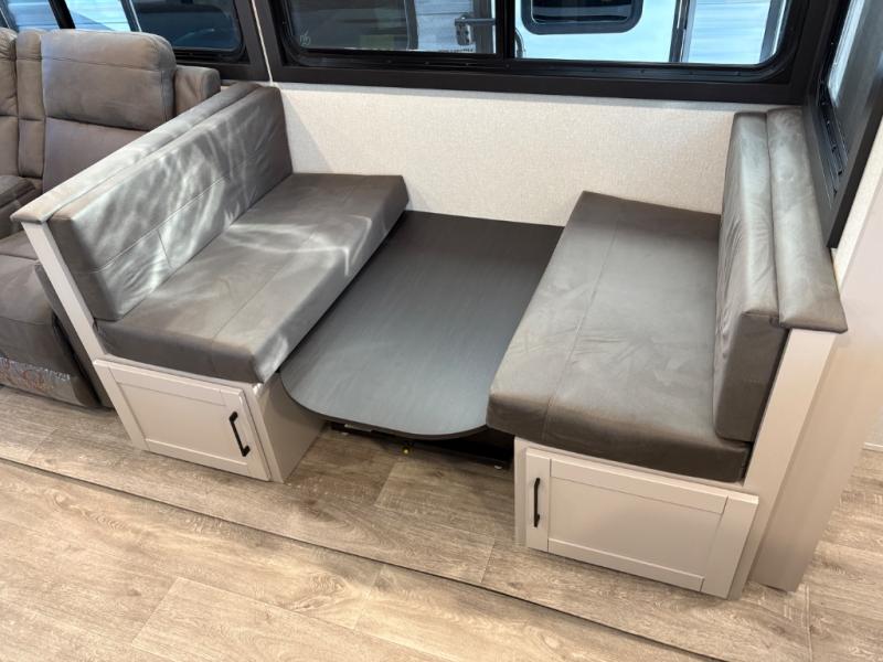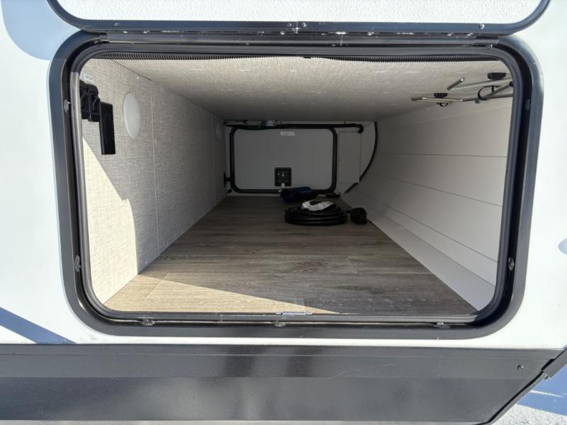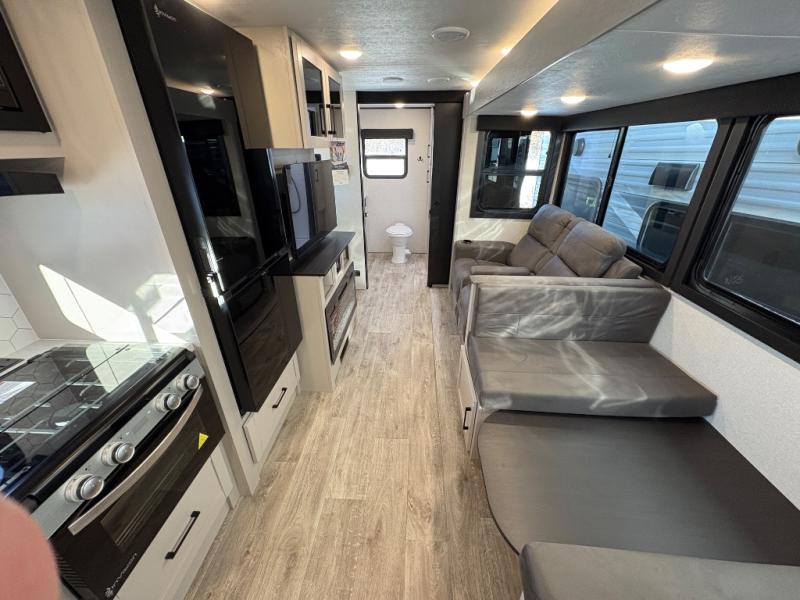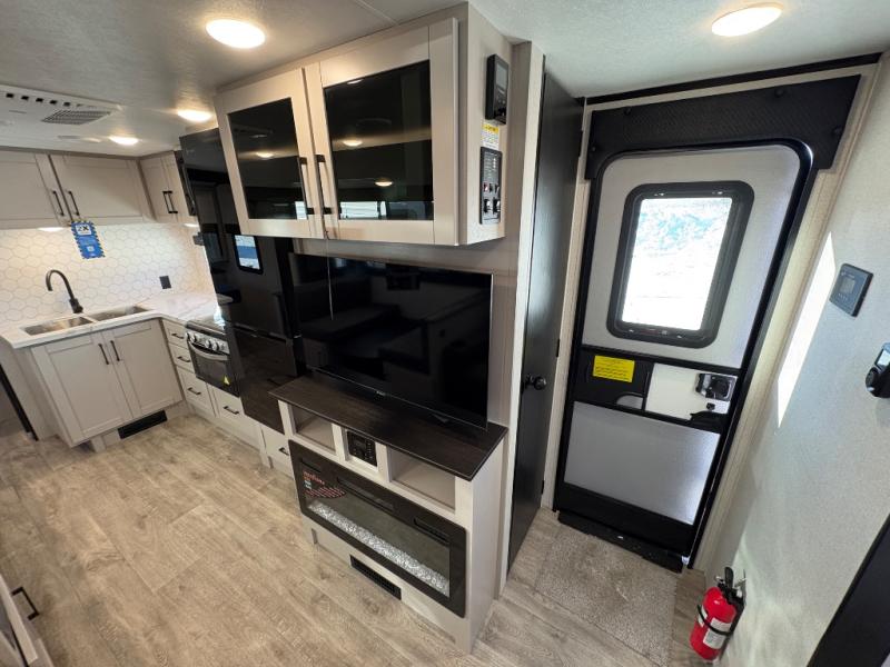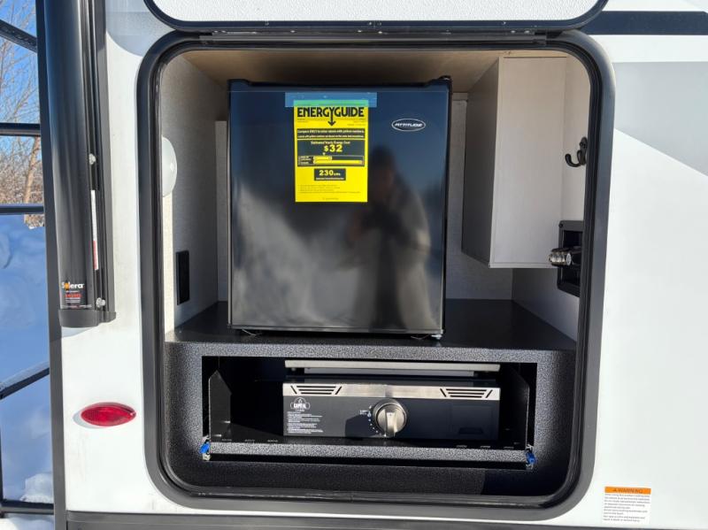 This travel trailer with a full rear bath is sure to bring you comfort wherever you camp. The front private bedroom with queen bed and dual wardrobes will have you feeling right at home. You can enjoy home cooked meals while at the campsite thanks to the three-burner cooktop and 11 cu. ft. 12V refrigerator, plus there is a walk-in pantry to store all of your favorite snacks along with a stainless-steel sink. The tri-fold sofa and booth dinette within the slide out offer comfortable places to relax and dine, both of them acting as extra sleeping space if needed. You can even cook breakfast outdoors using the outside kitchen and stay protected from the elements by the 19' power awning!