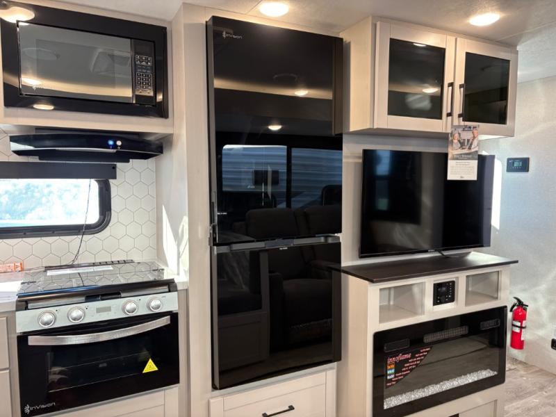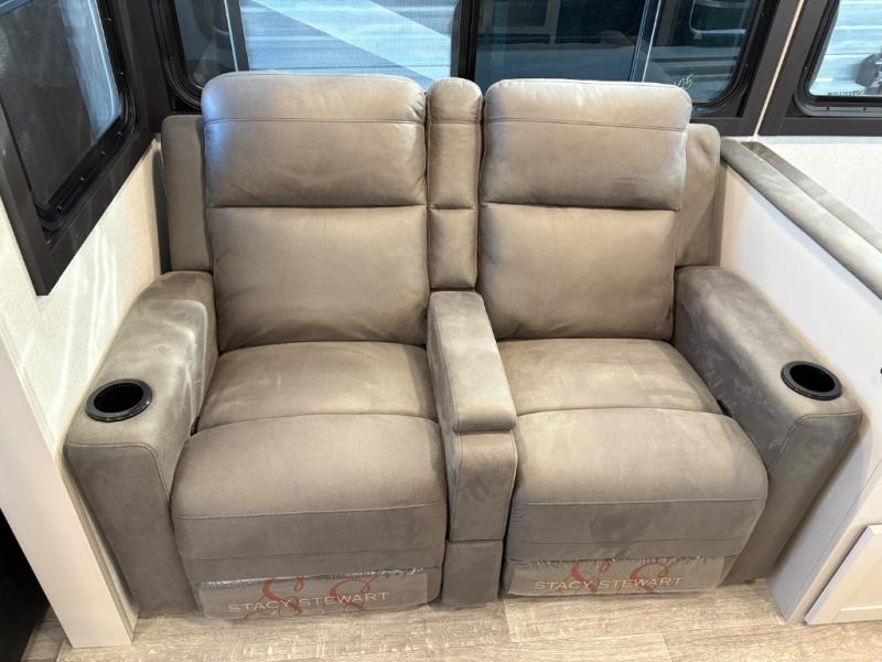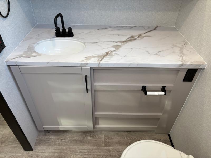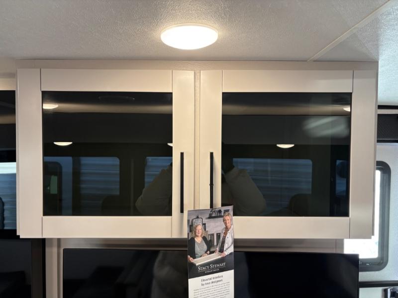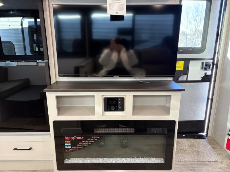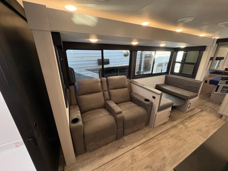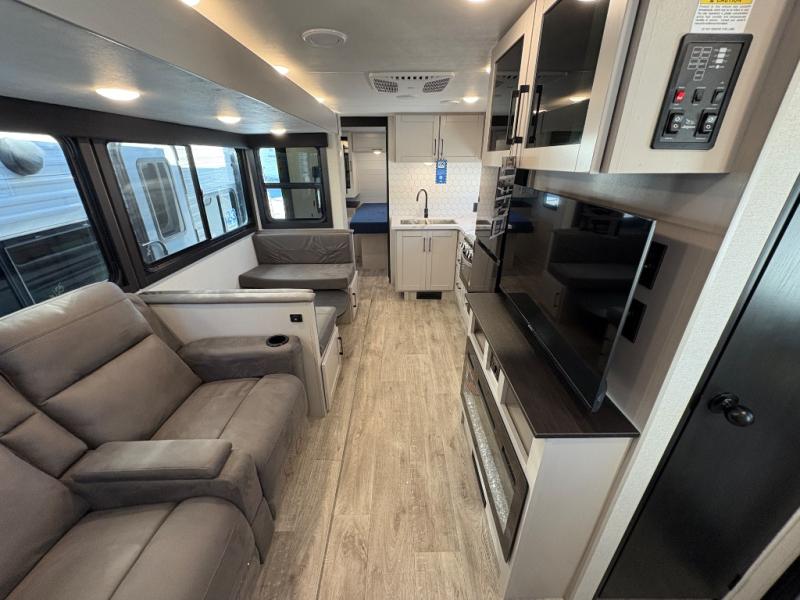 This travel trailer with a full rear bath is sure to bring you comfort wherever you camp. The front private bedroom with queen bed and dual wardrobes will have you feeling right at home. You can enjoy home cooked meals while at the campsite thanks to the three-burner cooktop and 11 cu. ft. 12V refrigerator, plus there is a walk-in pantry to store all of your favorite snacks along with a stainless-steel sink. The tri-fold sofa and booth dinette within the slide out offer comfortable places to relax and dine, both of them acting as extra sleeping space if needed. You can even cook breakfast outdoors using the outside kitchen and stay protected from the elements by the 19' power awning!