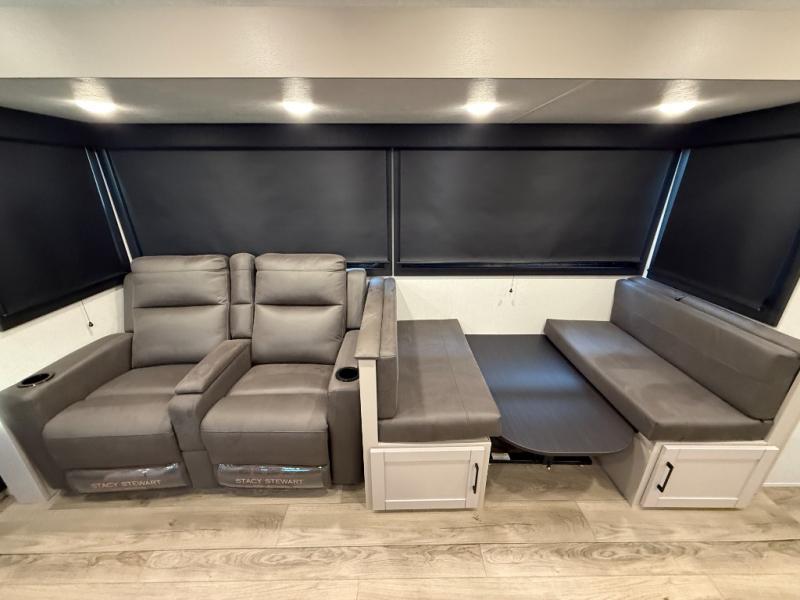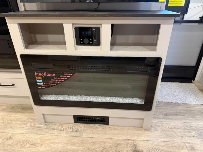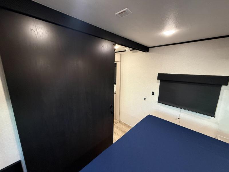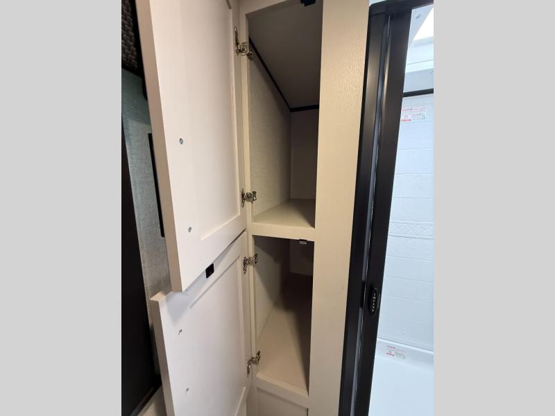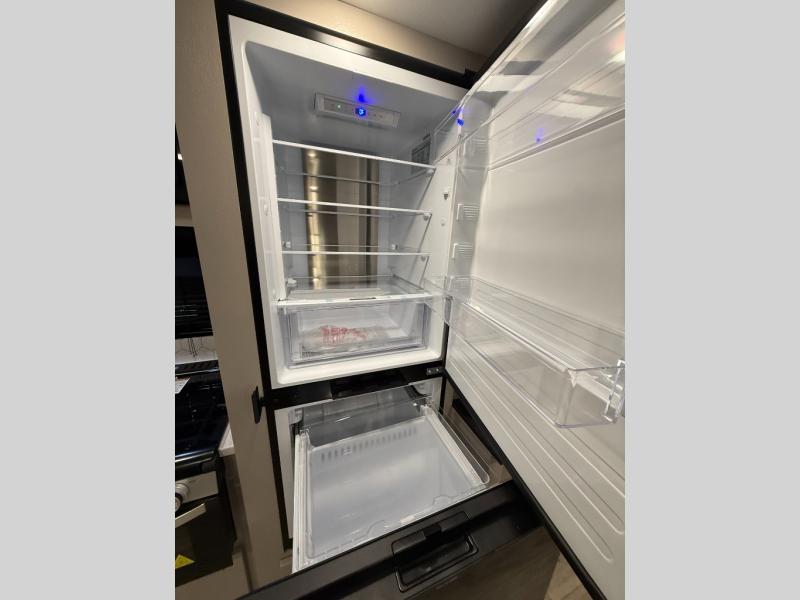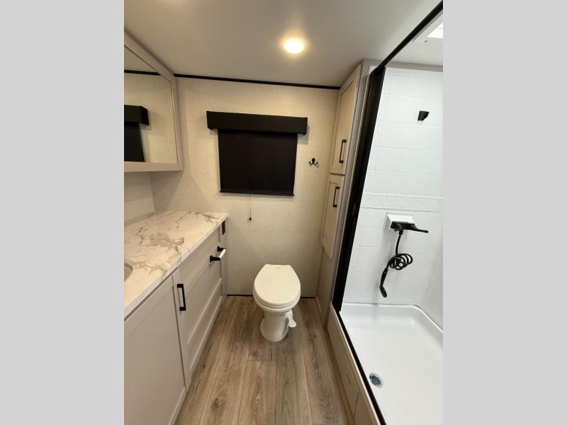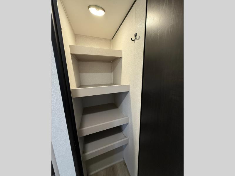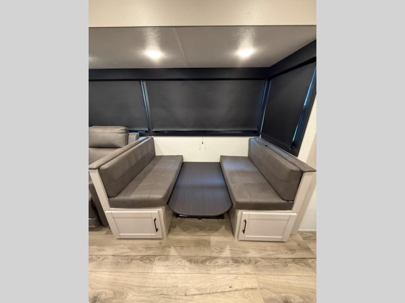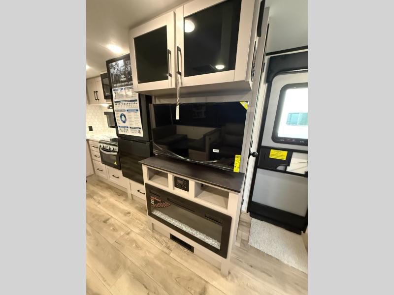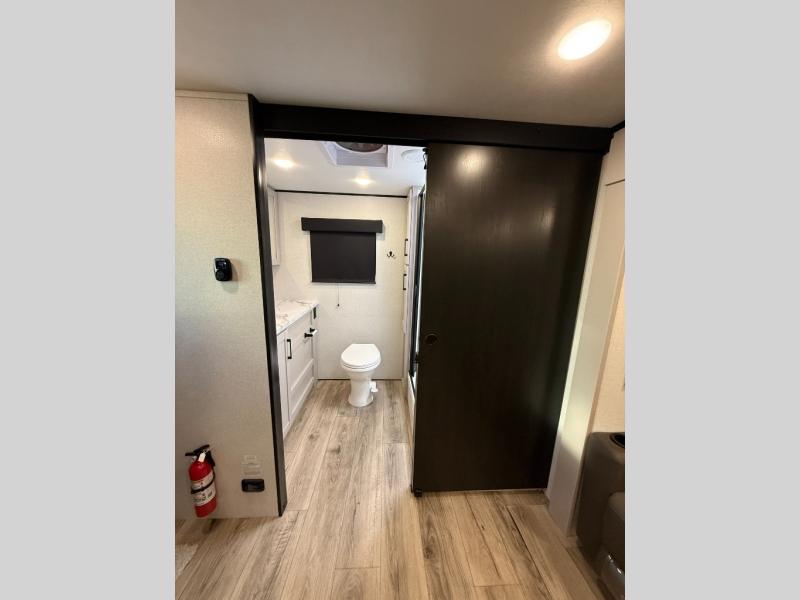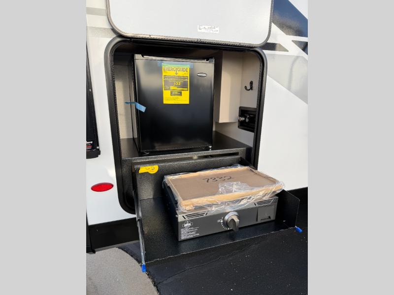 This travel trailer with a full rear bath is sure to bring you comfort wherever you camp. The front private bedroom with queen bed and dual wardrobes will have you feeling right at home. You can enjoy home cooked meals while at the campsite thanks to the three-burner cooktop and 11 cu. ft. 12V refrigerator, plus there is a walk-in pantry to store all of your favorite snacks along with a stainless-steel sink. The tri-fold sofa and booth dinette within the slide out offer comfortable places to relax and dine, both of them acting as extra sleeping space if needed. You can even cook breakfast outdoors using the outside kitchen and stay protected from the elements by the 19' power awning!