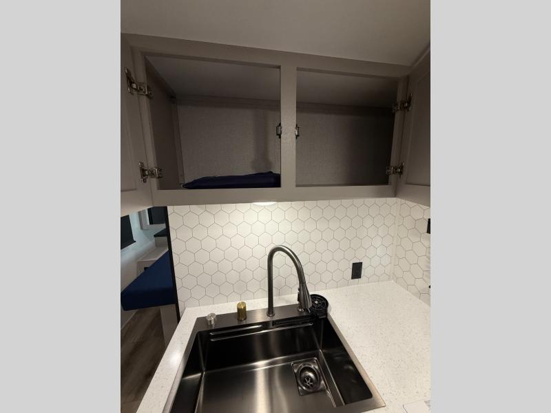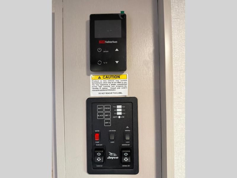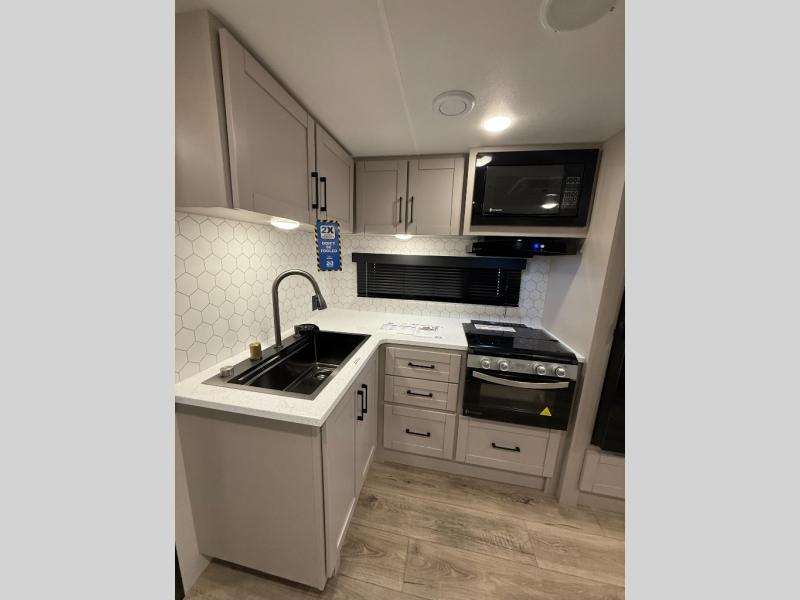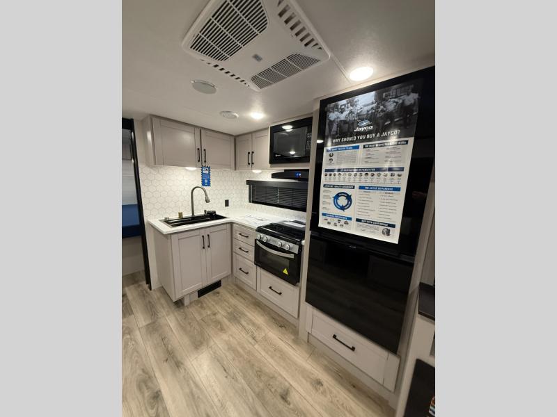 With any Jay Feather travel trailer by Jayco, you will enjoy lightweight towing, convenient exterior amenities, and at-home comforts inside! The Overlander 1 Solar Package included within the Jay Sport Package comes with a 200W solar panel and a 30-amp digital controller so you can enjoy some off-grid camping. There is also a modern graphics package, Solid fold-down step with aluminum tread steps on the main entry doorstep, and Climate Shield 0 -100° F tested weather insulation package that will allow you to camp in various types of climates. The Customer Value Package will make time outdoors easier than ever with a power tongue jack and Automotive-style aluminum rims, plus radial tires with self-adjusting electric brakes. More exterior features include a Keyed-Alike doors, a Magnum Truss roof system, and the list goes on! And we haven't even touched on the interior comforts, like the seamless countertops and Residential vinyl flooring throughout, decorative kitchen backsplash, handcrafted hardwood door/drawer fronts, and multiple USB charging ports to keep you going!