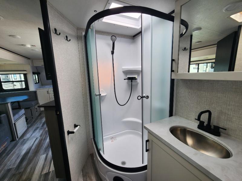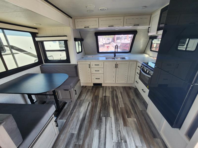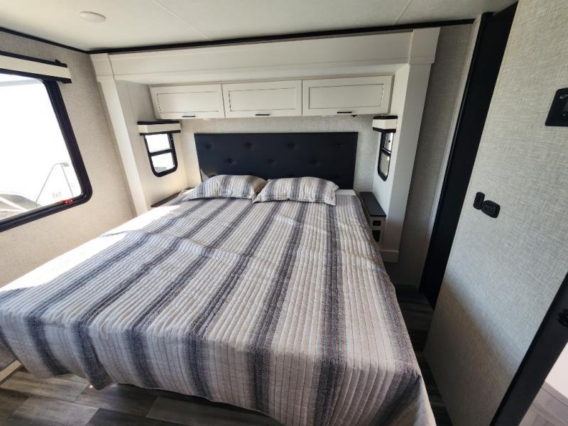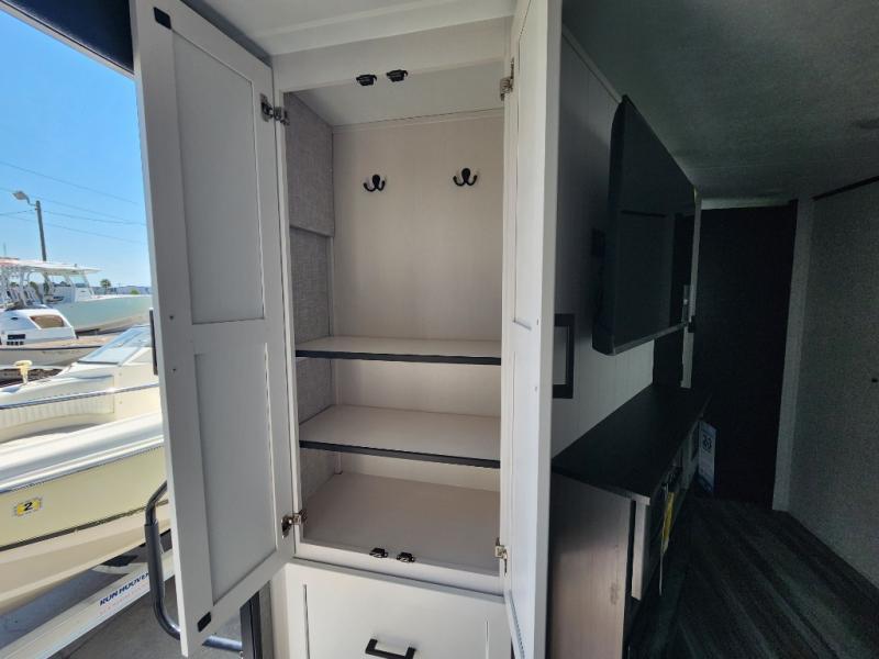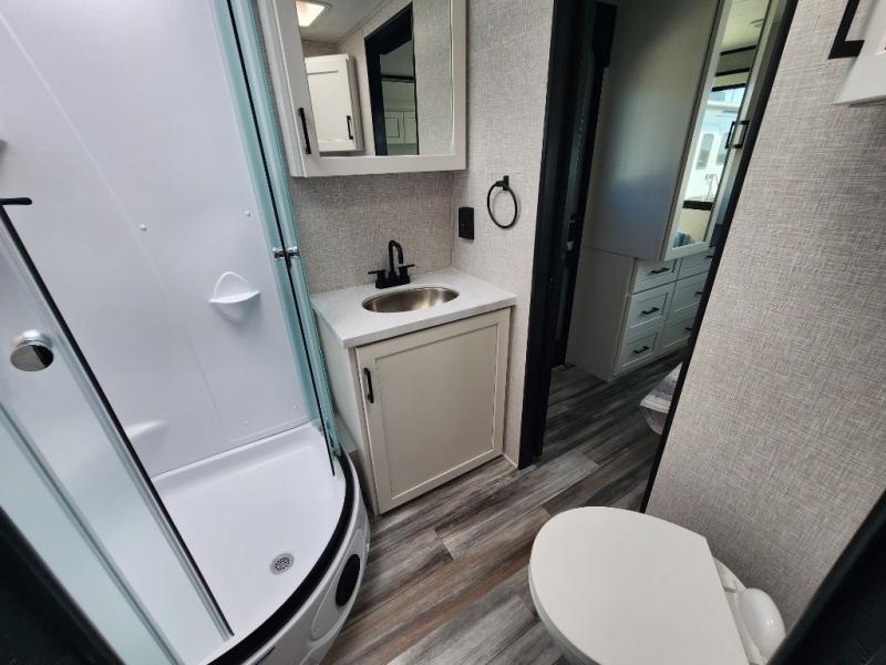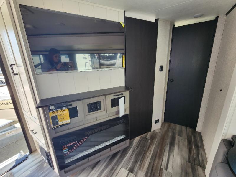 This front kitchen travel trailer will be perfect for camping trips to the lake or woods! The chef will appreciate ample counter space to prep meals plus an 11 cu. ft. 12V refrigerator to store leftovers, the front kitchen also has overhead cabinets and a pantry for storing your snacks and dry goods without worrying about space. Your crew can dine at the booth dinette, then play a game after dinner is cleaned up, this also works as a sleeping space if needed. There is also a theater seat across from the entertainment center with an LED Smart TV to make it a movie night. The bathroom has two entry doors for comfort and easy access along with a radial shower and medicine cabinet. A rear private bedroom is sure to make you feel right at home with a 60" x 80" queen bed, dual wardrobes, and a dresser to keep your things organized. You'll also find one of the dual entry doors here for convenience!