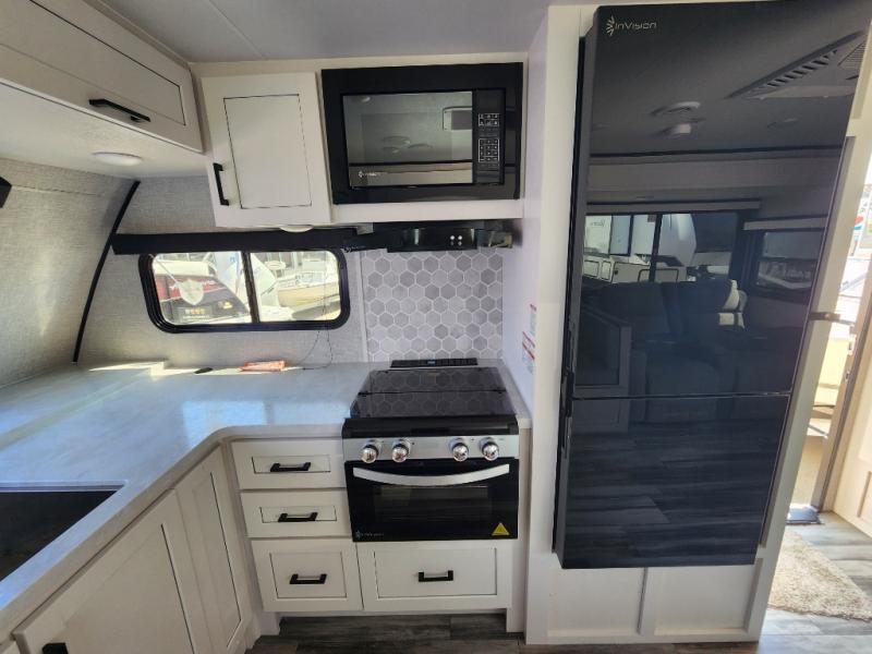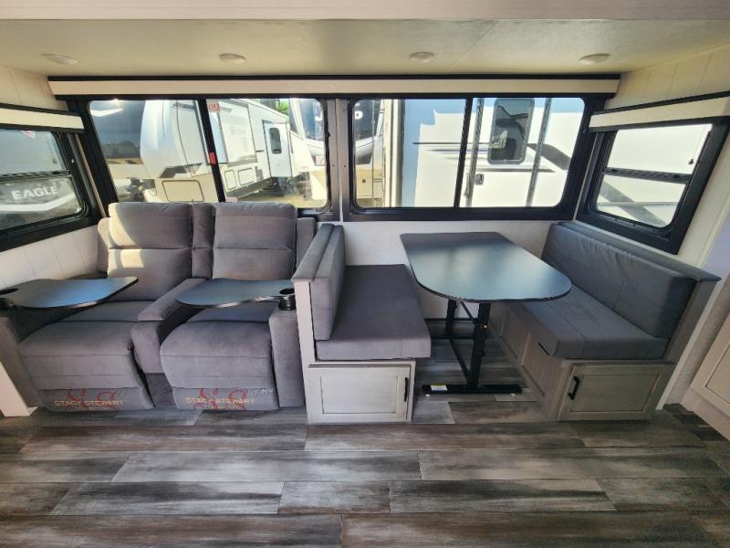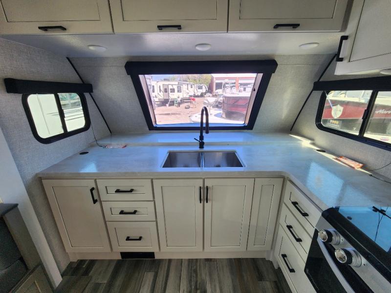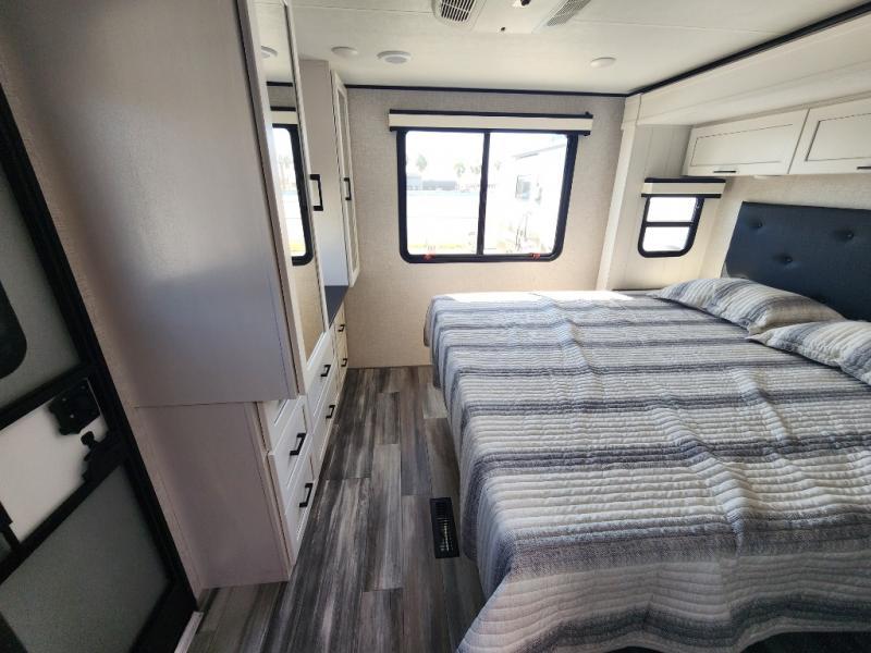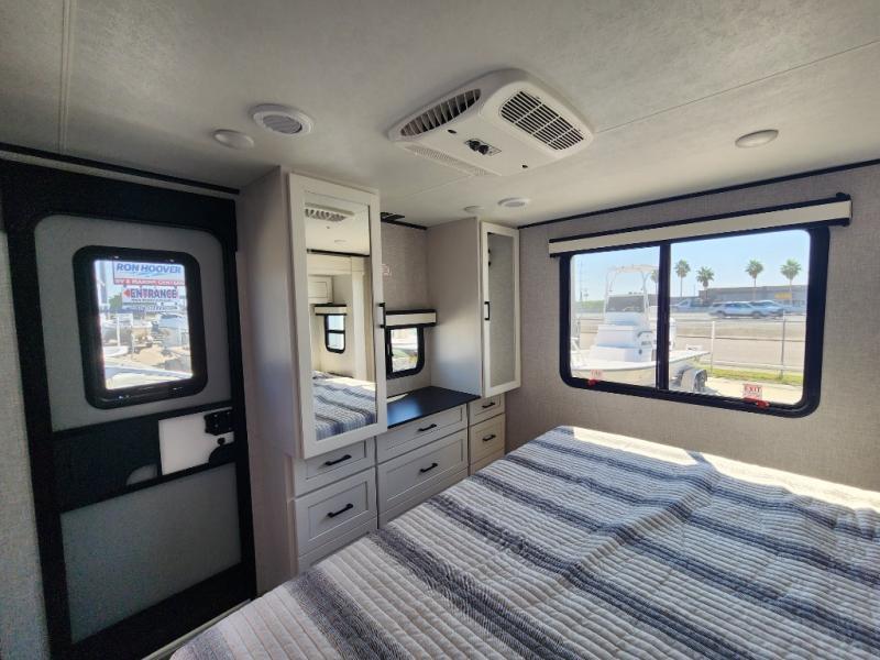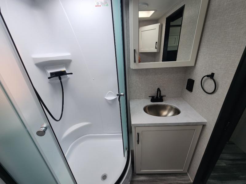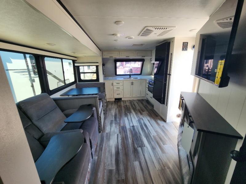 This front kitchen travel trailer will be perfect for camping trips to the lake or woods! The chef will appreciate ample counter space to prep meals plus an 11 cu. ft. 12V refrigerator to store leftovers, the front kitchen also has overhead cabinets and a pantry for storing your snacks and dry goods without worrying about space. Your crew can dine at the booth dinette, then play a game after dinner is cleaned up, this also works as a sleeping space if needed. There is also a theater seat across from the entertainment center with an LED Smart TV to make it a movie night. The bathroom has two entry doors for comfort and easy access along with a radial shower and medicine cabinet. A rear private bedroom is sure to make you feel right at home with a 60" x 80" queen bed, dual wardrobes, and a dresser to keep your things organized. You'll also find one of the dual entry doors here for convenience!