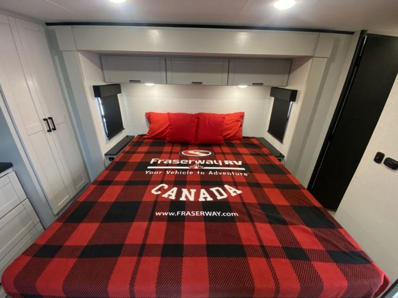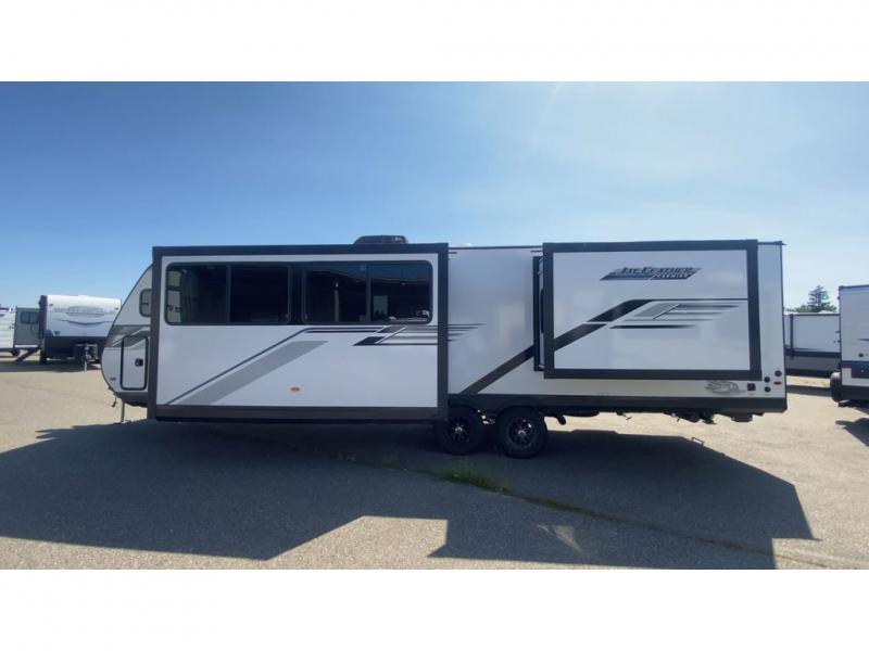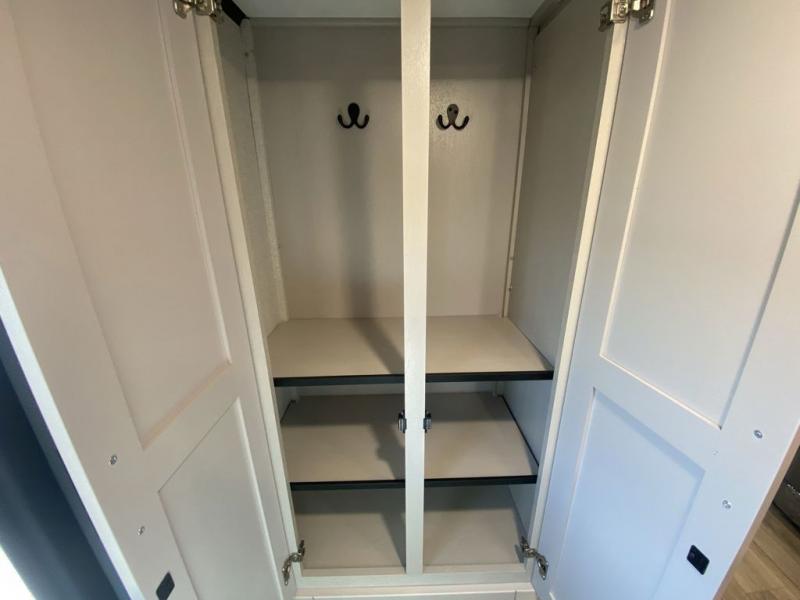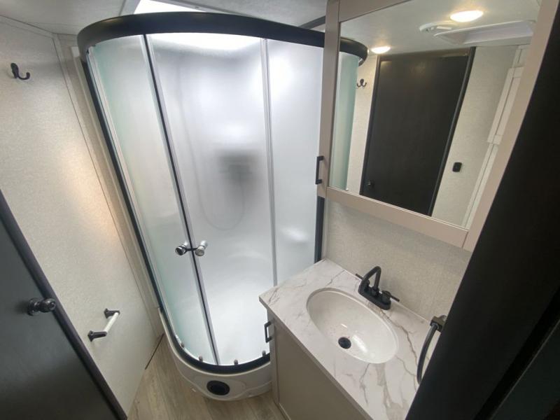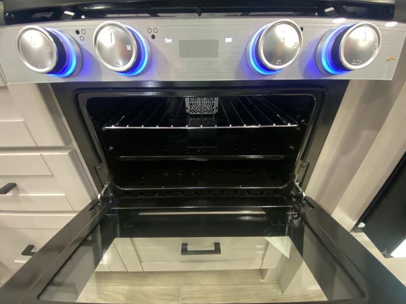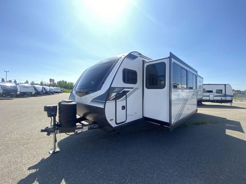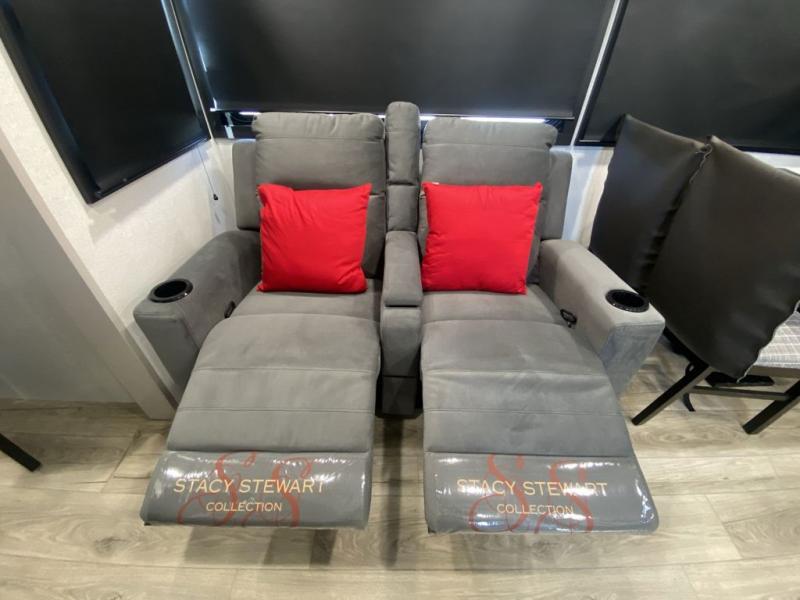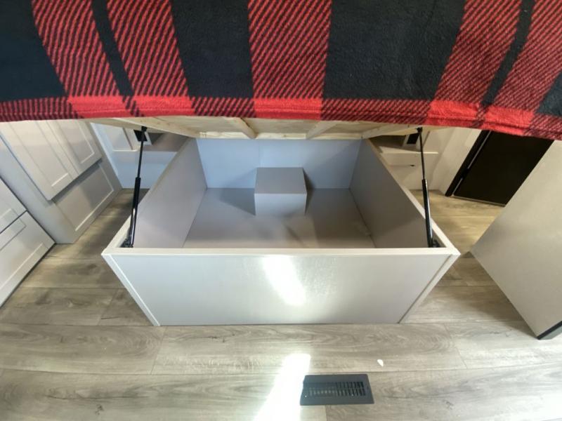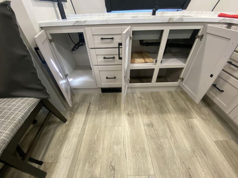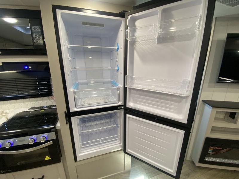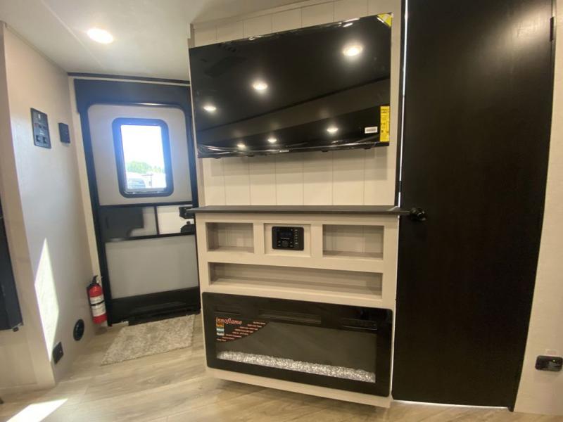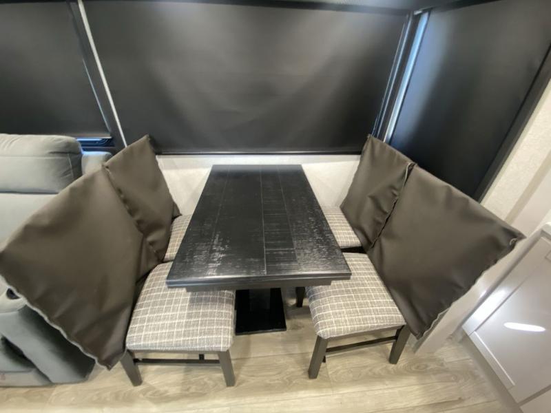 This front kitchen travel trailer will be perfect for camping trips to the lake or woods! The chef will appreciate ample counter space to prep meals plus an 11 cu. ft. 12V refrigerator to store leftovers. Your crew can dine at the table and chairs dinette, then play a game after dinner is cleaned up. There is also a theater seat across from the entertainment center with an LED Smart TV to make it a movie night. A rear private bedroom is sure to make you feel right at home with a king bed, dual wardrobes, and a dresser to keep your things organized. You'll also find one of the dual entry doors here for convenience!