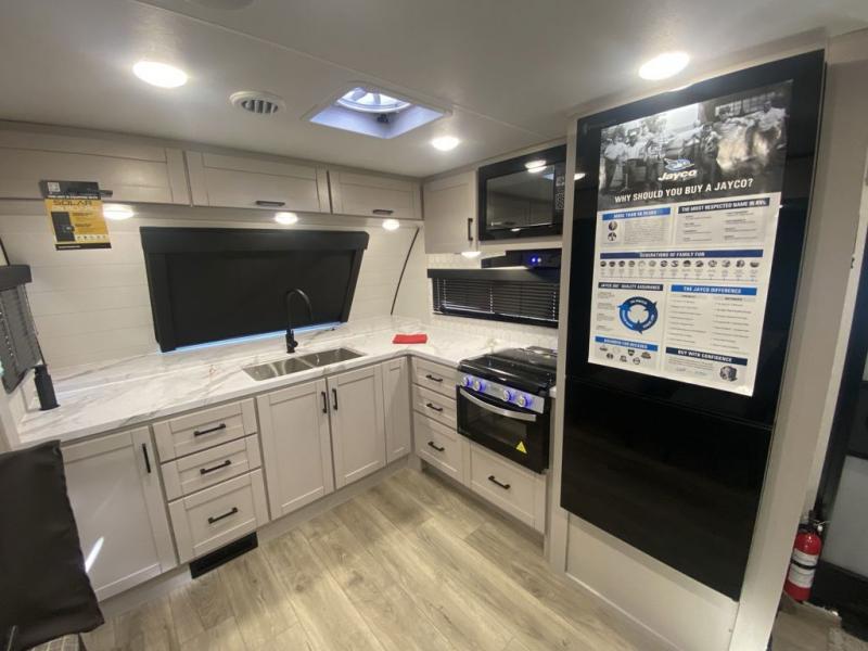 With any Jay Feather travel trailer by Jayco, you will enjoy lightweight towing, convenient exterior amenities, and at-home comforts inside! The Overlander 1 Solar Package included within the Jay Sport Package comes with a 200W solar panel and a 30-amp digital controller so you can enjoy some off-grid camping. There is also a modern graphics package with a dual-colored sidewall, LCI Solid Step fold-down aluminum tread steps on the main entry door, and Climate Shield 0 -100° F tested weather insulation package that will allow you to camp in all sorts of climates. The Customer Value Package will make time outdoors easier than ever with a power tongue jack and a Rock Solid stabilizer system, plus American-made nitro-filled Goodyear tires with self-adjusting electric brakes. More exterior features include a Keyed-Alike locking system, marine grade exterior speakers, a Magnum Truss roof system, and the list goes on! And we haven't even touched on the interior comforts, like the residential style seamless countertops and vinyl flooring throughout, decorative backsplash, handcrafted hardwood door/drawer fronts, and multiple USB charging ports to keep you going!