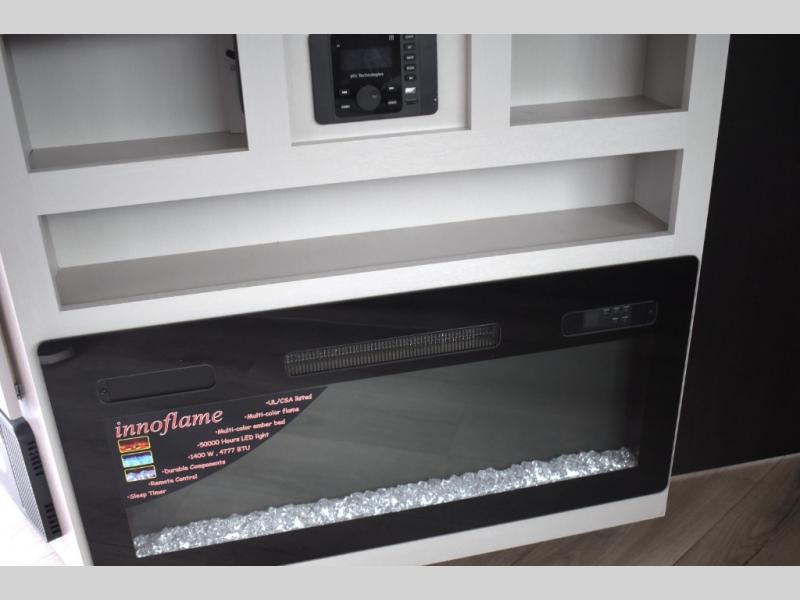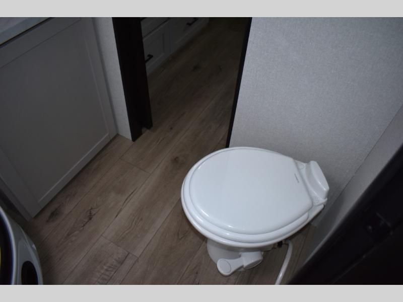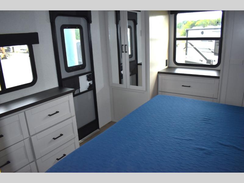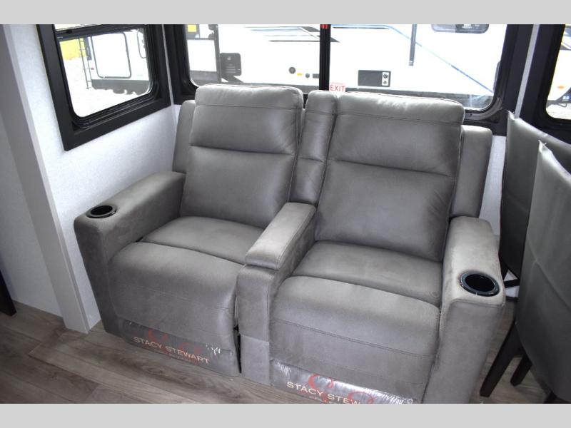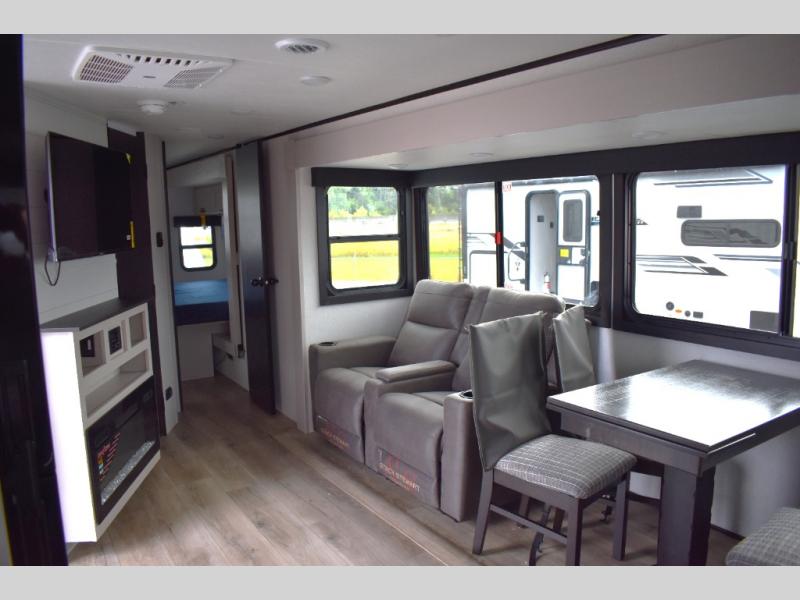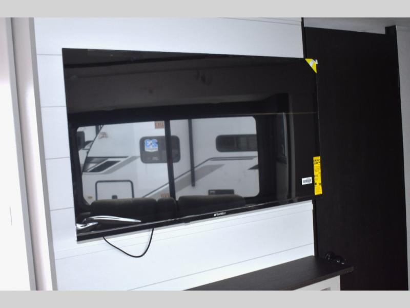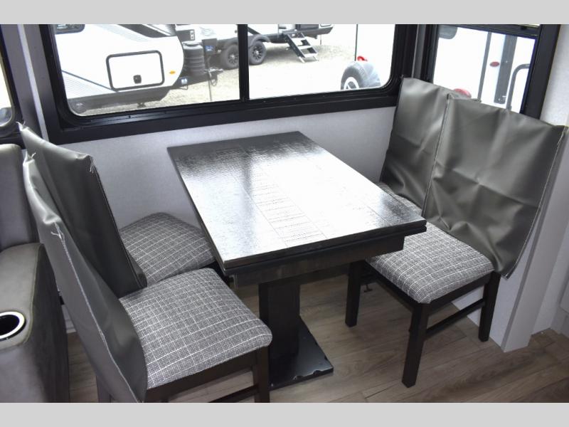 This front kitchen travel trailer will be perfect for camping trips to the lake or woods! The chef will appreciate ample counter space to prep meals plus an 11 cu. ft. 12V refrigerator to store leftovers. Your crew can dine at the booth dinette, then play a game after dinner is cleaned up. There is also a theater seat across from the entertainment center with an LED Smart TV to make it a movie night. A rear private bedroom is sure to make you feel right at home with a queen bed, dual wardrobes, and a dresser to keep your things organized. You'll also find one of the dual entry doors here for convenience!