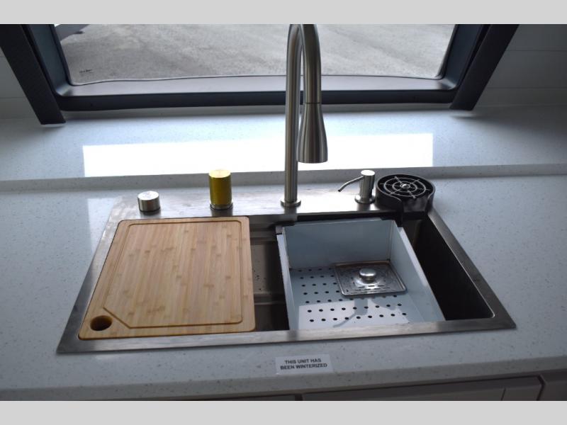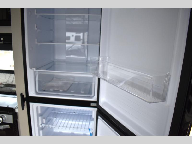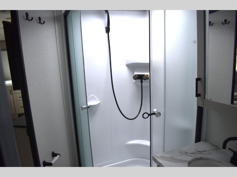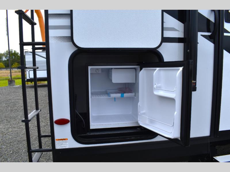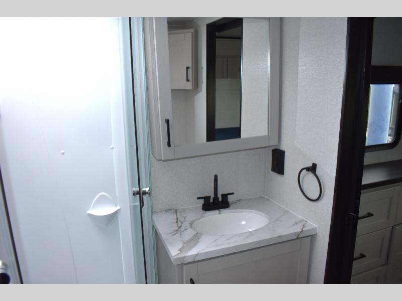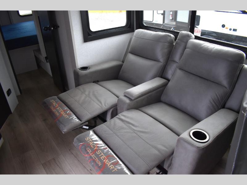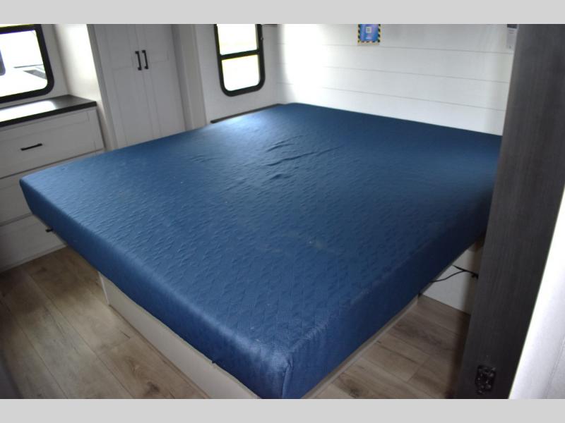 This front kitchen travel trailer will be perfect for camping trips to the lake or woods! The chef will appreciate ample counter space to prep meals plus an 11 cu. ft. 12V refrigerator to store leftovers. Your crew can dine at the booth dinette, then play a game after dinner is cleaned up. There is also a theater seat across from the entertainment center with an LED Smart TV to make it a movie night. A rear private bedroom is sure to make you feel right at home with a queen bed, dual wardrobes, and a dresser to keep your things organized. You'll also find one of the dual entry doors here for convenience!