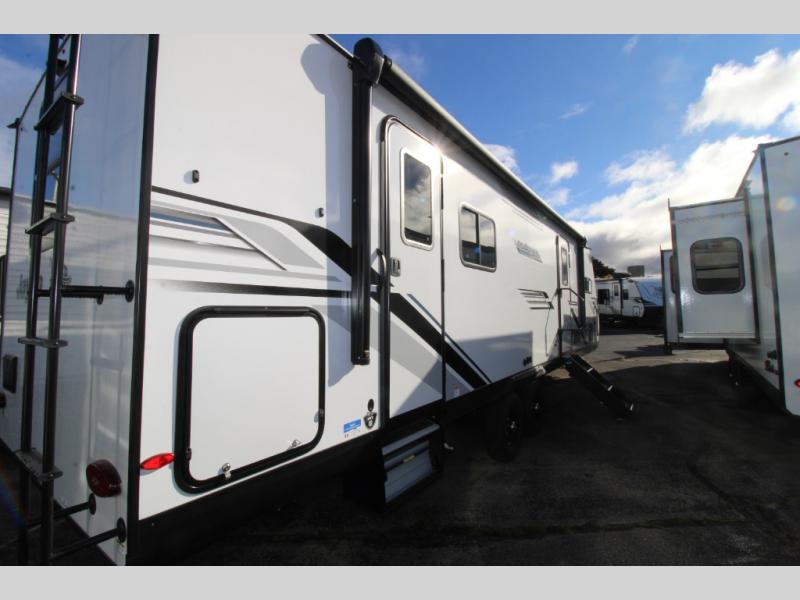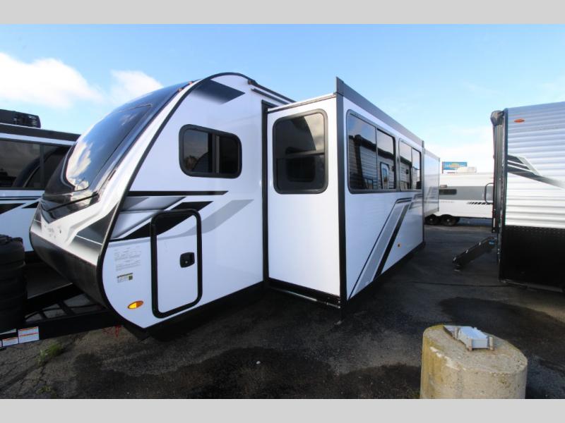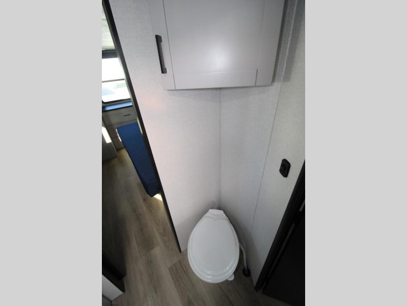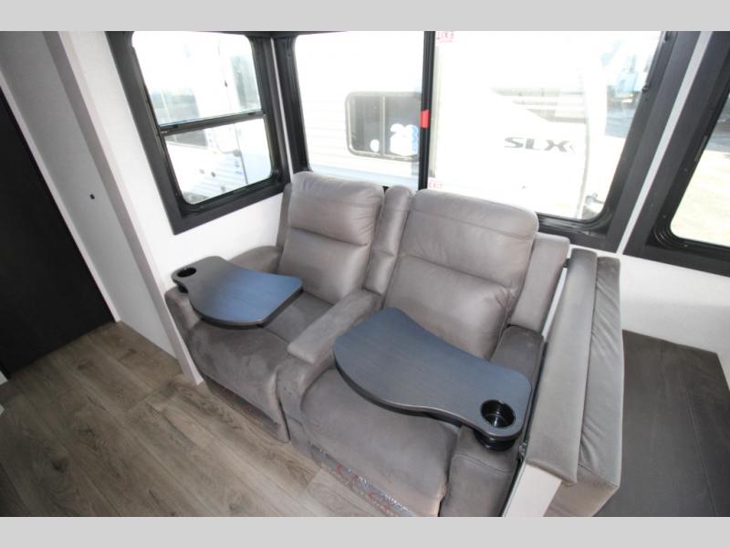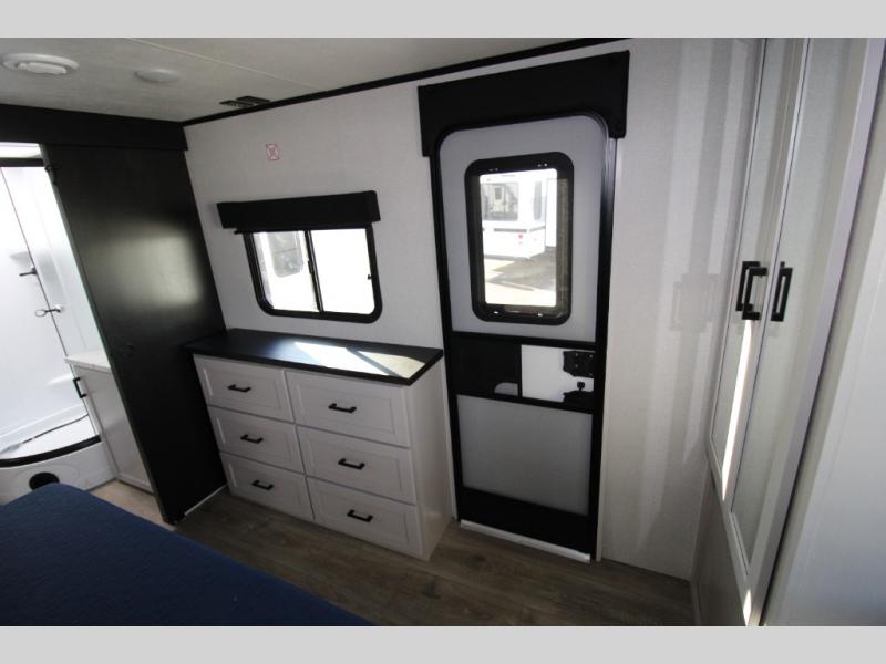 This front kitchen travel trailer will be perfect for camping trips to the lake or woods! The chef will appreciate ample counter space to prep meals plus an 11 cu. ft. 12V refrigerator to store leftovers. Your crew can dine at the booth dinette, then play a game after dinner is cleaned up. There is also a theater seat across from the entertainment center with an LED Smart TV to make it a movie night. A rear private bedroom is sure to make you feel right at home with a queen bed, dual wardrobes, and a dresser to keep your things organized. You'll also find one of the dual entry doors here for convenience!