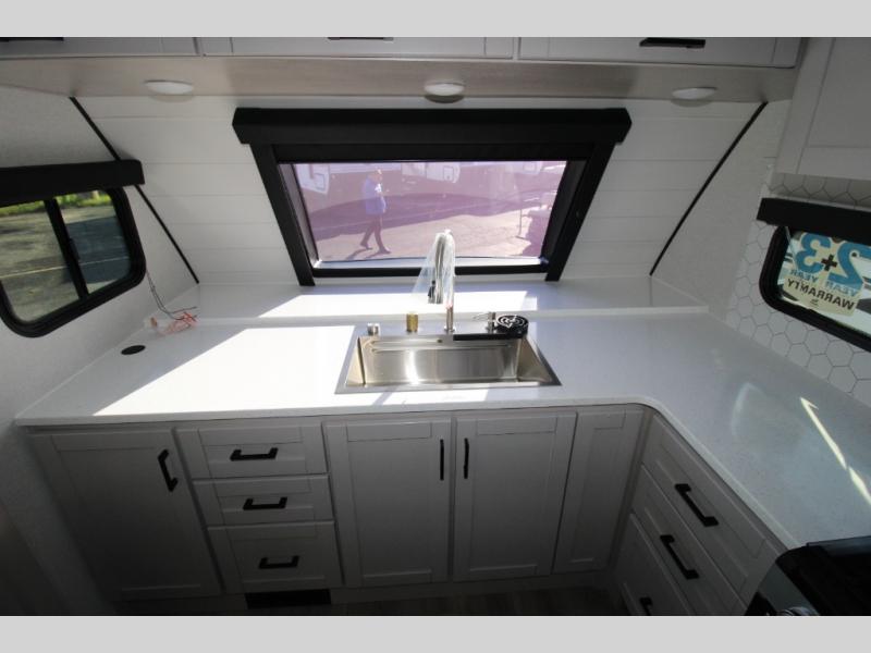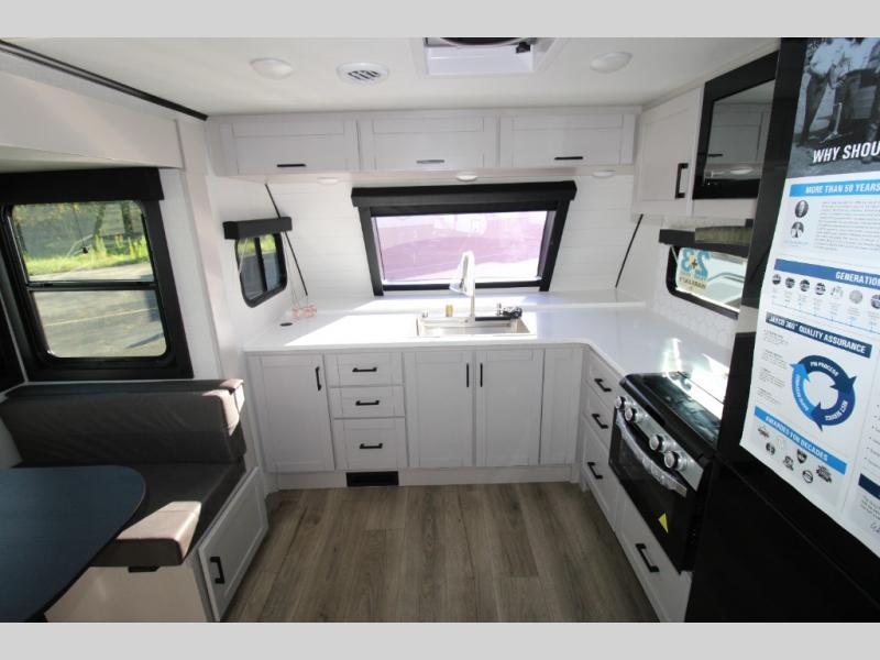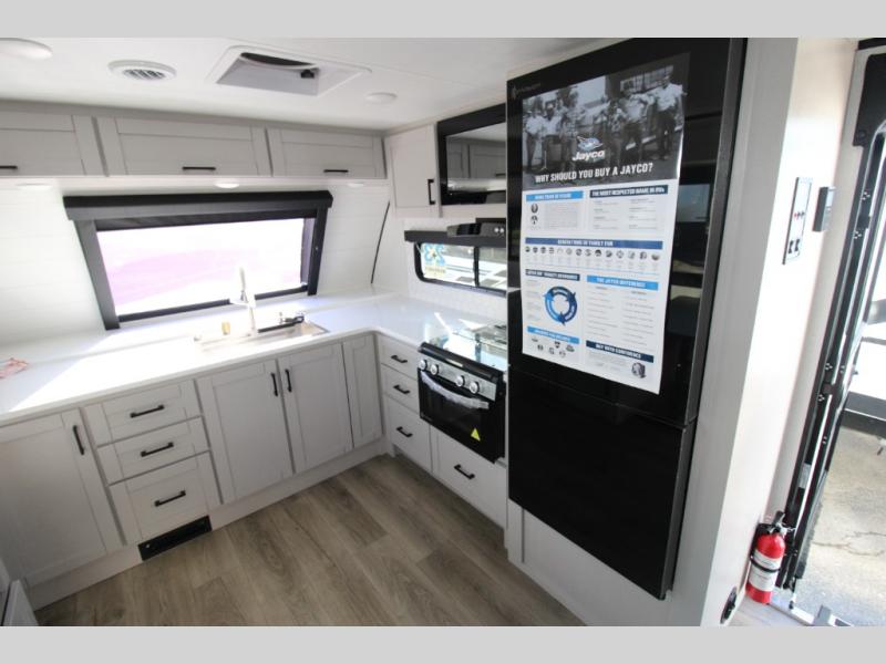 With any Jay Feather travel trailer by Jayco, you will enjoy lightweight towing, convenient exterior amenities, and at-home comforts inside! The Overlander 1 Solar Package included within the Jay Sport Package comes with a 200W solar panel and a 30-amp digital controller so you can enjoy some off-grid camping. There is also a modern graphics package with a dual-colored sidewall, LCI Solid Step fold-down aluminum tread steps on the main entry door, and Climate Shield 0 -100° F tested weather insulation package that will allow you to camp in all sorts of climates. The Customer Value Package will make time outdoors easier than ever with a power tongue jack and a Rock Solid stabilizer system, plus American-made nitro-filled Goodyear tires with self-adjusting electric brakes. More exterior features include a Keyed-Alike locking system, marine grade exterior speakers, a Magnum Truss roof system, and the list goes on! And we haven't even touched on the interior comforts, like the residential style seamless countertops and vinyl flooring throughout, decorative backsplash, handcrafted hardwood door/drawer fronts, and multiple USB charging ports to keep you going!