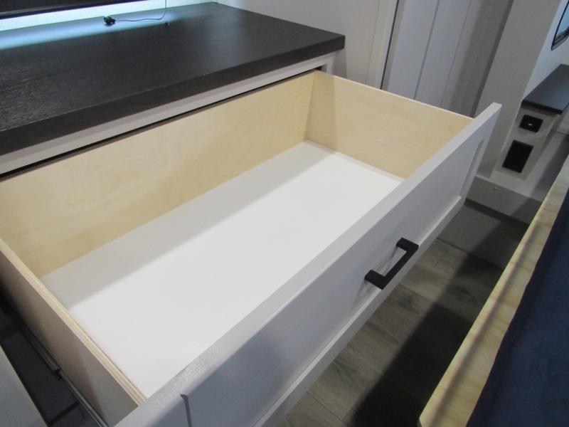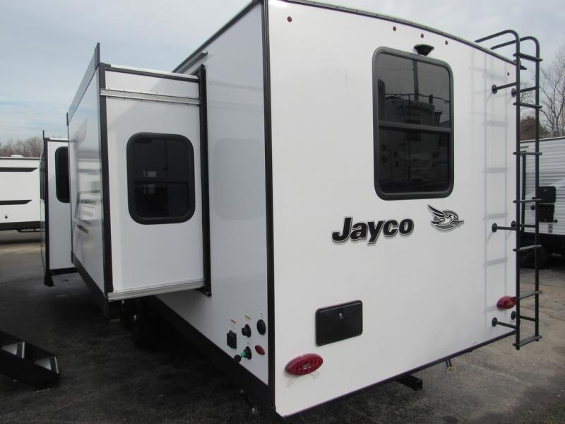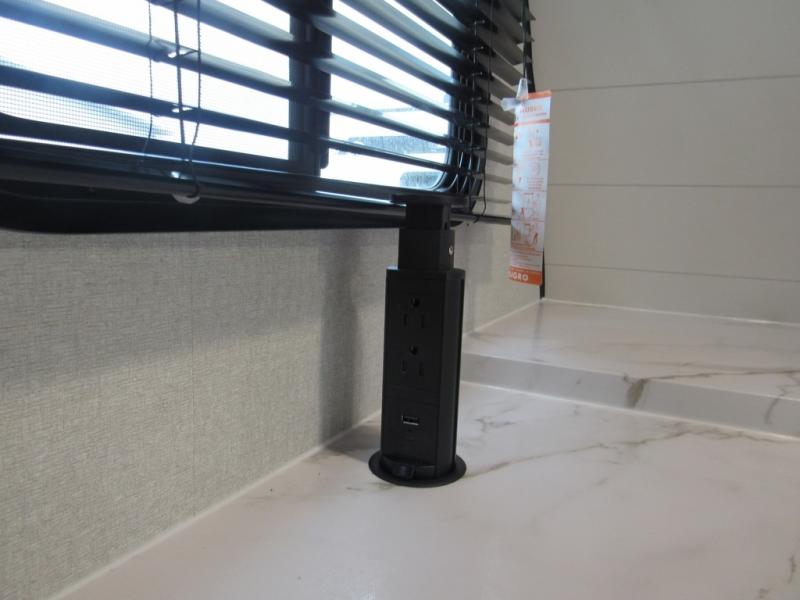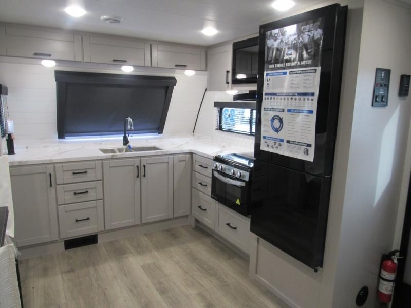 With any Jay Feather travel trailer by Jayco, you will enjoy lightweight towing, convenient exterior amenities, and at-home comforts inside! The Overlander 1 Solar Package included within the Jay Sport Package comes with a 200W solar panel and a 30-amp digital controller so you can enjoy some off-grid camping. There is also a modern graphics package with a dual-colored sidewall, LCI Solid Step fold-down aluminum tread steps on the main entry door, and Climate Shield 0 -100° F tested weather insulation package that will allow you to camp in all sorts of climates. The Customer Value Package will make time outdoors easier than ever with a power tongue jack and a Rock Solid stabilizer system, plus American-made nitro-filled Goodyear tires with self-adjusting electric brakes. More exterior features include a Keyed-Alike locking system, marine grade exterior speakers, a Magnum Truss roof system, and the list goes on! And we haven't even touched on the interior comforts, like the residential style seamless countertops and vinyl flooring throughout, decorative backsplash, handcrafted hardwood door/drawer fronts, and multiple USB charging ports to keep you going!