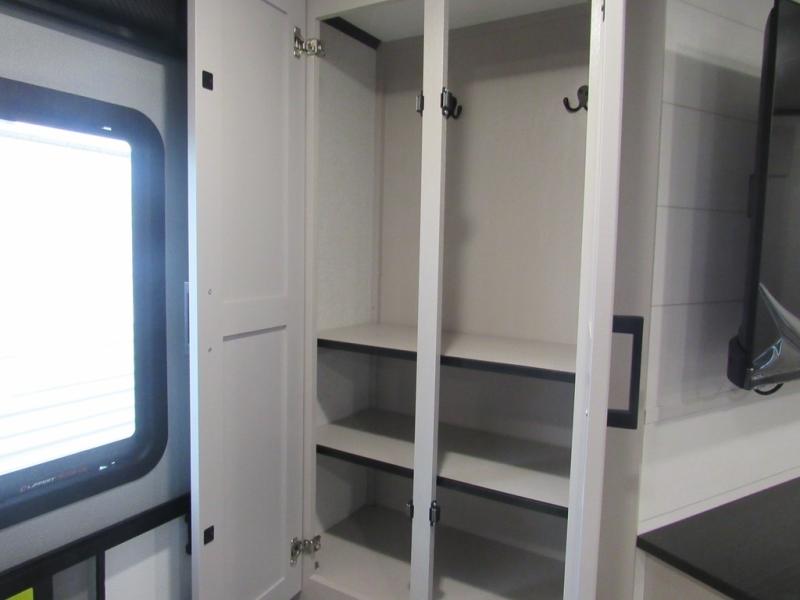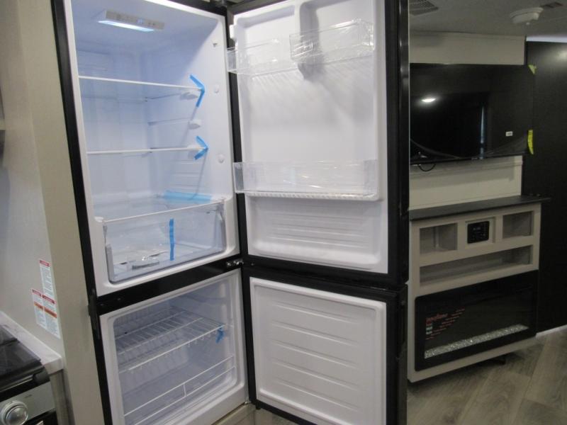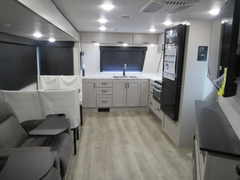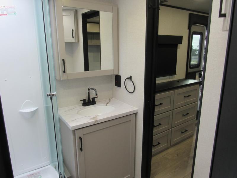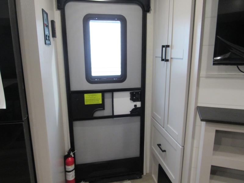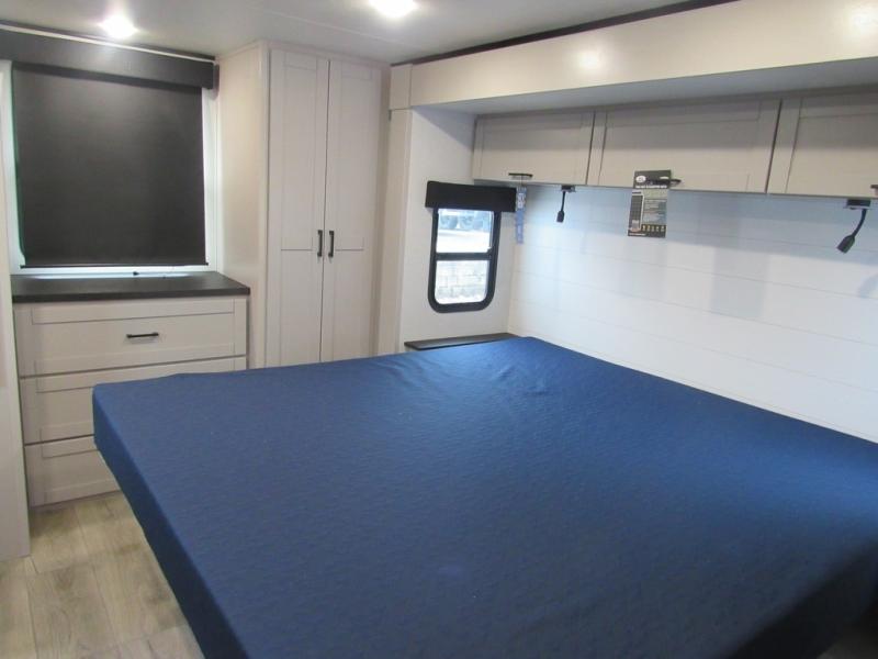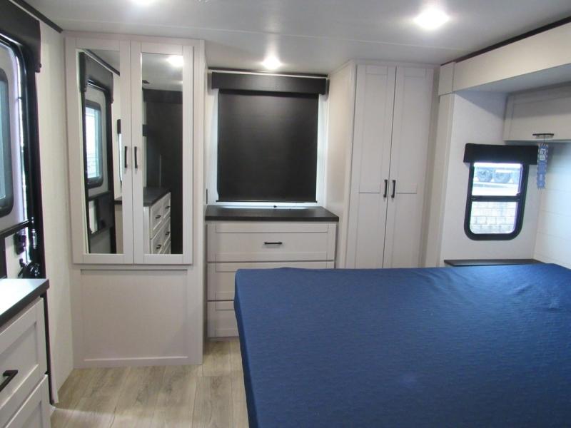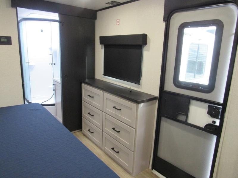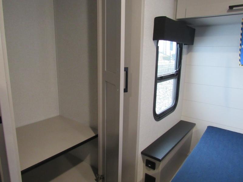 This front kitchen travel trailer will be perfect for camping trips to the lake or woods! The chef will appreciate ample counter space to prep meals plus an 11 cu. ft. 12V refrigerator to store leftovers. Your crew can dine at the booth dinette, then play a game after dinner is cleaned up. There is also a theater seat across from the entertainment center with an LED Smart TV to make it a movie night. A rear private bedroom is sure to make you feel right at home with a queen bed, dual wardrobes, and a dresser to keep your things organized. You'll also find one of the dual entry doors here for convenience!