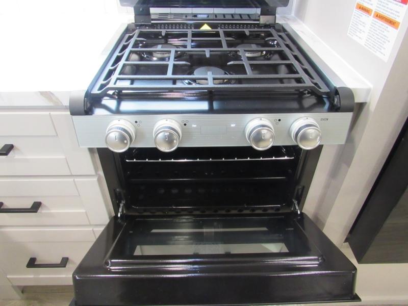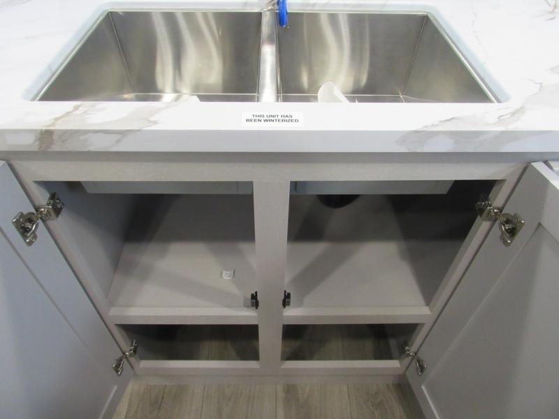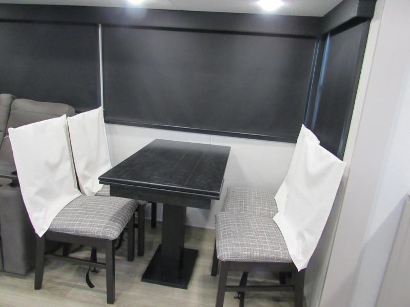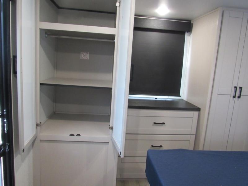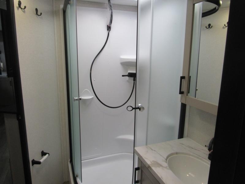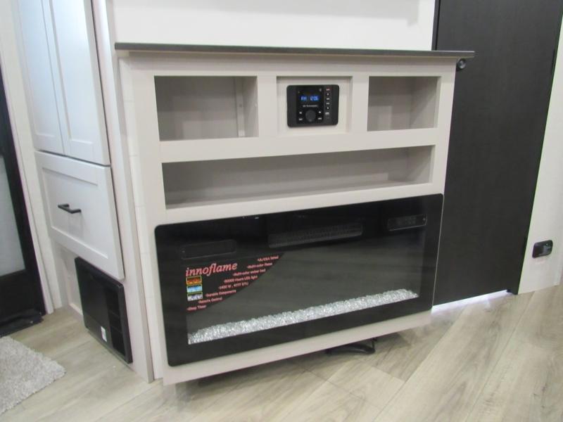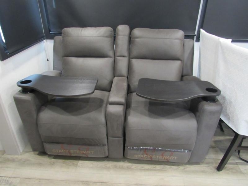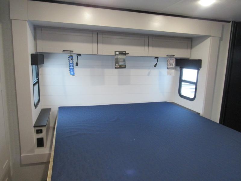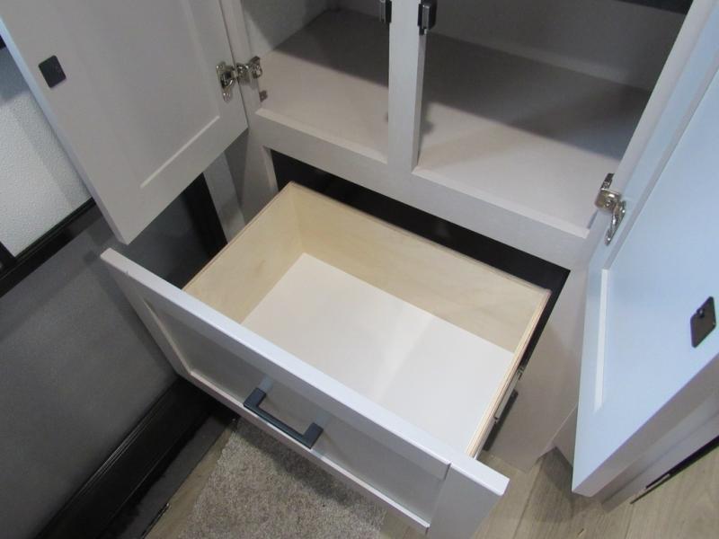 This front kitchen travel trailer will be perfect for camping trips to the lake or woods! The chef will appreciate ample counter space to prep meals plus an 11 cu. ft. 12V refrigerator to store leftovers. Your crew can dine at the booth dinette, then play a game after dinner is cleaned up. There is also a theater seat across from the entertainment center with an LED Smart TV to make it a movie night. A rear private bedroom is sure to make you feel right at home with a queen bed, dual wardrobes, and a dresser to keep your things organized. You'll also find one of the dual entry doors here for convenience!