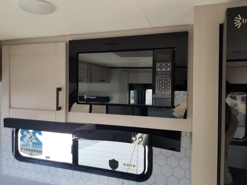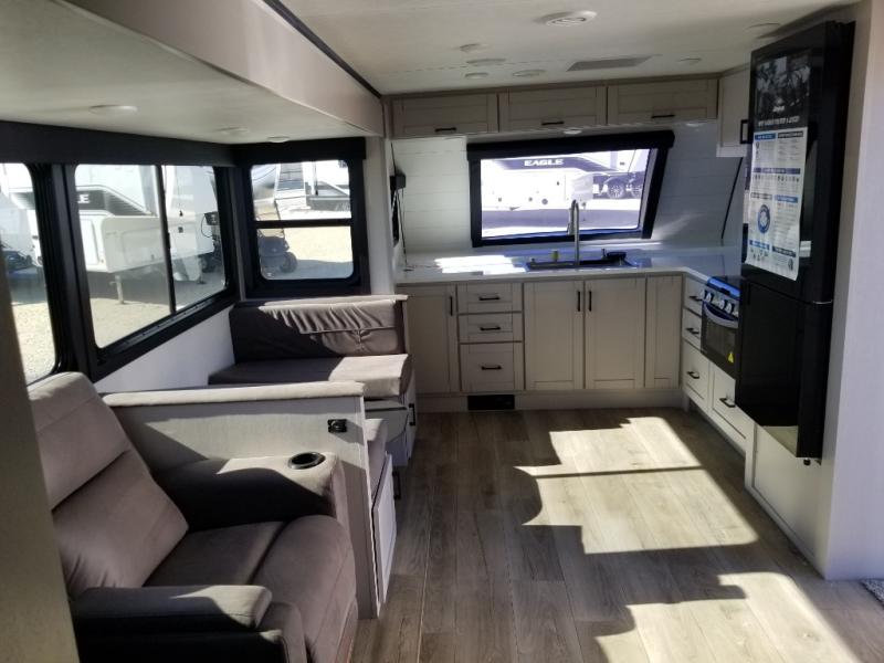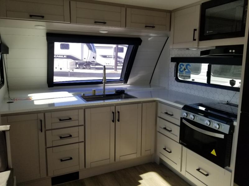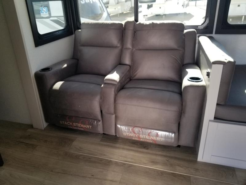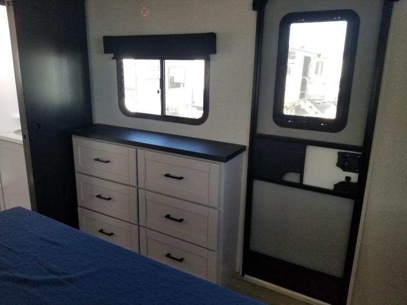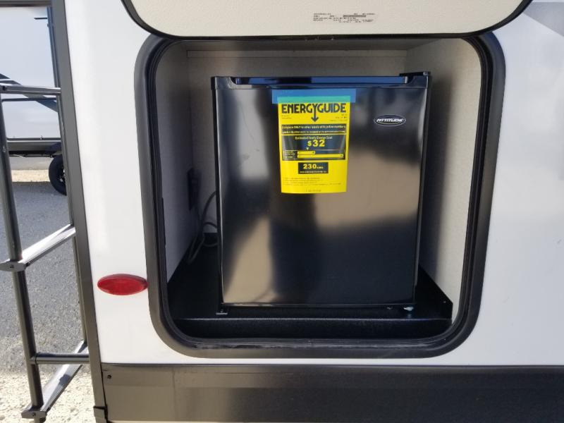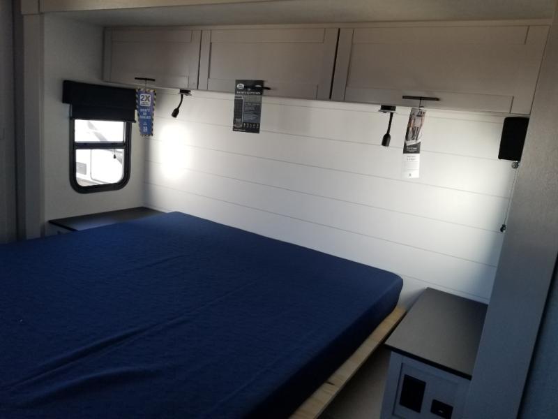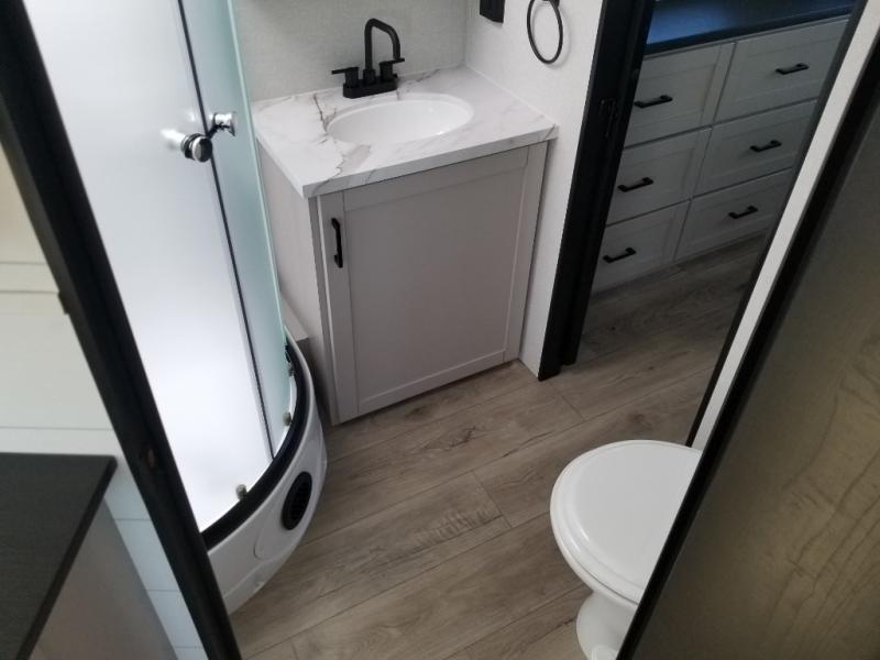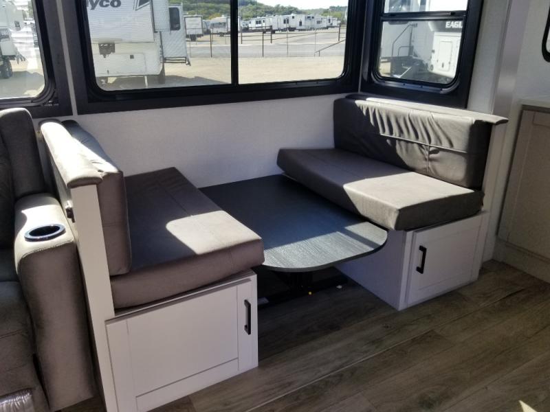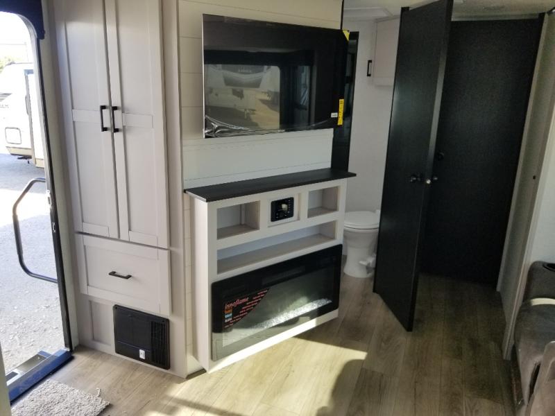 This front kitchen travel trailer will be perfect for camping trips to the lake or woods! The chef will appreciate ample counter space to prep meals plus an 11 cu. ft. 12V refrigerator to store leftovers, the front kitchen also has overhead cabinets and a pantry for storing your snacks and dry goods without worrying about space. Your crew can dine at the booth dinette, then play a game after dinner is cleaned up, this also works as a sleeping space if needed. There is also a theater seat across from the entertainment center with an LED Smart TV to make it a movie night. The bathroom has two entry doors for comfort and easy access along with a radial shower and medicine cabinet. A rear private bedroom is sure to make you feel right at home with a 60" x 80" queen bed, dual wardrobes, and a dresser to keep your things organized. You'll also find one of the dual entry doors here for convenience!