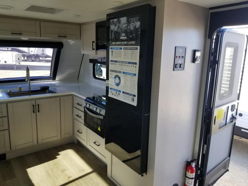 With any Jay Feather travel trailer by Jayco, you will enjoy lightweight towing, convenient exterior amenities, and at-home comforts inside! The Overlander 1 Solar Package included within the Jay Sport Package comes with a 200W solar panel and a 30-amp digital controller so you can enjoy some off-grid camping. There is also a modern graphics package, Solid fold-down step with aluminum tread steps on the main entry doorstep, and Climate Shield 0 -100° F tested weather insulation package that will allow you to camp in various types of climates. The Customer Value Package will make time outdoors easier than ever with a power tongue jack and Automotive-style aluminum rims, plus radial tires with self-adjusting electric brakes. More exterior features include a Keyed-Alike doors, a Magnum Truss roof system, and the list goes on! And we haven't even touched on the interior comforts, like the seamless countertops and Residential vinyl flooring throughout, decorative kitchen backsplash, handcrafted hardwood door/drawer fronts, and multiple USB charging ports to keep you going!