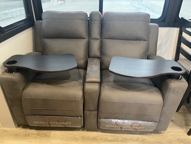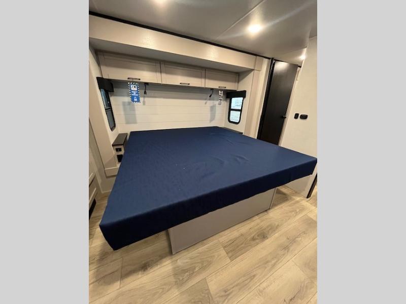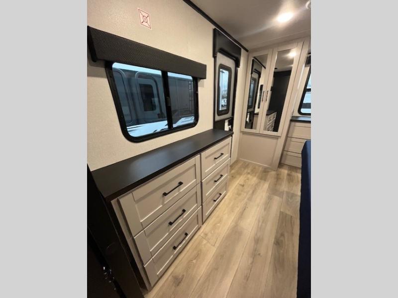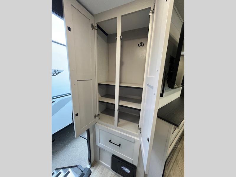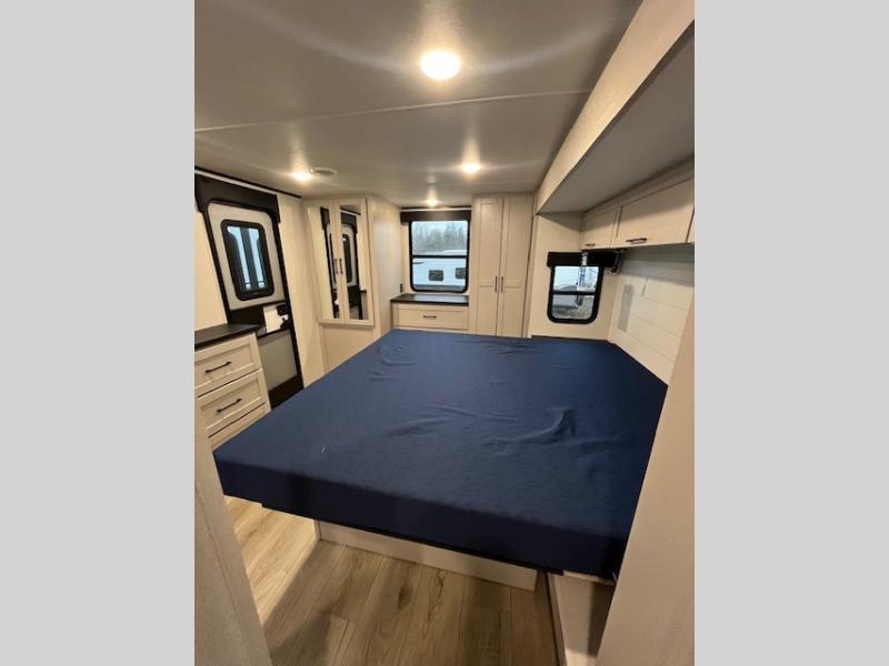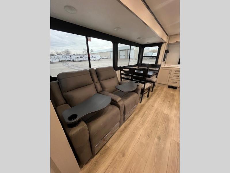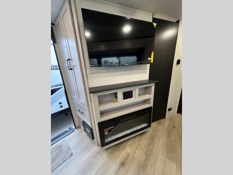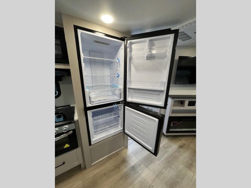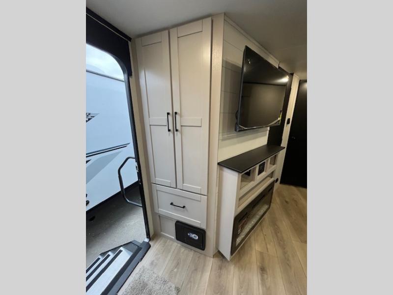This front kitchen travel trailer will be perfect for camping trips to the lake or woods! The chef will appreciate ample counter space to prep meals plus an 11 cu. ft. 12V refrigerator to store leftovers, the front kitchen also has overhead cabinets and a pantry for storing your snacks and dry goods without worrying about space. Your crew can dine at the booth dinette, then play a game after dinner is cleaned up, this also works as a sleeping space if needed. There is also a theater seat across from the entertainment center with an LED Smart TV to make it a movie night. The bathroom has two entry doors for comfort and easy access along with a radial shower and medicine cabinet. A rear private bedroom is sure to make you feel right at home with a 60" x 80" queen bed, dual wardrobes, and a dresser to keep your things organized. You'll also find one of the dual entry doors here for convenience!