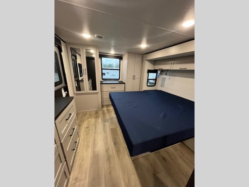 With any Jay Feather travel trailer by Jayco, you will enjoy lightweight towing, convenient exterior amenities, and at-home comforts inside! The Overlander 1 Solar Package included within the Jay Sport Package comes with a 200W solar panel and a 30-amp digital controller so you can enjoy some off-grid camping. There is also a modern graphics package, Solid fold-down step with aluminum tread steps on the main entry doorstep, and Climate Shield 0 -100° F tested weather insulation package that will allow you to camp in various types of climates. The Customer Value Package will make time outdoors easier than ever with a power tongue jack and Automotive-style aluminum rims, plus radial tires with self-adjusting electric brakes. More exterior features include a Keyed-Alike doors, a Magnum Truss roof system, and the list goes on! And we haven't even touched on the interior comforts, like the seamless countertops and Residential vinyl flooring throughout, decorative kitchen backsplash, handcrafted hardwood door/drawer fronts, and multiple USB charging ports to keep you going!