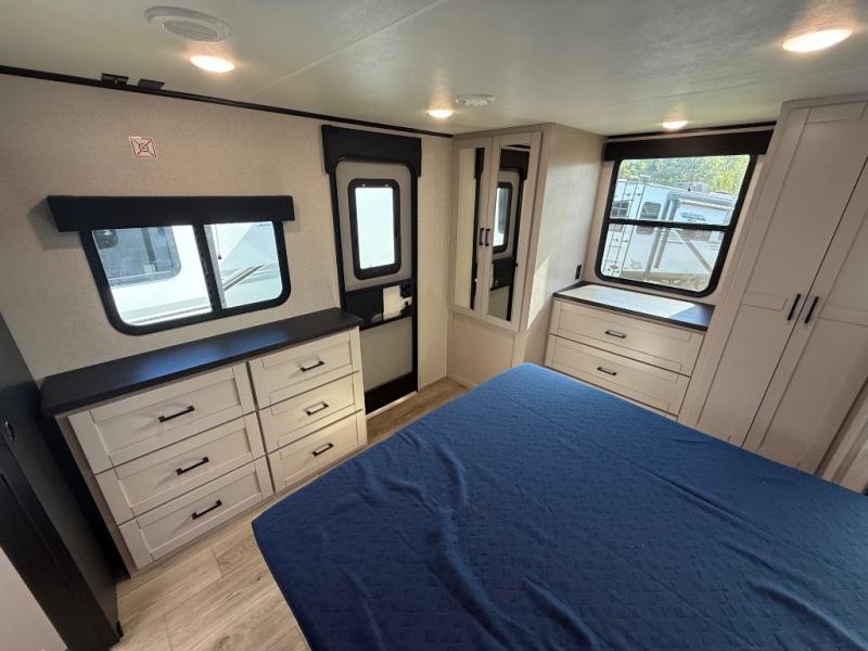 The 2026 Jay Feather 26FK is built for travelers who crave flexibility. With Jayco’s Overlander 1 Solar Package, featuring a 200W solar panel and 30-amp digital controller, you’re ready for off-grid escapes. The Climate Shield weather protection package ensures year-round comfort, while the Magnum Truss roof system, LCI Solid Step, and American-made Goodyear tires provide confidence on every road. Inside, enjoy handcrafted hardwood door fronts, seamless countertops, stylish vinyl flooring, and plenty of USB ports to keep your devices powered.