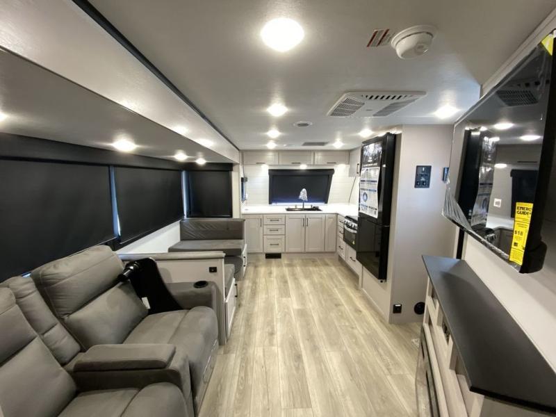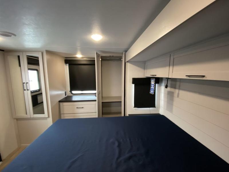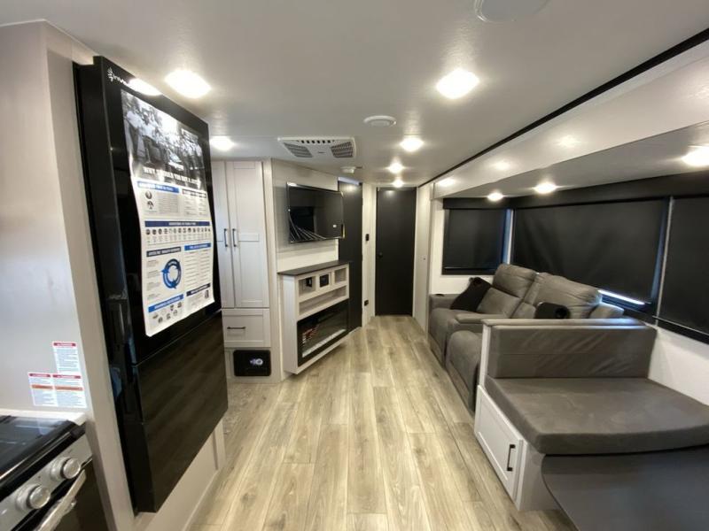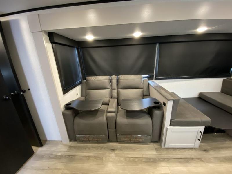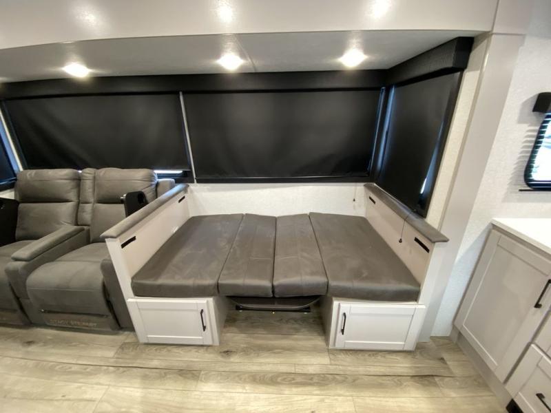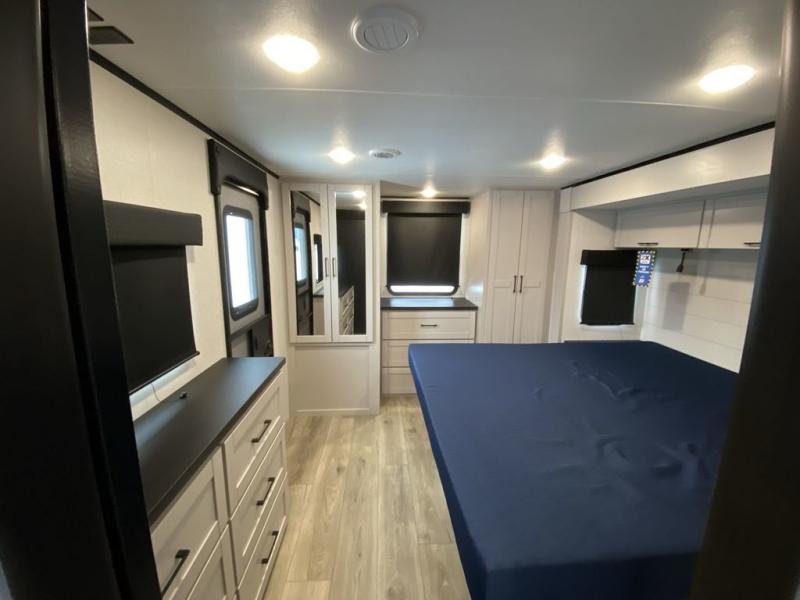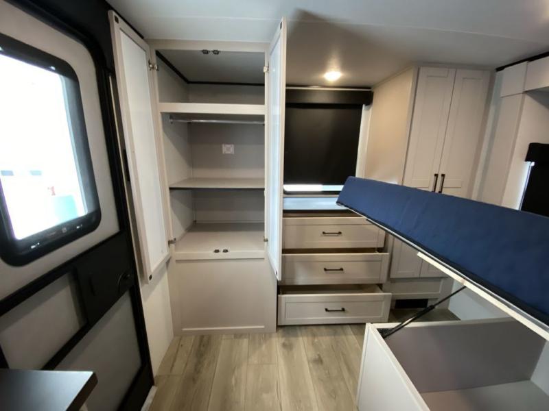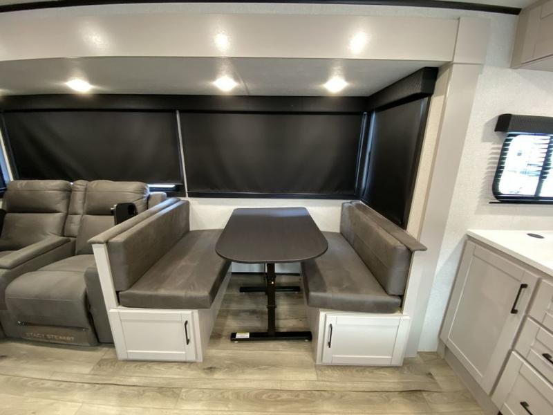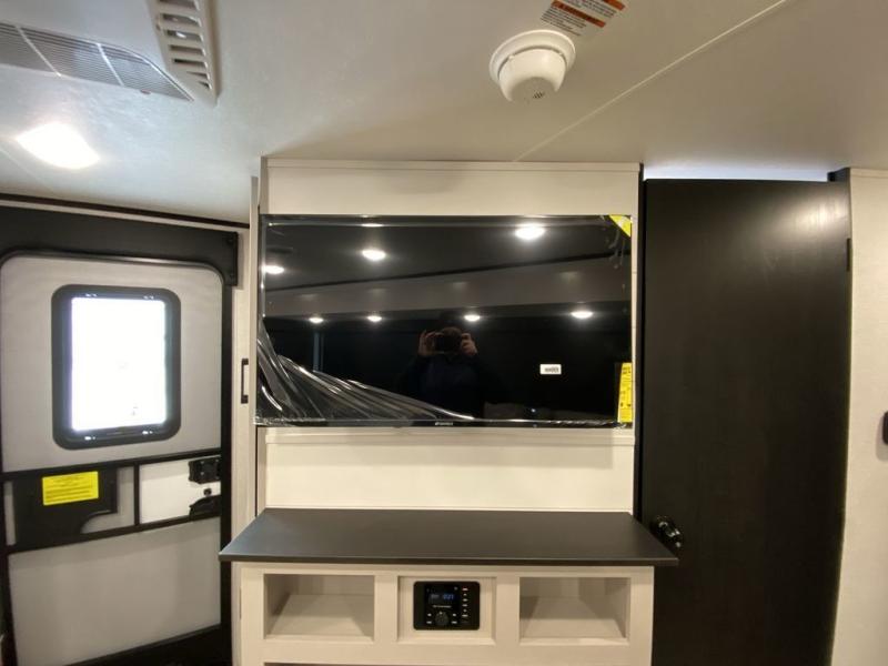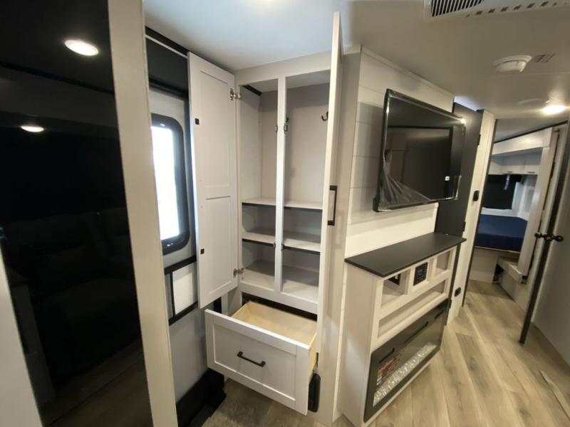 This front kitchen travel trailer will be perfect for camping trips to the lake or woods! The chef will appreciate ample counter space to prep meals plus an 11 cu. ft. 12V refrigerator to store leftovers, the front kitchen also has overhead cabinets and a pantry for storing your snacks and dry goods without worrying about space. Your crew can dine at the booth dinette, then play a game after dinner is cleaned up, this also works as a sleeping space if needed. There is also a theater seat across from the entertainment center with an LED Smart TV to make it a movie night. The bathroom has two entry doors for comfort and easy access along with a radial shower and medicine cabinet. A rear private bedroom is sure to make you feel right at home with a 60" x 80" queen bed, dual wardrobes, and a dresser to keep your things organized. You'll also find one of the dual entry doors here for convenience!