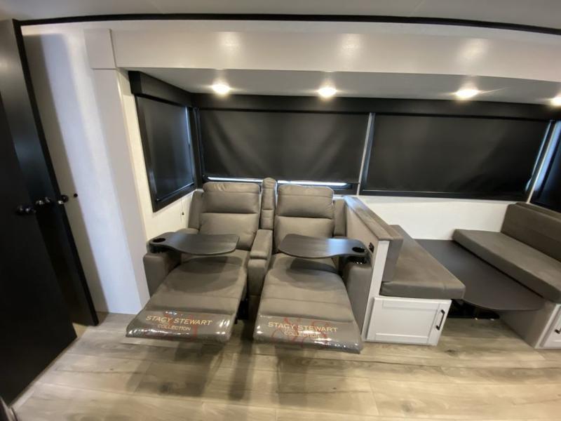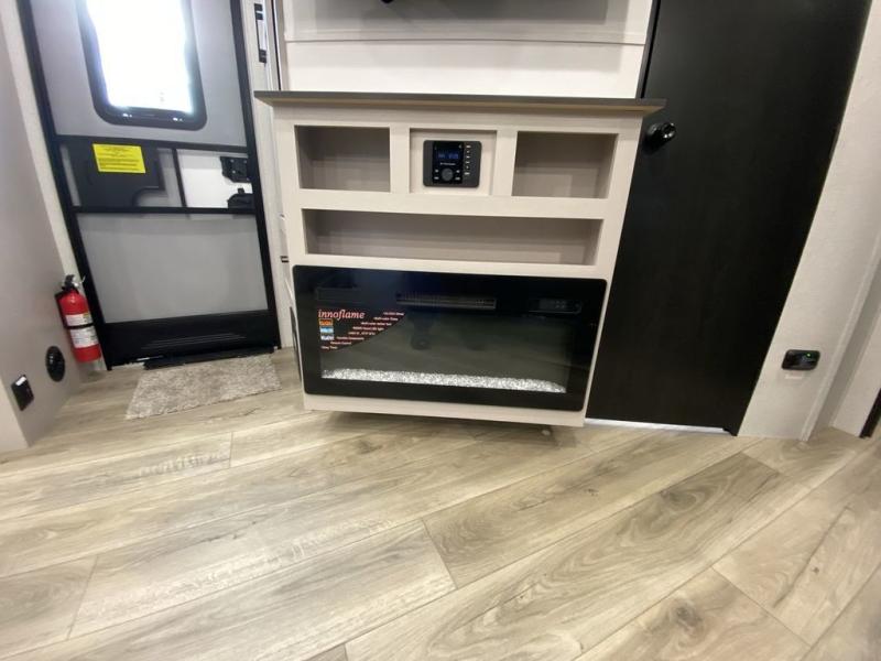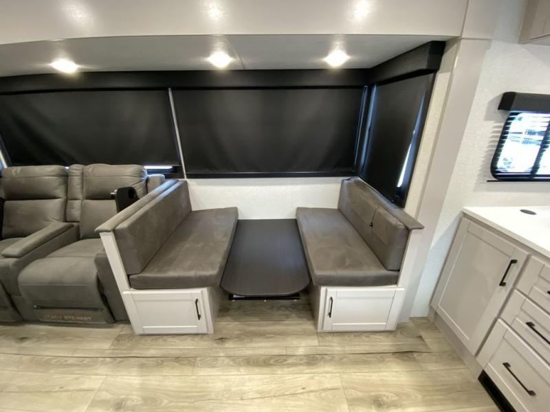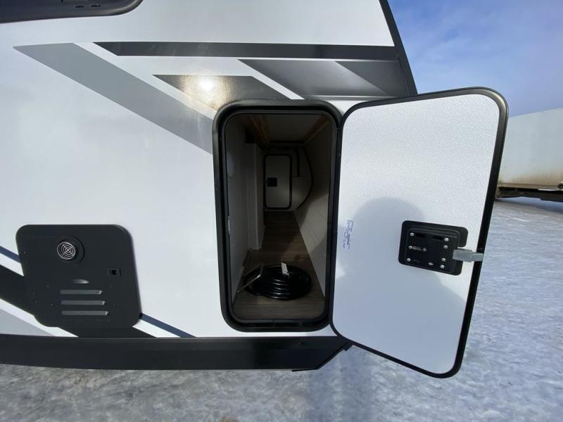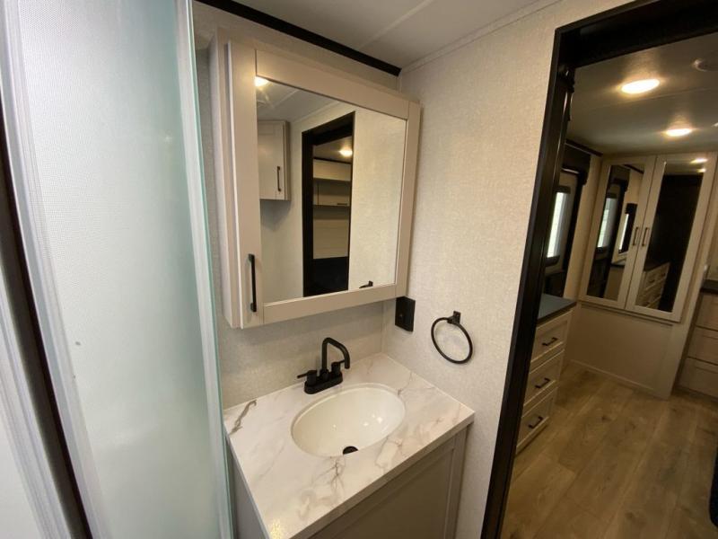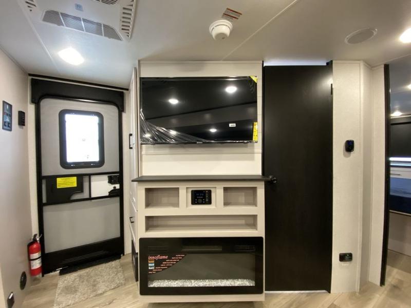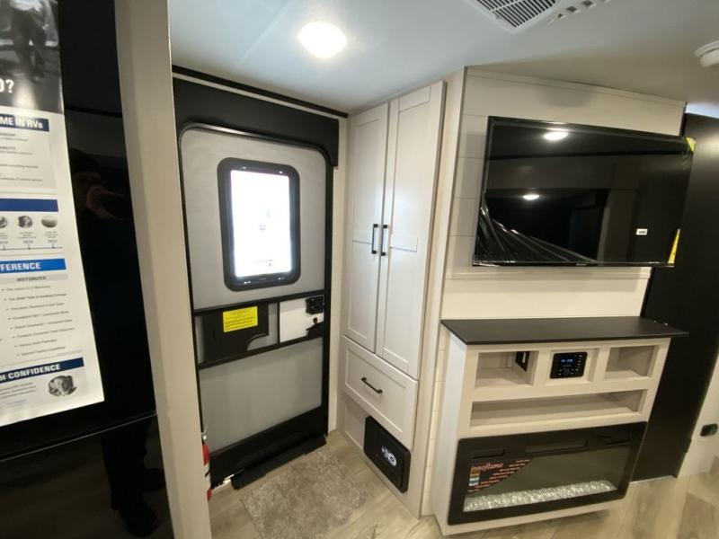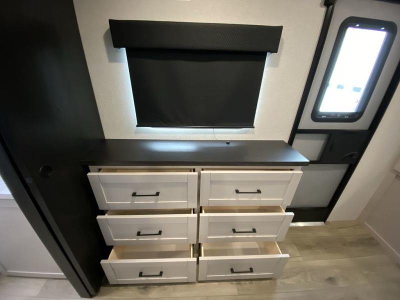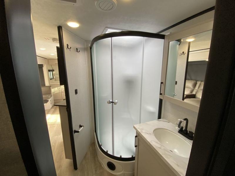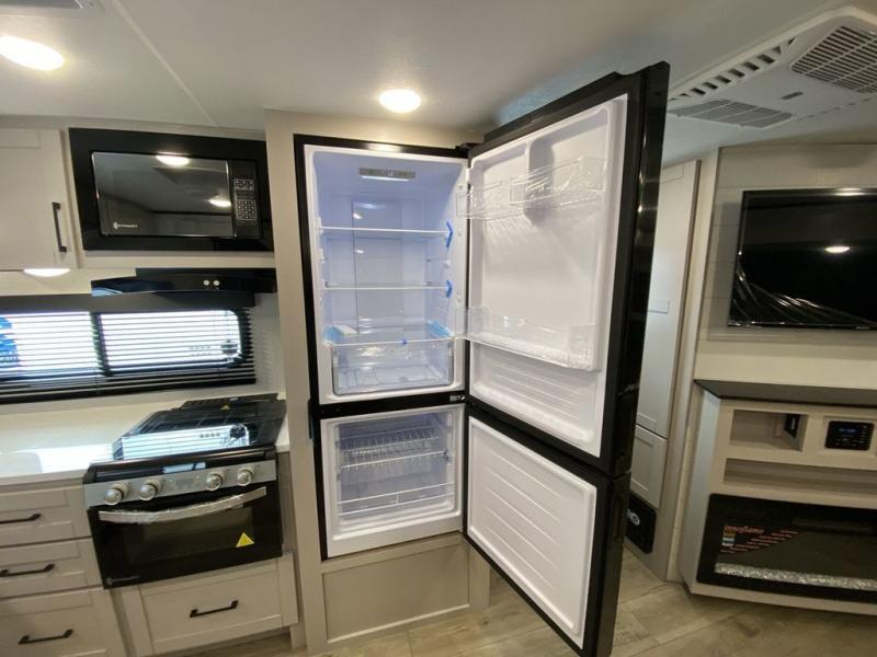 This front kitchen travel trailer will be perfect for camping trips to the lake or woods! The chef will appreciate ample counter space to prep meals plus an 11 cu. ft. 12V refrigerator to store leftovers, the front kitchen also has overhead cabinets and a pantry for storing your snacks and dry goods without worrying about space. Your crew can dine at the booth dinette, then play a game after dinner is cleaned up, this also works as a sleeping space if needed. There is also a theater seat across from the entertainment center with an LED Smart TV to make it a movie night. The bathroom has two entry doors for comfort and easy access along with a radial shower and medicine cabinet. A rear private bedroom is sure to make you feel right at home with a 60" x 80" queen bed, dual wardrobes, and a dresser to keep your things organized. You'll also find one of the dual entry doors here for convenience!