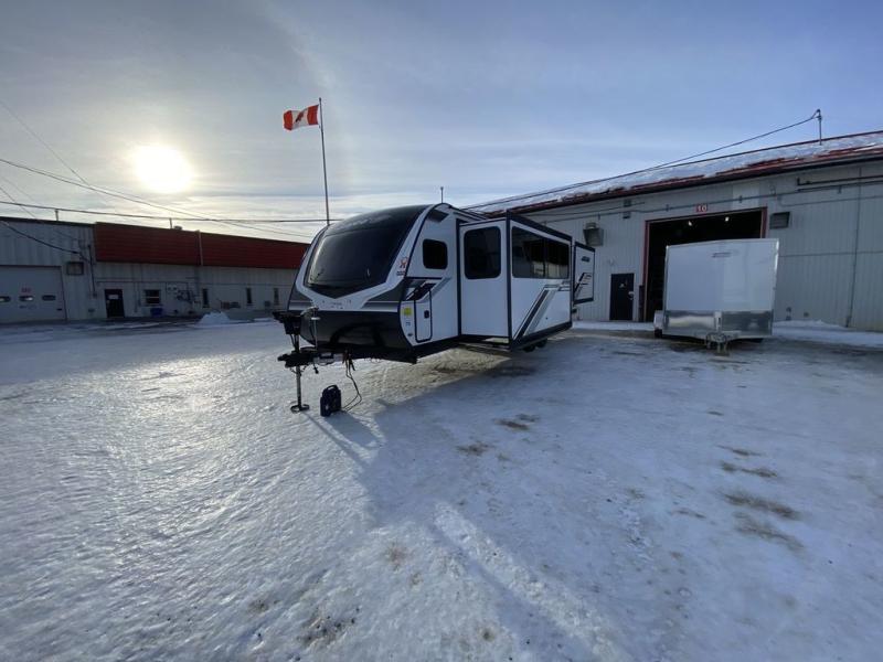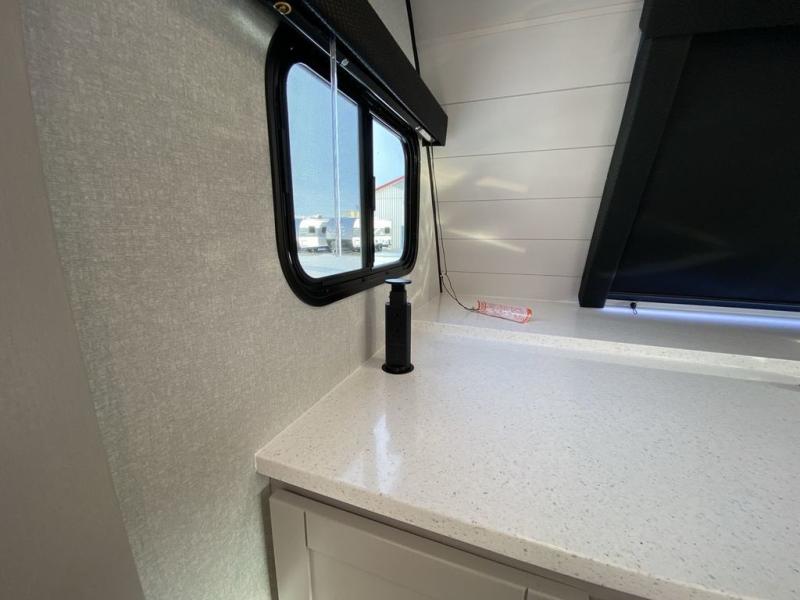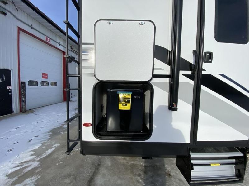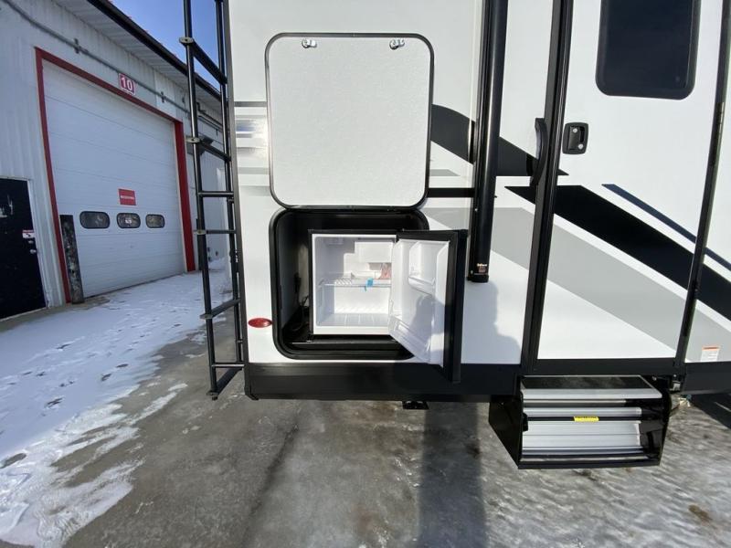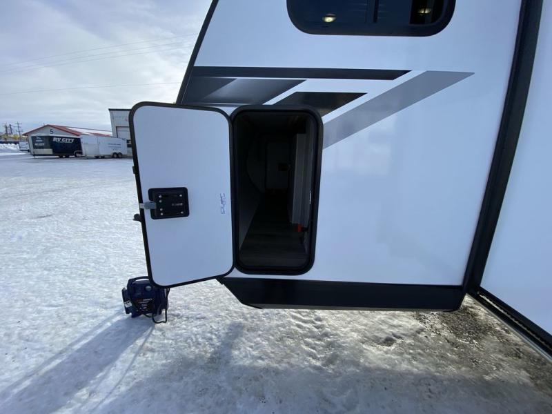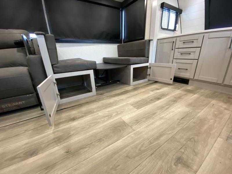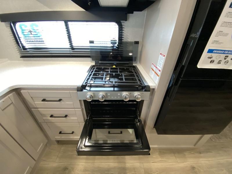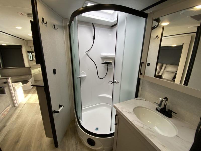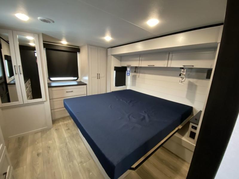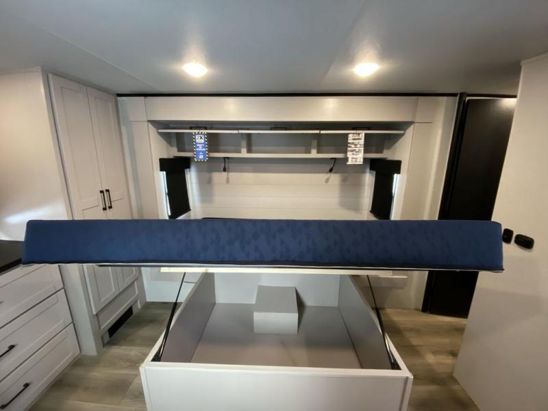 This front kitchen travel trailer will be perfect for camping trips to the lake or woods! The chef will appreciate ample counter space to prep meals plus an 11 cu. ft. 12V refrigerator to store leftovers, the front kitchen also has overhead cabinets and a pantry for storing your snacks and dry goods without worrying about space. Your crew can dine at the booth dinette, then play a game after dinner is cleaned up, this also works as a sleeping space if needed. There is also a theater seat across from the entertainment center with an LED Smart TV to make it a movie night. The bathroom has two entry doors for comfort and easy access along with a radial shower and medicine cabinet. A rear private bedroom is sure to make you feel right at home with a 60" x 80" queen bed, dual wardrobes, and a dresser to keep your things organized. You'll also find one of the dual entry doors here for convenience!