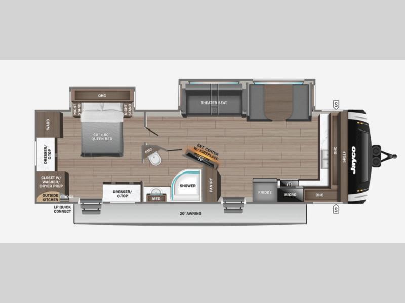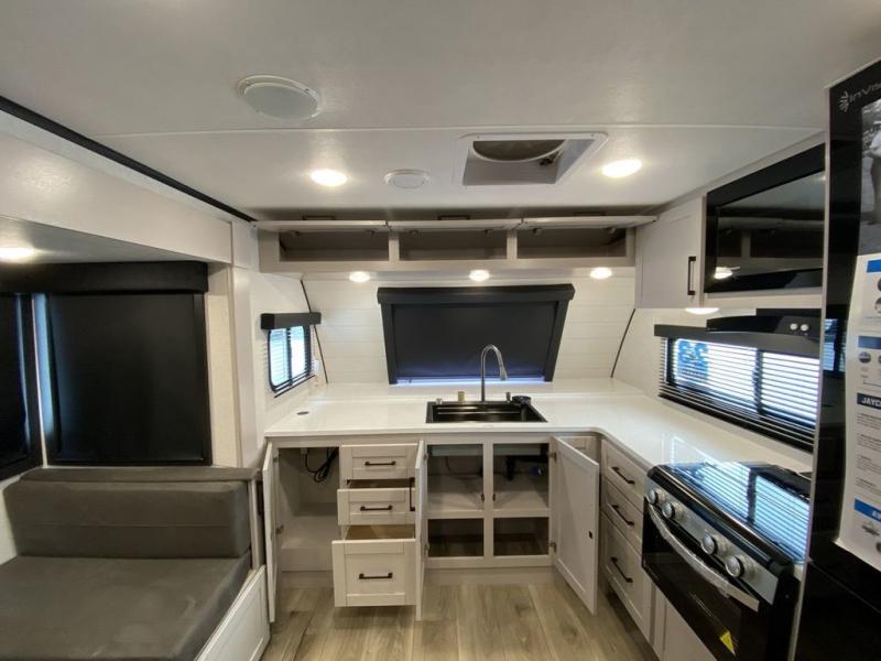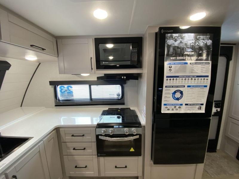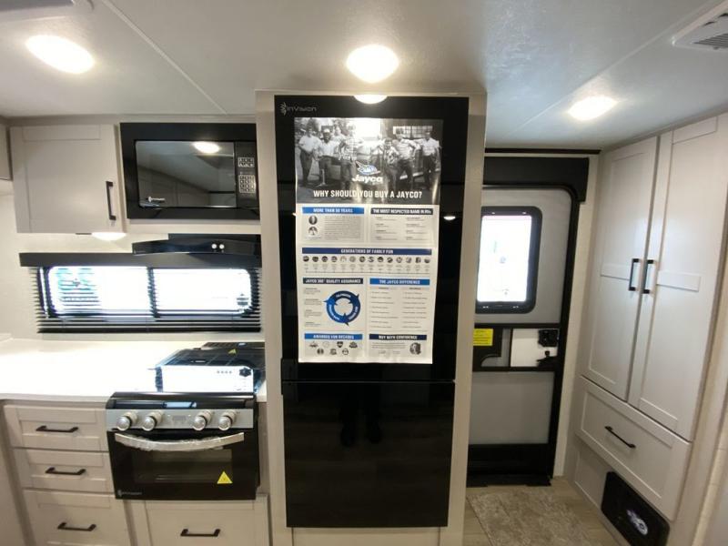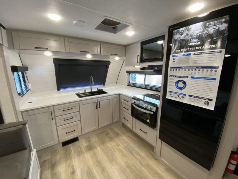 With any Jay Feather travel trailer by Jayco, you will enjoy lightweight towing, convenient exterior amenities, and at-home comforts inside! The Overlander 1 Solar Package included within the Jay Sport Package comes with a 200W solar panel and a 30-amp digital controller so you can enjoy some off-grid camping. There is also a modern graphics package, Solid fold-down step with aluminum tread steps on the main entry doorstep, and Climate Shield 0 -100° F tested weather insulation package that will allow you to camp in various types of climates. The Customer Value Package will make time outdoors easier than ever with a power tongue jack and Automotive-style aluminum rims, plus radial tires with self-adjusting electric brakes. More exterior features include a Keyed-Alike doors, a Magnum Truss roof system, and the list goes on! And we haven't even touched on the interior comforts, like the seamless countertops and Residential vinyl flooring throughout, decorative kitchen backsplash, handcrafted hardwood door/drawer fronts, and multiple USB charging ports to keep you going!