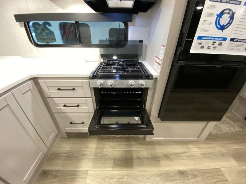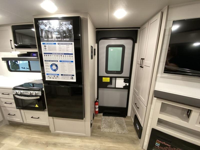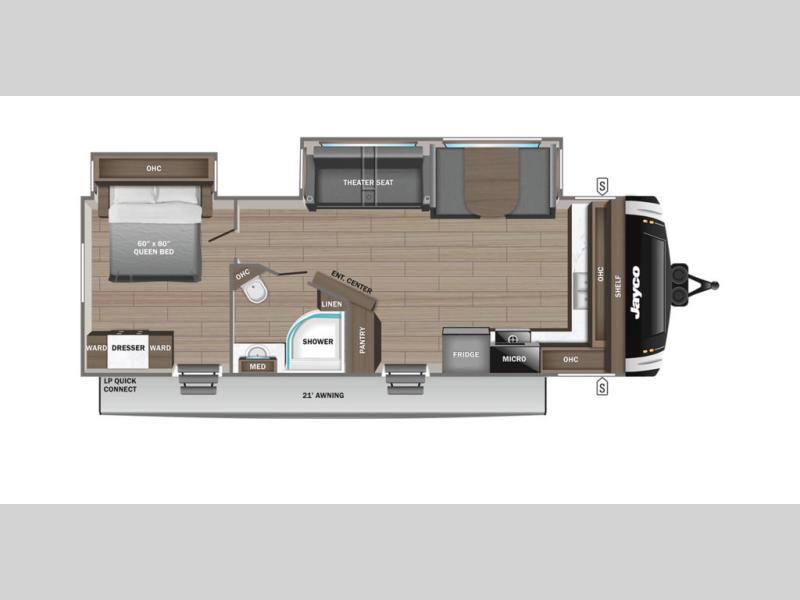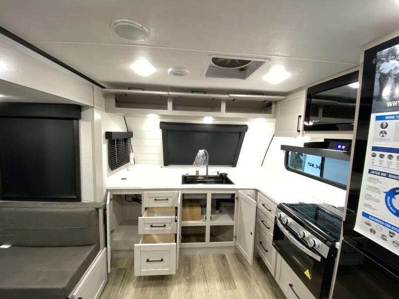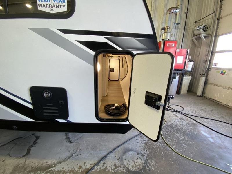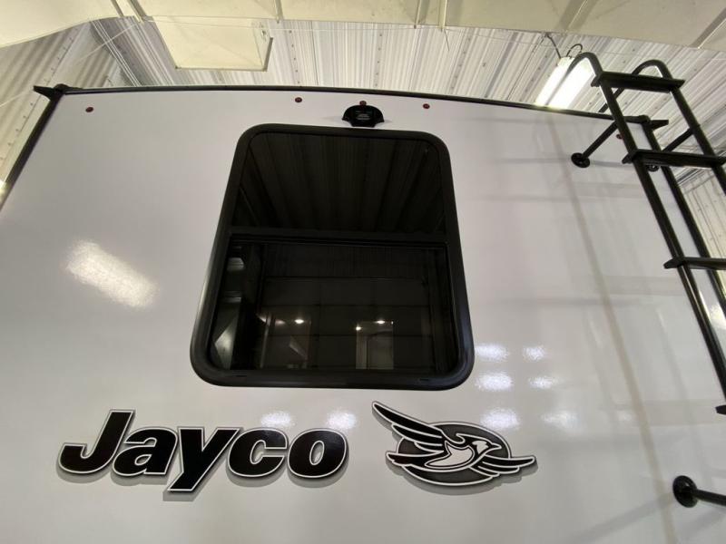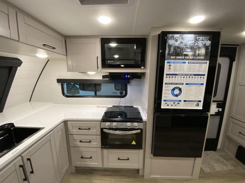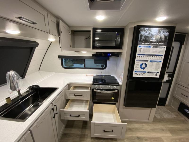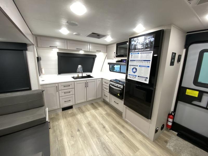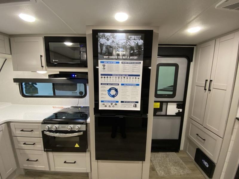 With any Jay Feather travel trailer by Jayco, you will enjoy lightweight towing, convenient exterior amenities, and at-home comforts inside! The Overlander 1 Solar Package included within the Jay Sport Package comes with a 200W solar panel and a 30-amp digital controller so you can enjoy some off-grid camping. There is also a modern graphics package, Solid fold-down step with aluminum tread steps on the main entry doorstep, and Climate Shield 0 -100° F tested weather insulation package that will allow you to camp in various types of climates. The Customer Value Package will make time outdoors easier than ever with a power tongue jack and Automotive-style aluminum rims, plus radial tires with self-adjusting electric brakes. More exterior features include a Keyed-Alike doors, a Magnum Truss roof system, and the list goes on! And we haven't even touched on the interior comforts, like the seamless countertops and Residential vinyl flooring throughout, decorative kitchen backsplash, handcrafted hardwood door/drawer fronts, and multiple USB charging ports to keep you going!