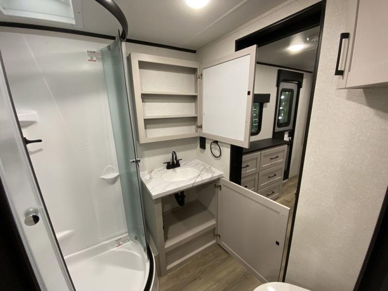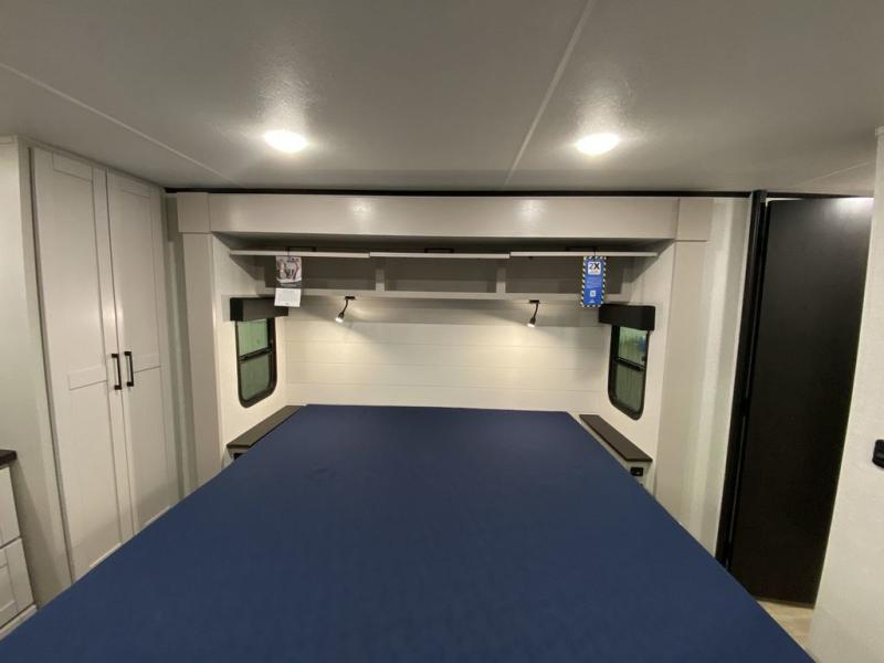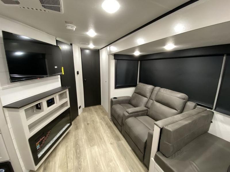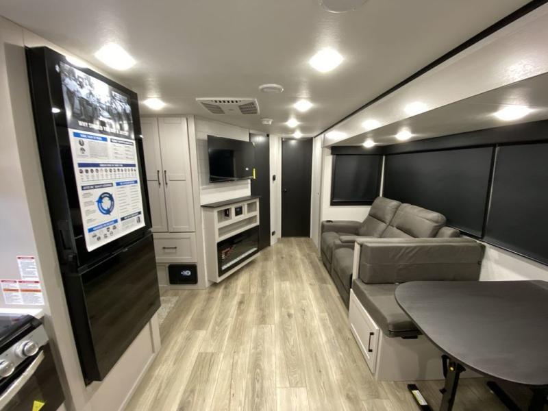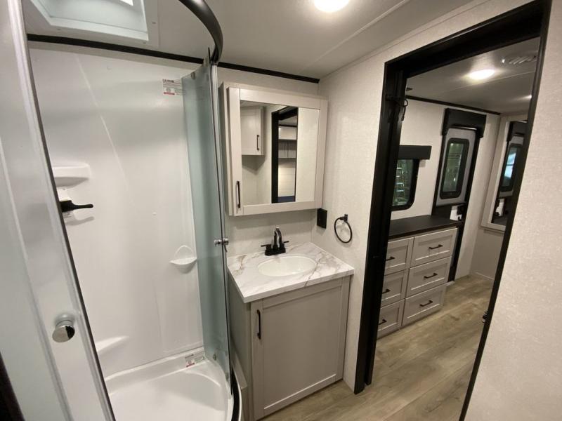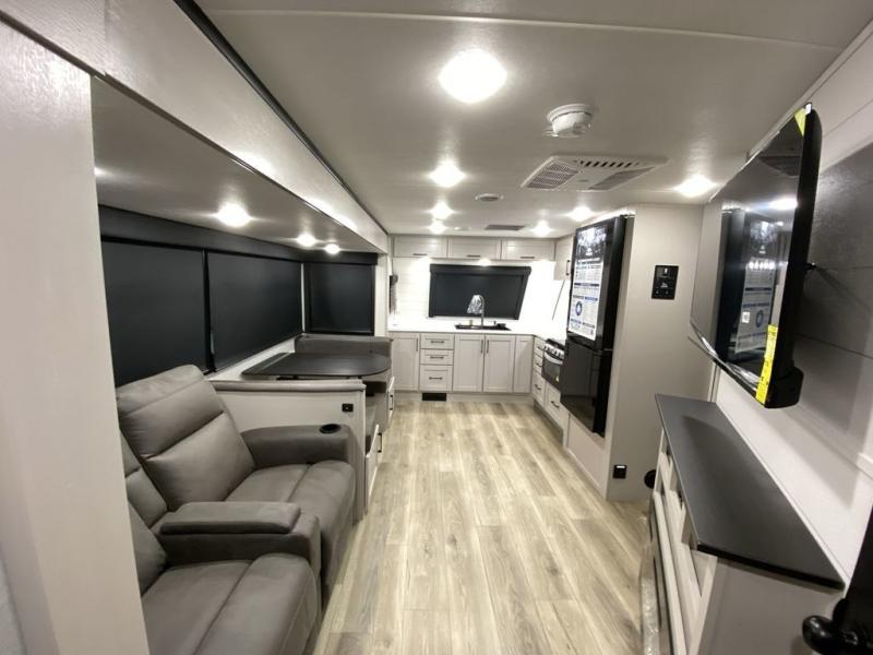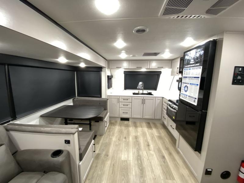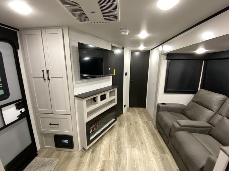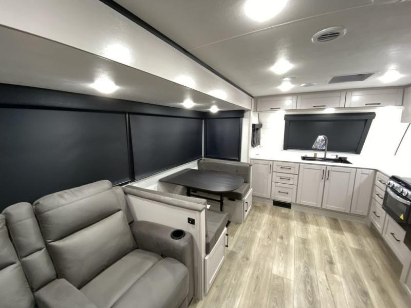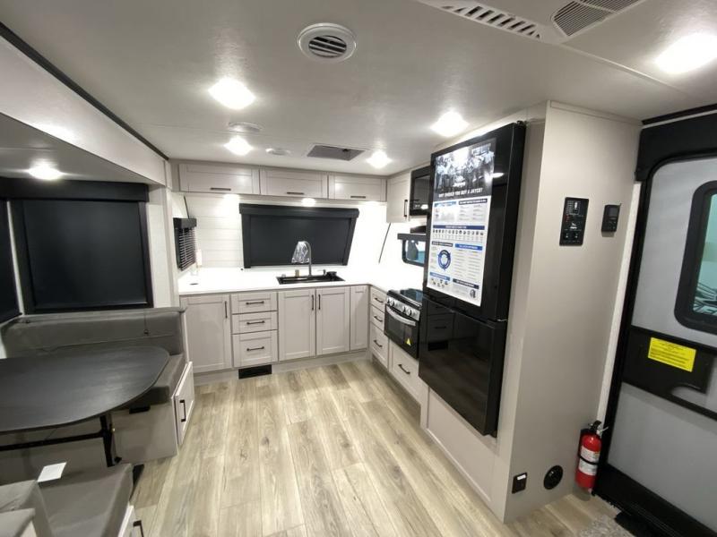 This front kitchen travel trailer will be perfect for camping trips to the lake or woods! The chef will appreciate ample counter space to prep meals plus an 11 cu. ft. 12V refrigerator to store leftovers, the front kitchen also has overhead cabinets and a pantry for storing your snacks and dry goods without worrying about space. Your crew can dine at the booth dinette, then play a game after dinner is cleaned up, this also works as a sleeping space if needed. There is also a theater seat across from the entertainment center with an LED Smart TV to make it a movie night. The bathroom has two entry doors for comfort and easy access along with a radial shower and medicine cabinet. A rear private bedroom is sure to make you feel right at home with a 60" x 80" queen bed, dual wardrobes, and a dresser to keep your things organized. You'll also find one of the dual entry doors here for convenience!