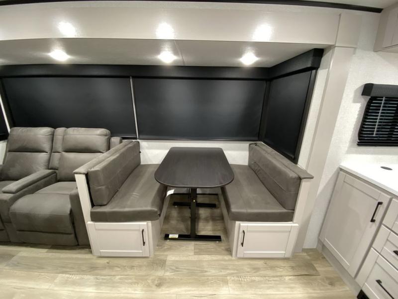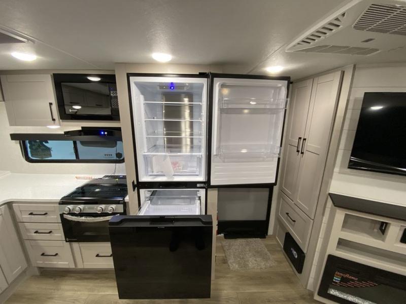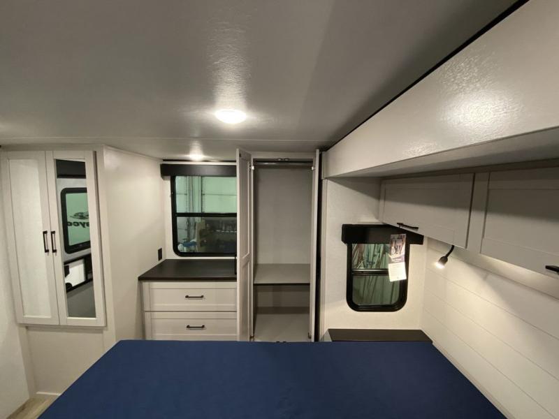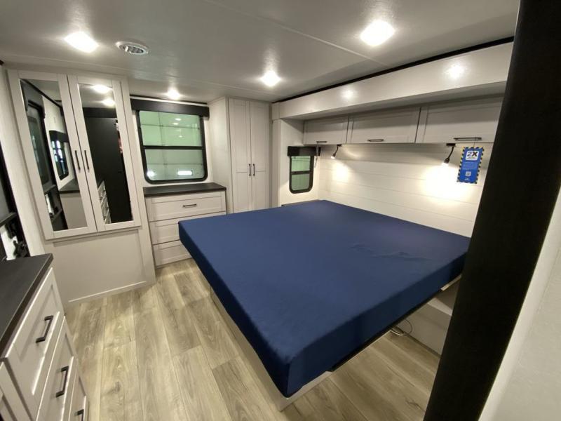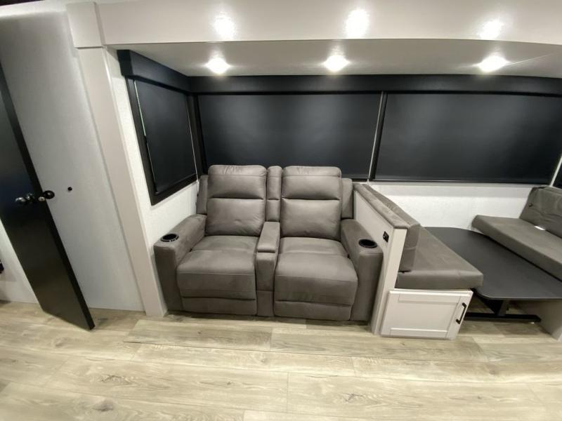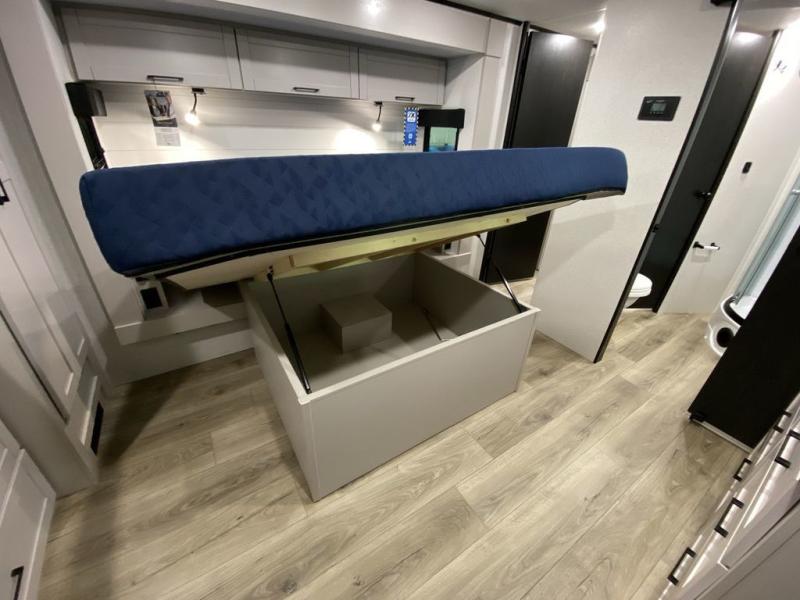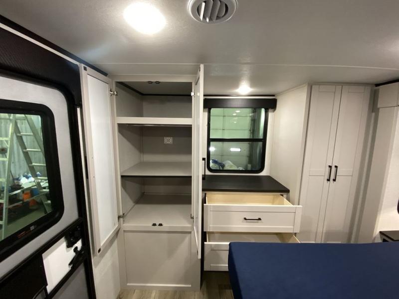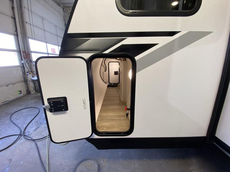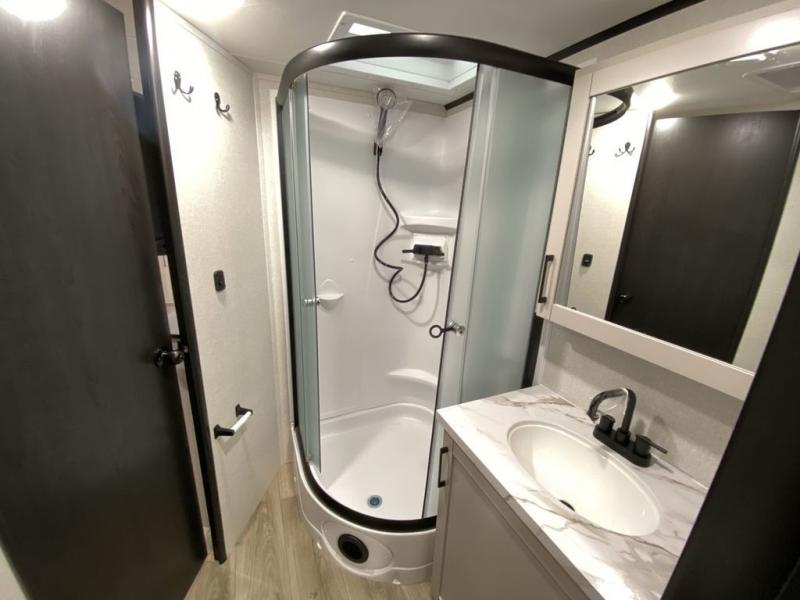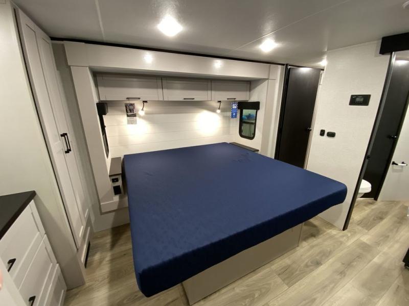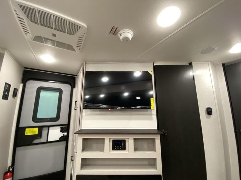 This front kitchen travel trailer will be perfect for camping trips to the lake or woods! The chef will appreciate ample counter space to prep meals plus an 11 cu. ft. 12V refrigerator to store leftovers, the front kitchen also has overhead cabinets and a pantry for storing your snacks and dry goods without worrying about space. Your crew can dine at the booth dinette, then play a game after dinner is cleaned up, this also works as a sleeping space if needed. There is also a theater seat across from the entertainment center with an LED Smart TV to make it a movie night. The bathroom has two entry doors for comfort and easy access along with a radial shower and medicine cabinet. A rear private bedroom is sure to make you feel right at home with a 60" x 80" queen bed, dual wardrobes, and a dresser to keep your things organized. You'll also find one of the dual entry doors here for convenience!