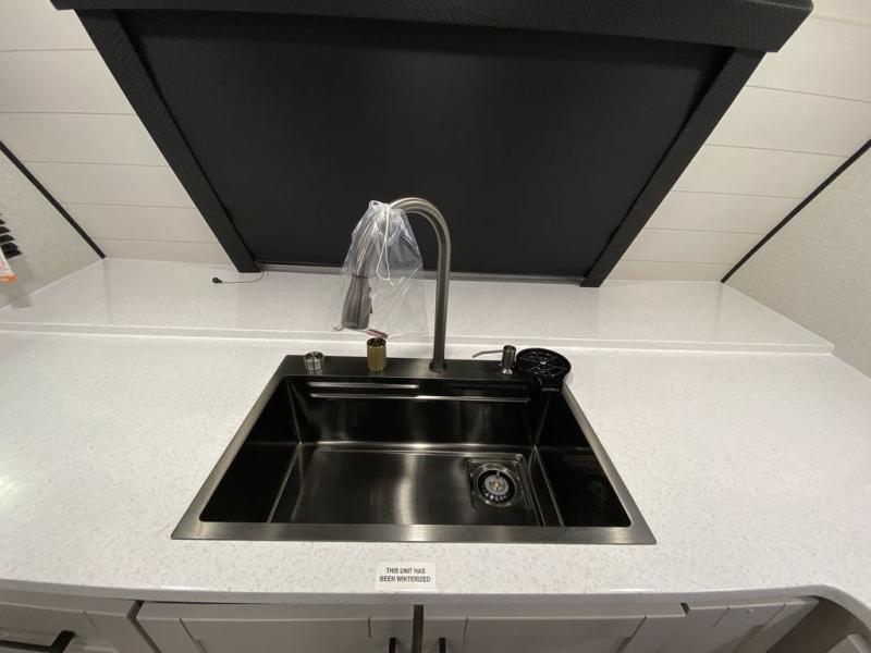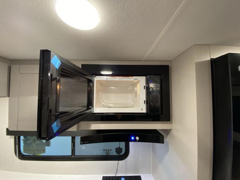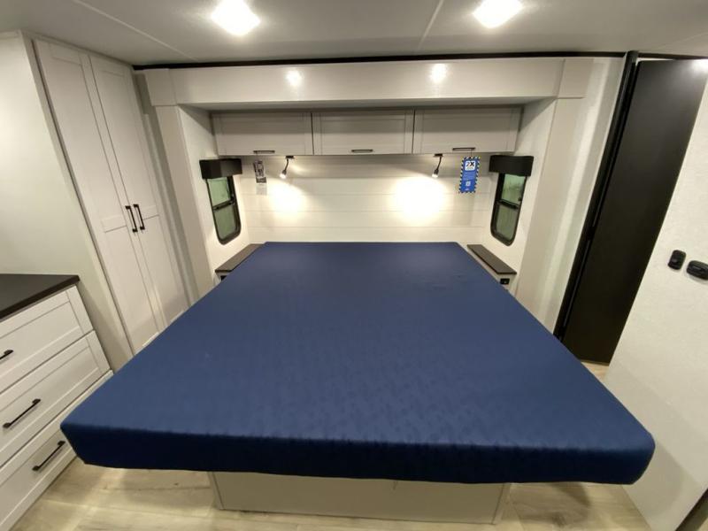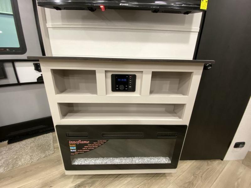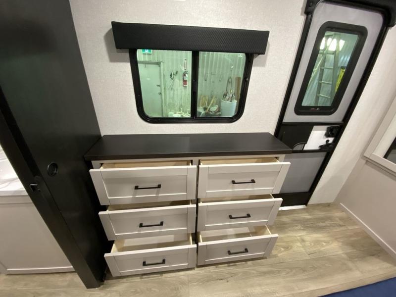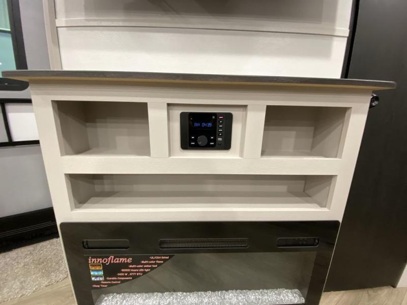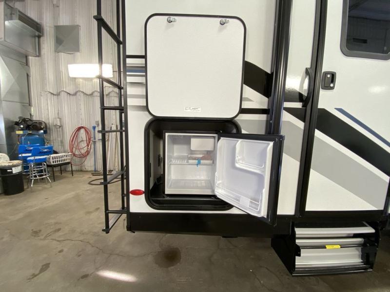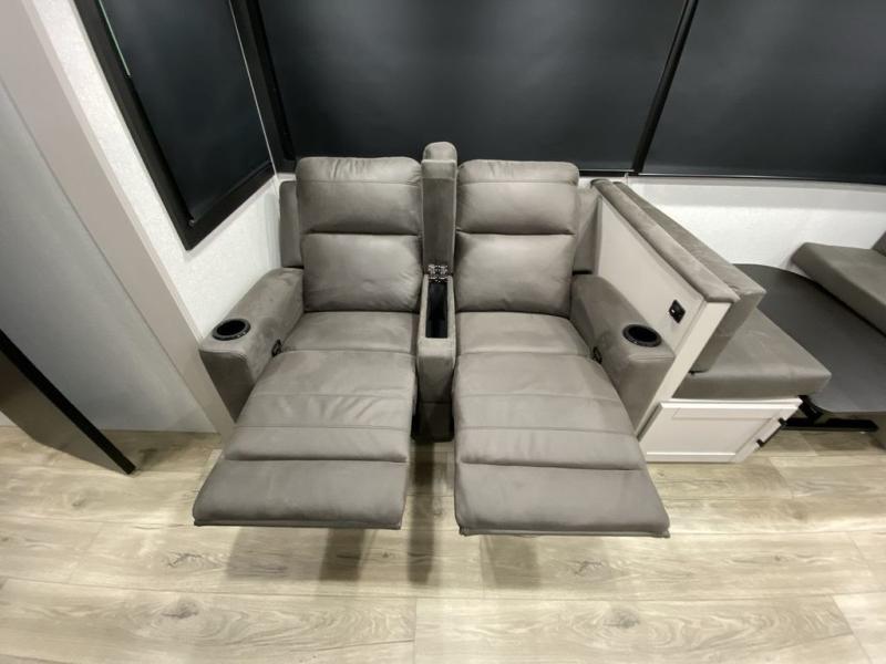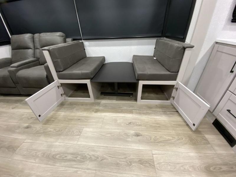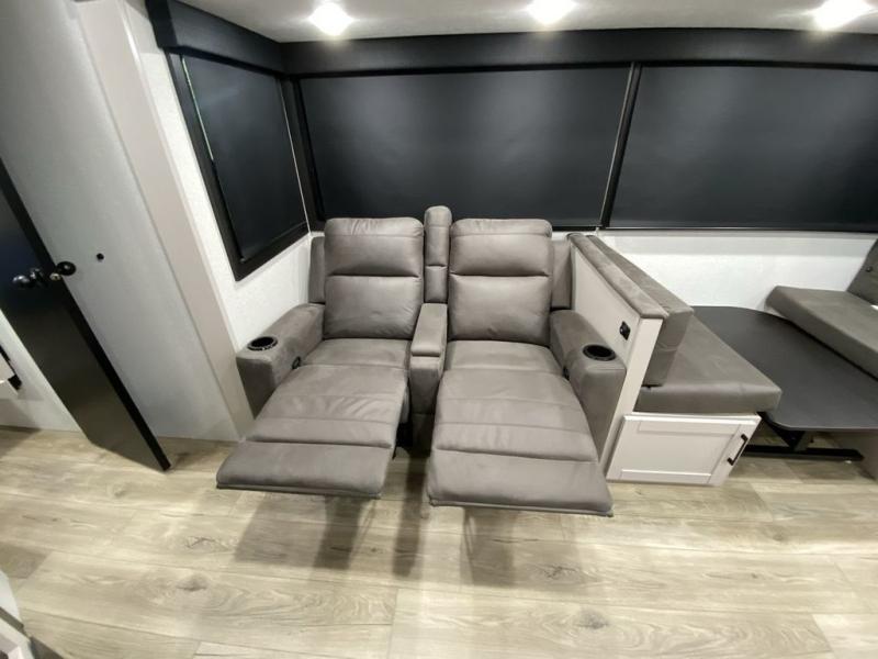 This front kitchen travel trailer will be perfect for camping trips to the lake or woods! The chef will appreciate ample counter space to prep meals plus an 11 cu. ft. 12V refrigerator to store leftovers, the front kitchen also has overhead cabinets and a pantry for storing your snacks and dry goods without worrying about space. Your crew can dine at the booth dinette, then play a game after dinner is cleaned up, this also works as a sleeping space if needed. There is also a theater seat across from the entertainment center with an LED Smart TV to make it a movie night. The bathroom has two entry doors for comfort and easy access along with a radial shower and medicine cabinet. A rear private bedroom is sure to make you feel right at home with a 60" x 80" queen bed, dual wardrobes, and a dresser to keep your things organized. You'll also find one of the dual entry doors here for convenience!