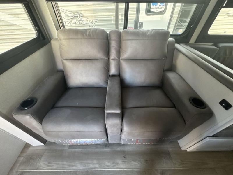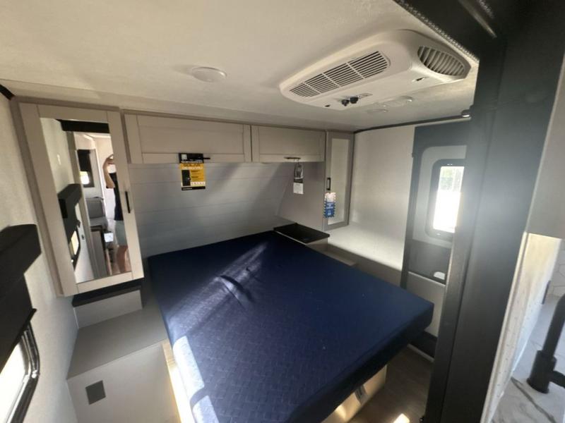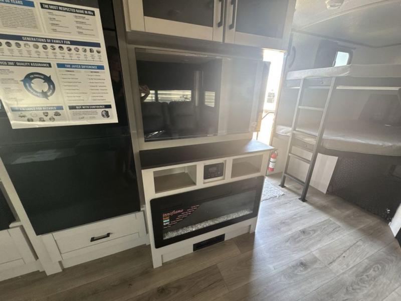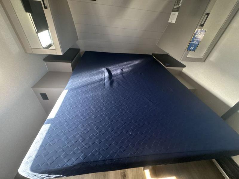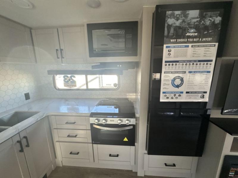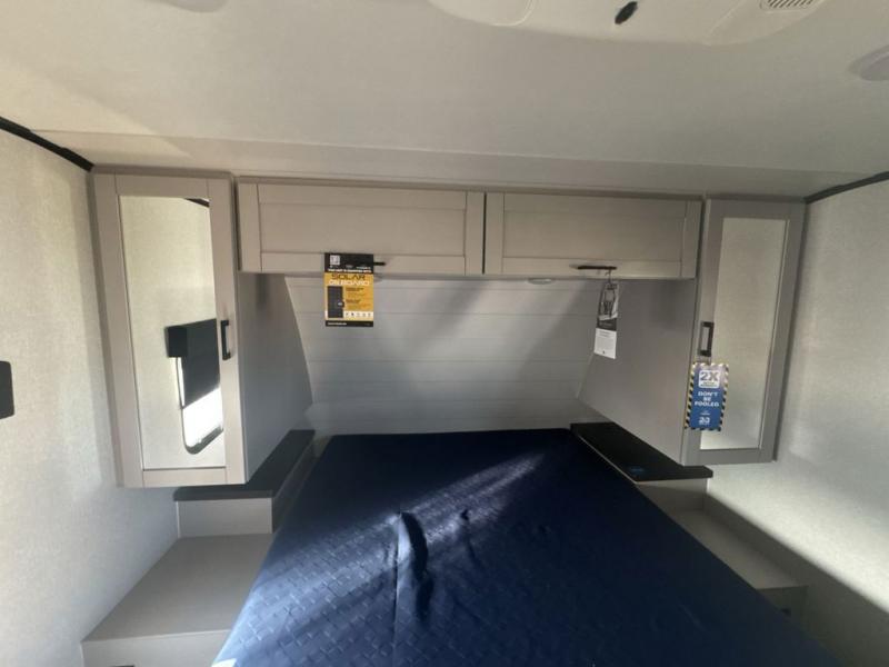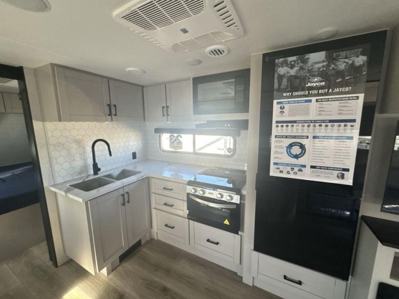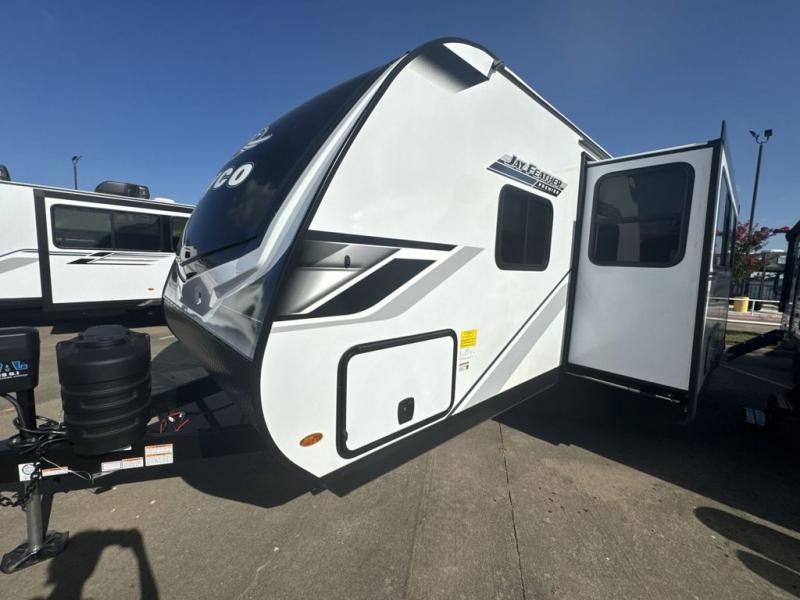 With any Jay Feather travel trailer by Jayco, you will enjoy lightweight towing, convenient exterior amenities, and at-home comforts inside! The Overlander 1 Solar Package included within the Jay Sport Package comes with a 200W solar panel and a 30-amp digital controller so you can enjoy some off-grid camping. There is also a modern graphics package with a dual-colored sidewall, LCI Solid Step fold-down aluminum tread steps on the main entry door, and Climate Shield 0 -100° F tested weather insulation package that will allow you to camp in all sorts of climates. The Customer Value Package will make time outdoors easier than ever with a power tongue jack and a Rock Solid stabilizer system, plus American-made nitro-filled Goodyear tires with self-adjusting electric brakes. More exterior features include a Keyed-Alike locking system, marine grade exterior speakers, a Magnum Truss roof system, and the list goes on! And we haven't even touched on the interior comforts, like the residential style seamless countertops and vinyl flooring throughout, decorative backsplash, handcrafted hardwood door/drawer fronts, and multiple USB charging ports to keep you going!