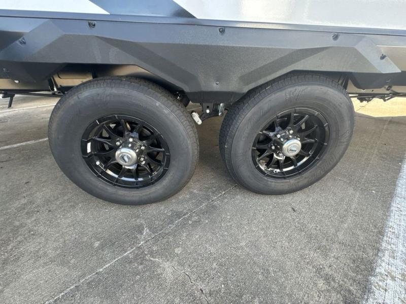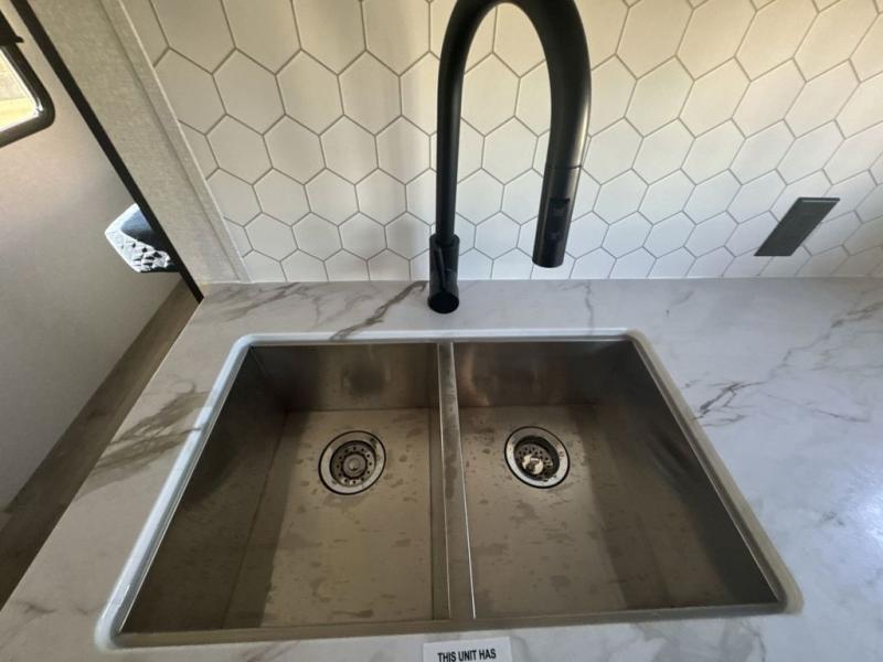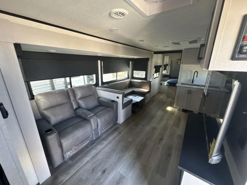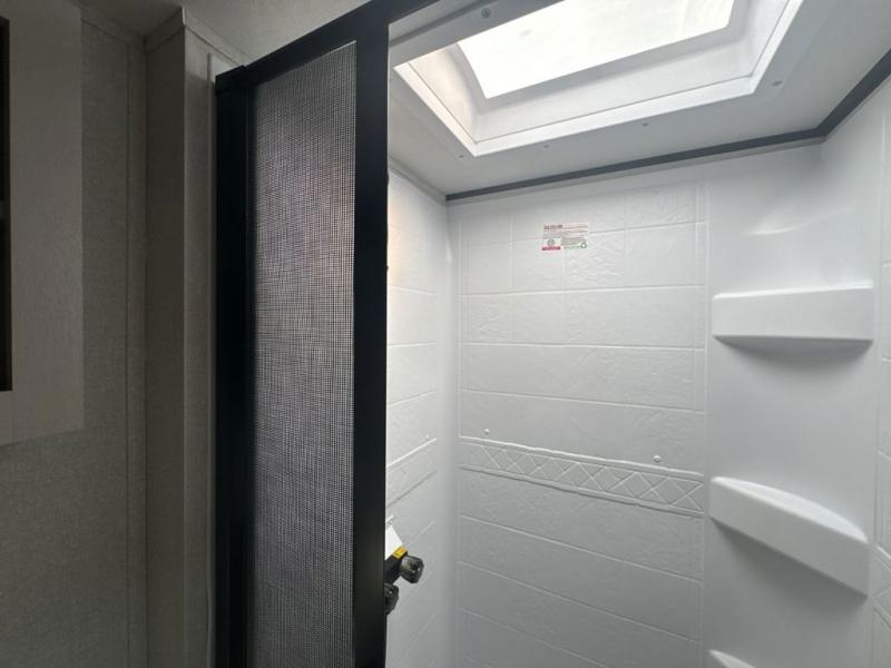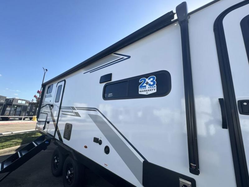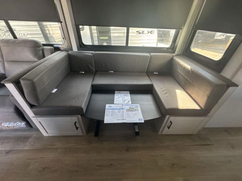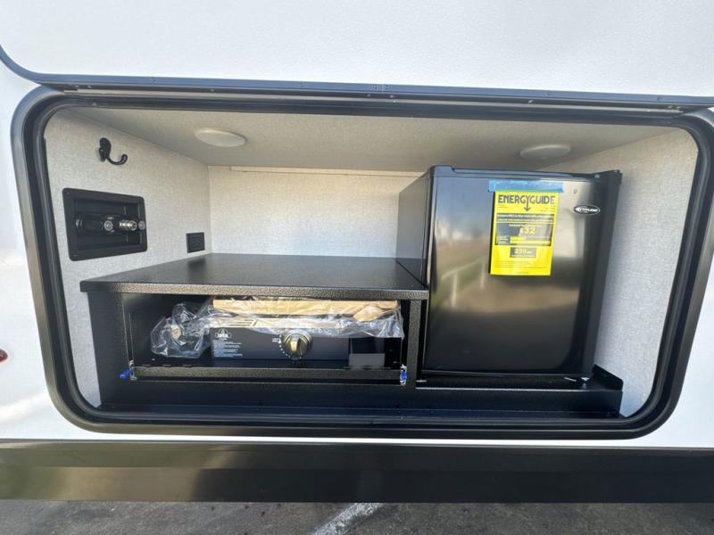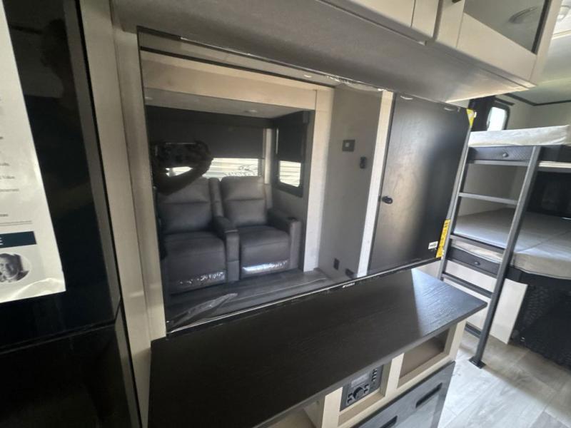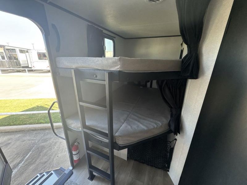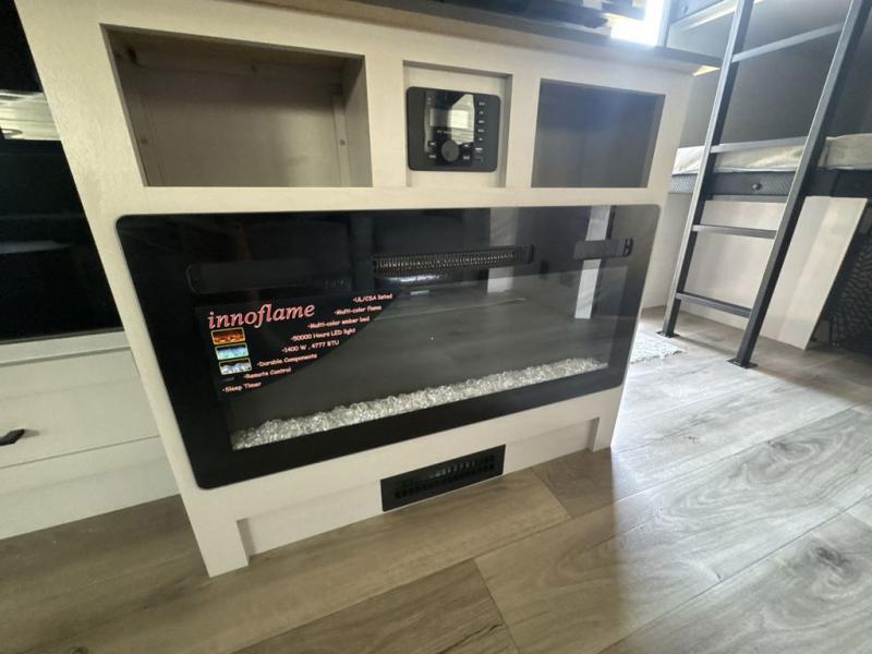Get out and experience new campgrounds with this spacious trailer that offers a slide out tri-fold sofa and U-shaped dinette giving you dining, relaxing and sleeping space as well as more interior floor space to move from the front to the back. There is even an entertainment center here and an optional fireplace to make it more cozy. The cook will love the choice of making meals inside with full amenities or on the outside kitchen when relaxing under the 21' power awning with LED lights. You will appreciate your own space in the front private bedroom with a queen bed, dual wardrobes and nightstands, plus one of the dual entry doors. This model also includes double-size bunks with flip-up storage and a kayak door to easily pack in camp gear!