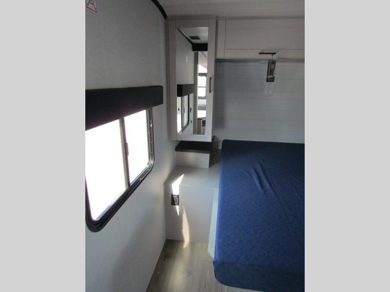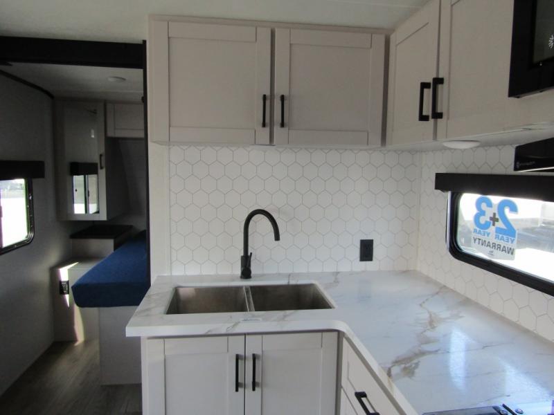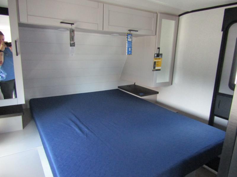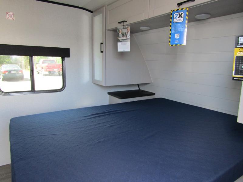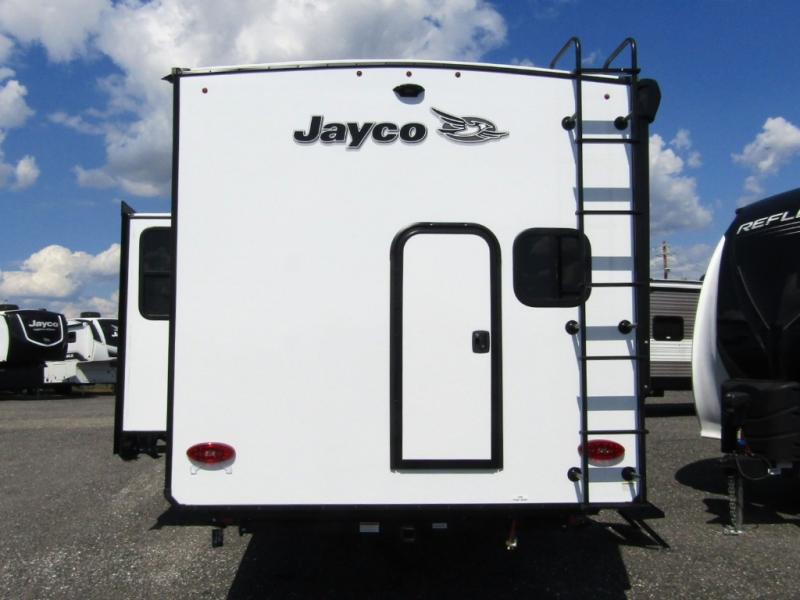 With any Jay Feather travel trailer by Jayco, you will enjoy lightweight towing, convenient exterior amenities, and at-home comforts inside! The Overlander 1 Solar Package included within the Jay Sport Package comes with a 200W solar panel and a 30-amp digital controller so you can enjoy some off-grid camping. There is also a modern graphics package with a dual-colored sidewall, LCI Solid Step fold-down aluminum tread steps on the main entry door, and Climate Shield 0 -100° F tested weather insulation package that will allow you to camp in all sorts of climates. The Customer Value Package will make time outdoors easier than ever with a power tongue jack and a Rock Solid stabilizer system, plus American-made nitro-filled Goodyear tires with self-adjusting electric brakes. More exterior features include a Keyed-Alike locking system, marine grade exterior speakers, a Magnum Truss roof system, and the list goes on! And we haven't even touched on the interior comforts, like the residential style seamless countertops and vinyl flooring throughout, decorative backsplash, handcrafted hardwood door/drawer fronts, and multiple USB charging ports to keep you going!
