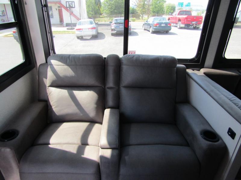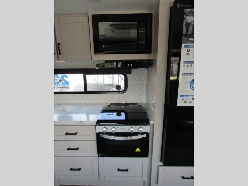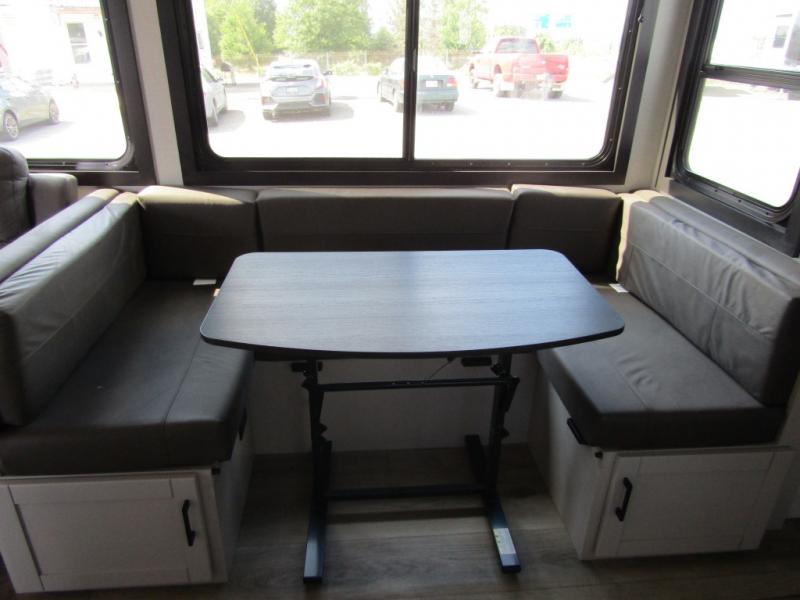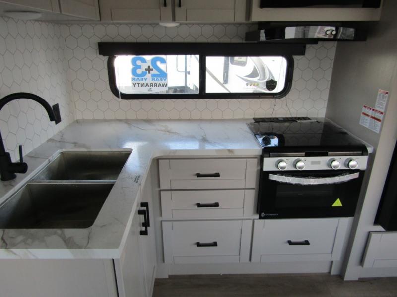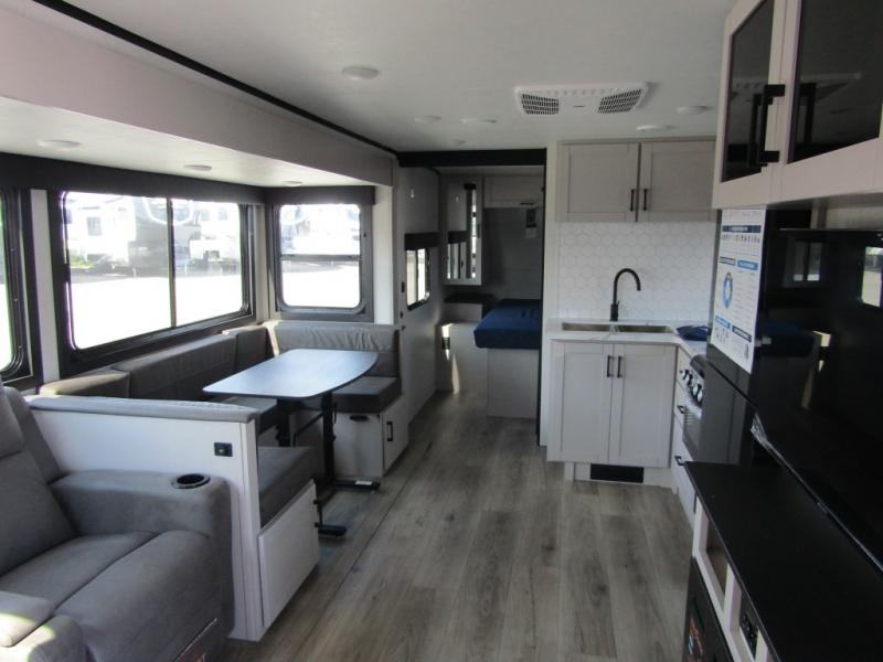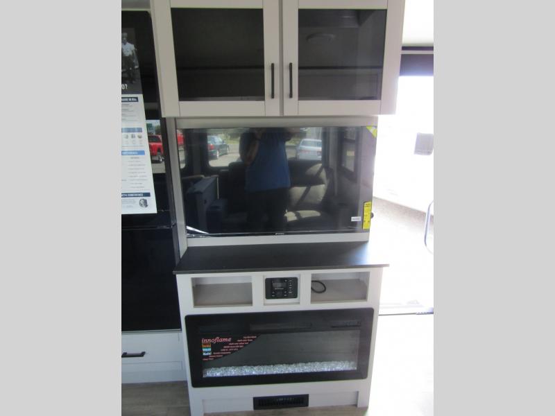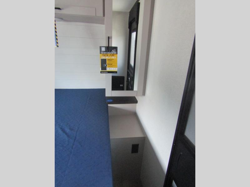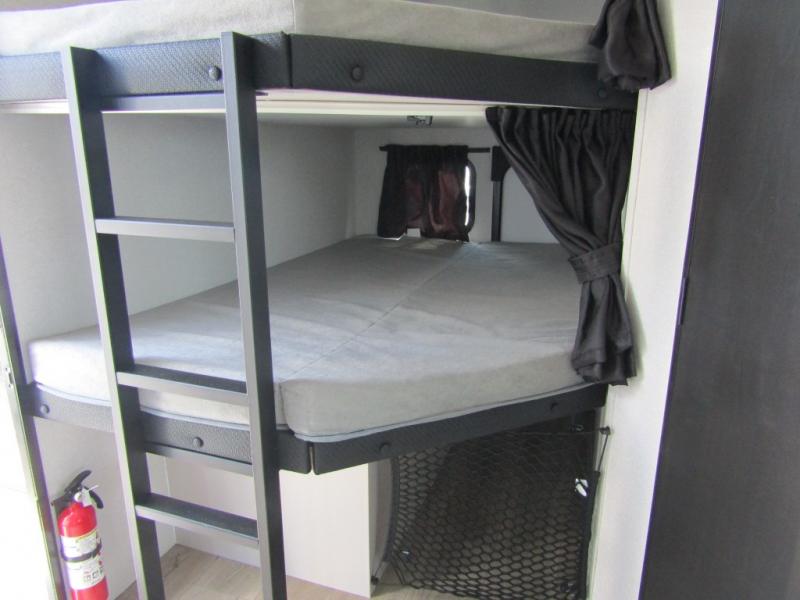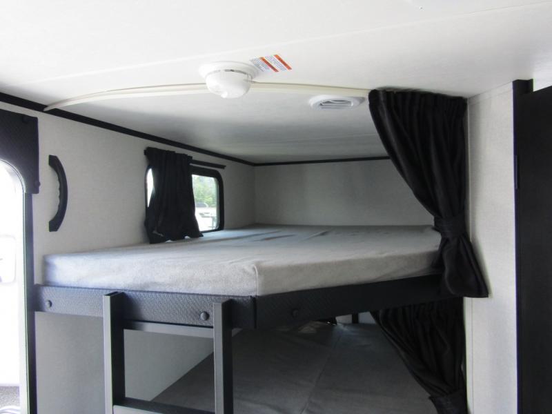 Get out and experience new campgrounds with this spacious trailer that offers a slide out tri-fold sofa and U-shaped dinette giving you dining, relaxing and sleeping space as well as more interior floor space to move from the front to the back. There is even an entertainment center here and an optional fireplace to make it more cozy. The cook will love the choice of making meals inside with full amenities or on the outside kitchen when relaxing under the 21' power awning with LED lights. You will appreciate your own space in the front private bedroom with a queen bed, dual wardrobes and nightstands, plus one of the dual entry doors. This model also includes double-size bunks with flip-up storage and a kayak door to easily pack in camp gear!