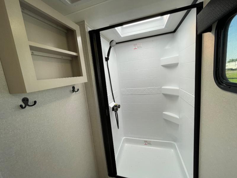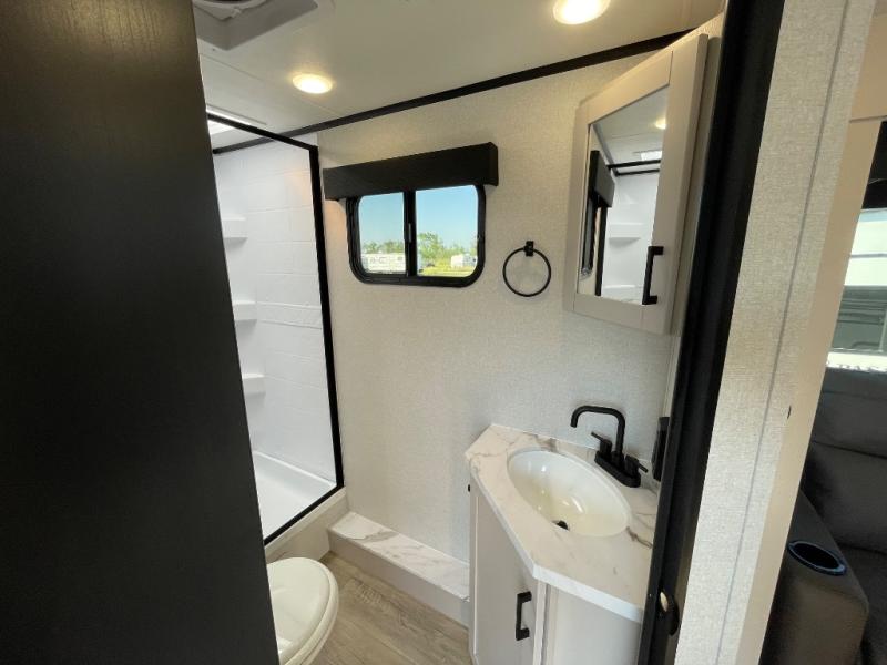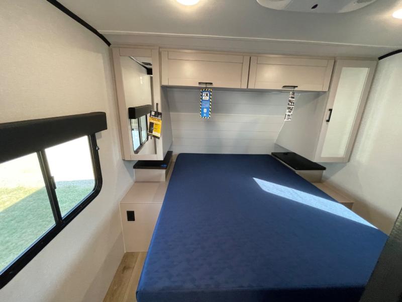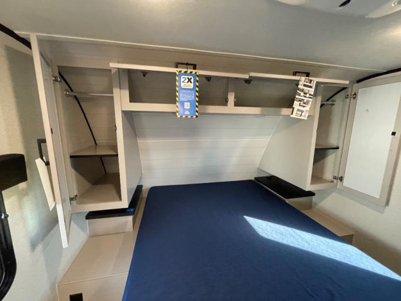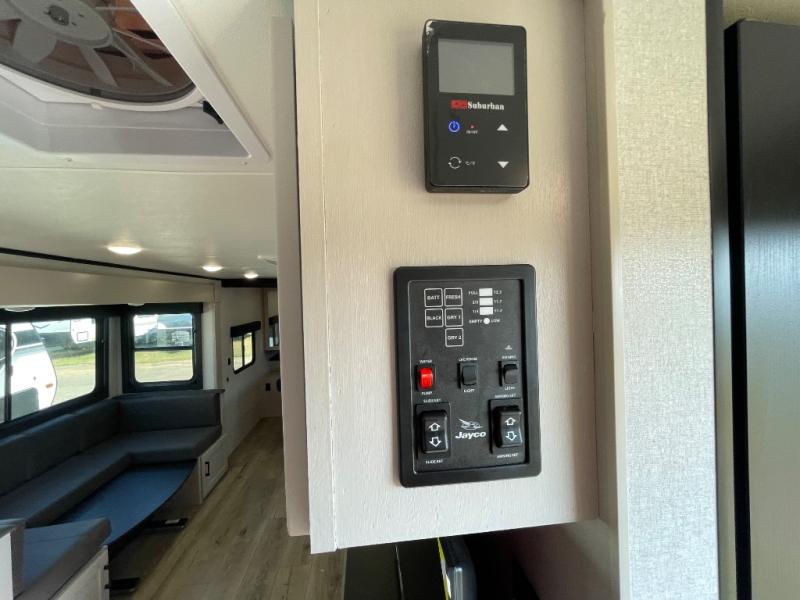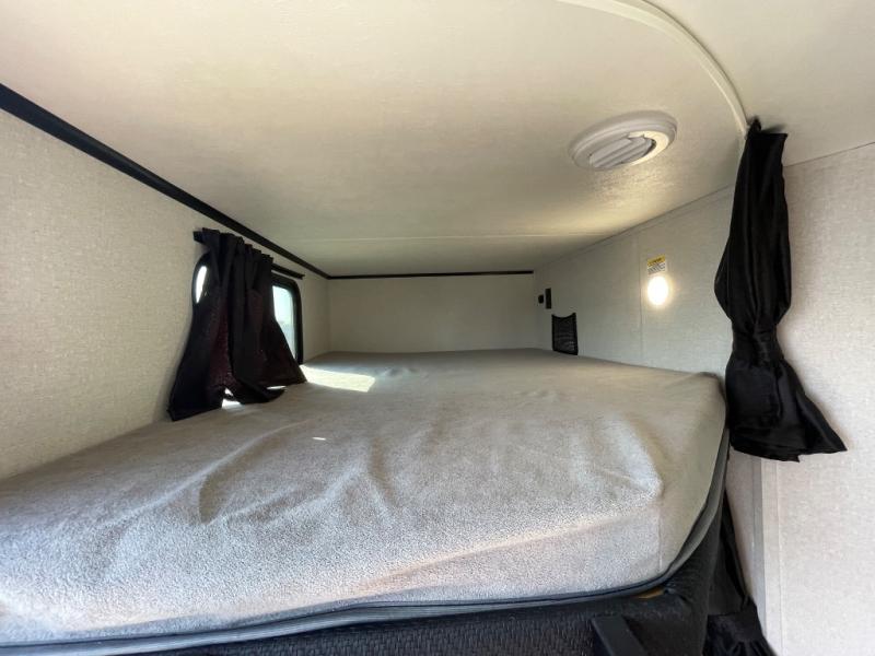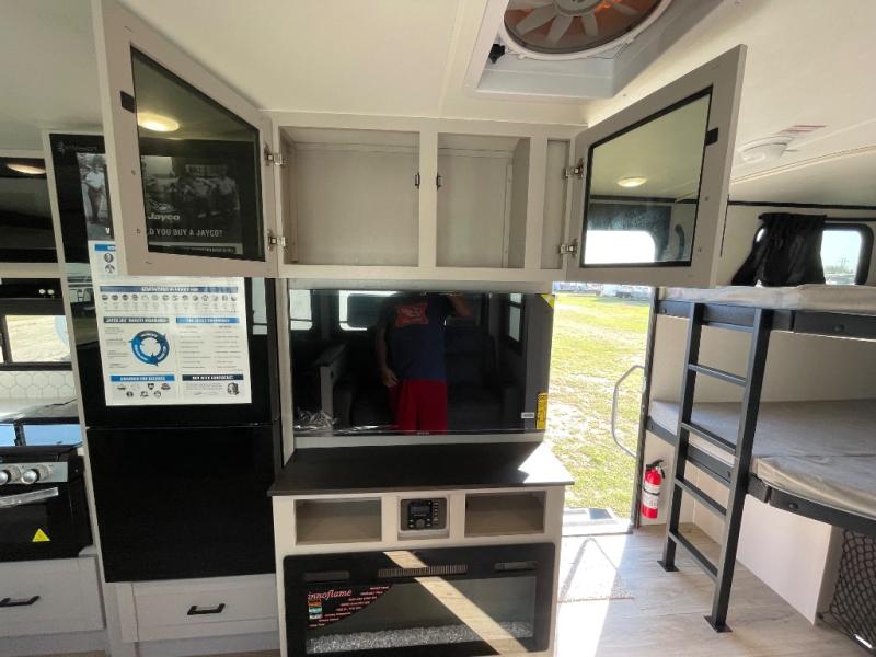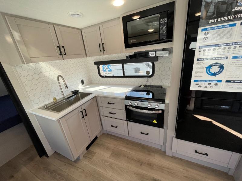 With any Jay Feather travel trailer by Jayco, you will enjoy lightweight towing, convenient exterior amenities, and at-home comforts inside! The Overlander 1 Solar Package included within the Jay Sport Package comes with a 200W solar panel and a 30-amp digital controller so you can enjoy some off-grid camping. There is also a modern graphics package with a dual-colored sidewall, LCI Solid Step fold-down aluminum tread steps on the main entry door, and Climate Shield 0 -100° F tested weather insulation package that will allow you to camp in all sorts of climates. The Customer Value Package will make time outdoors easier than ever with a power tongue jack and a Rock Solid stabilizer system, plus American-made nitro-filled Goodyear tires with self-adjusting electric brakes. More exterior features include a Keyed-Alike locking system, marine grade exterior speakers, a Magnum Truss roof system, and the list goes on! And we haven't even touched on the interior comforts, like the residential style seamless countertops and vinyl flooring throughout, decorative backsplash, handcrafted hardwood door/drawer fronts, and multiple USB charging ports to keep you going!