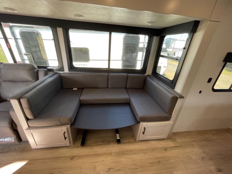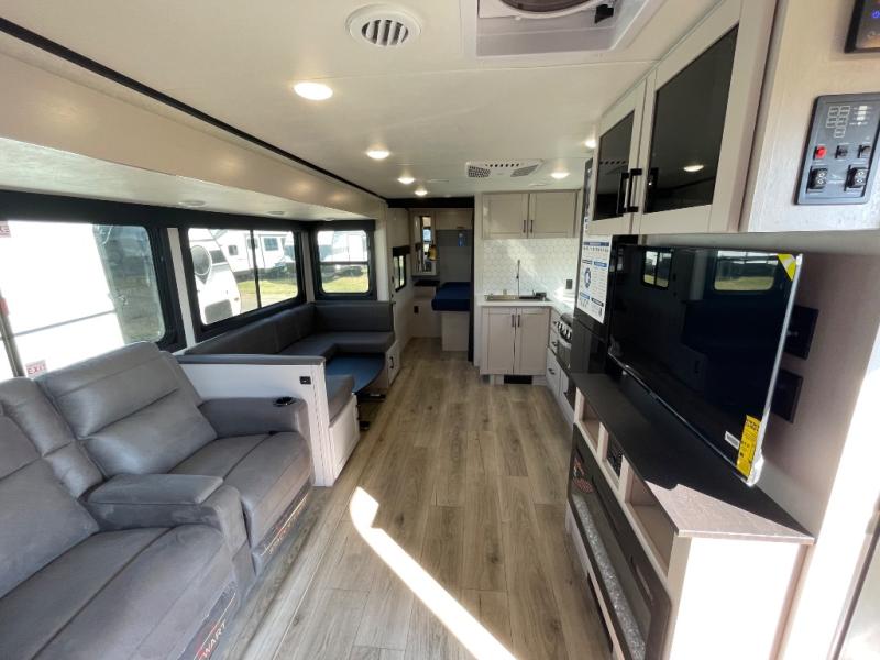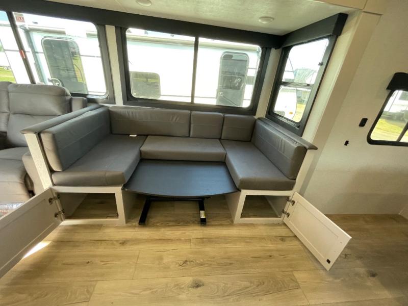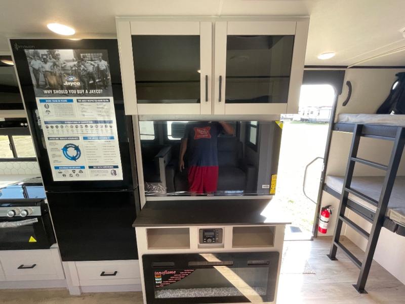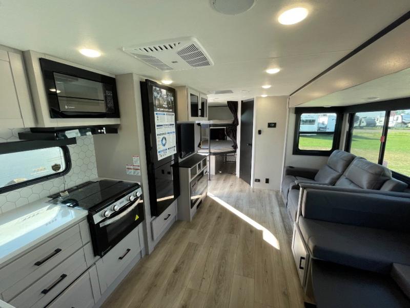 Get out and experience new campgrounds with this spacious trailer that offers a slide out tri-fold sofa and U-shaped dinette giving you dining, relaxing and sleeping space as well as more interior floor space to move from the front to the back. There is even an entertainment center here and an optional fireplace to make it more cozy. The cook will love the choice of making meals inside with full amenities or on the outside kitchen when relaxing under the 21' power awning with LED lights. You will appreciate your own space in the front private bedroom with a queen bed, dual wardrobes and nightstands, plus one of the dual entry doors. This model also includes double-size bunks with flip-up storage and a kayak door to easily pack in camp gear!