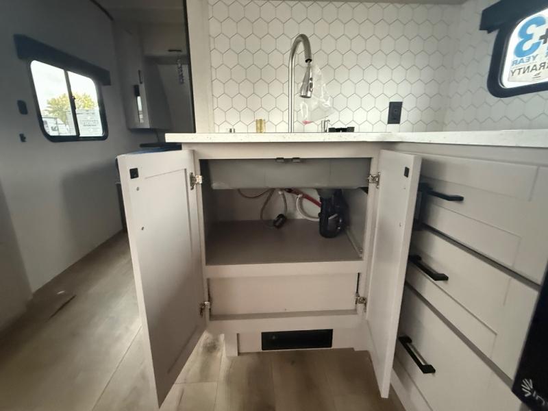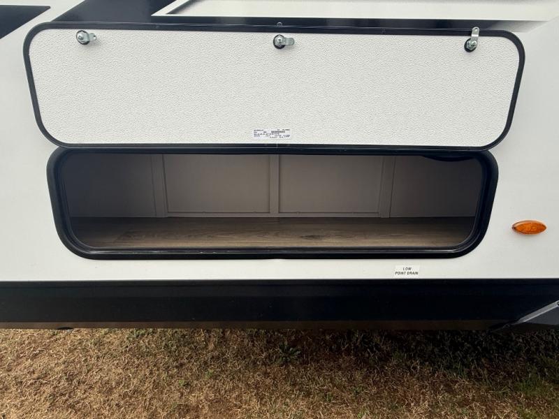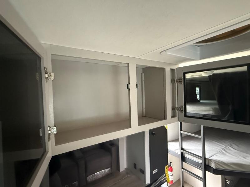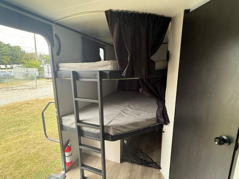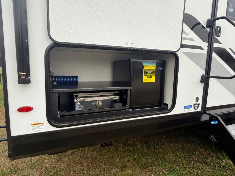 Get out and experience new campgrounds with this spacious trailer that offers a slide out tri-fold sofa and U-shaped dinette giving you dining, relaxing and sleeping space as well as more interior floor space to move from the front to the back. There is even an entertainment center here and an optional fireplace to make it more cozy. The cook will love the choice of making meals inside with full amenities or on the outside kitchen when relaxing under the 21' power awning with LED lights. You will appreciate your own space in the front private bedroom with a queen bed, dual wardrobes and nightstands, plus one of the dual entry doors. This model also includes double-size bunks with flip-up storage and a kayak door to easily pack in camp gear!