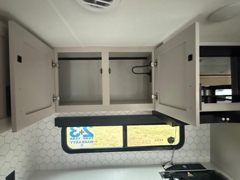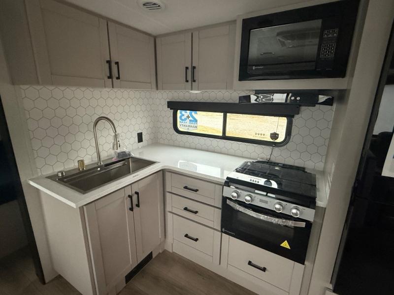 With any Jay Feather travel trailer by Jayco, you will enjoy lightweight towing, convenient exterior amenities, and at-home comforts inside! The Overlander 1 Solar Package included within the Jay Sport Package comes with a 200W solar panel and a 30-amp digital controller so you can enjoy some off-grid camping. There is also a modern graphics package with a dual-colored sidewall, LCI Solid Step fold-down aluminum tread steps on the main entry door, and Climate Shield 0 -100° F tested weather insulation package that will allow you to camp in all sorts of climates. The Customer Value Package will make time outdoors easier than ever with a power tongue jack and a Rock Solid stabilizer system, plus American-made nitro-filled Goodyear tires with self-adjusting electric brakes. More exterior features include a Keyed-Alike locking system, marine grade exterior speakers, a Magnum Truss roof system, and the list goes on! And we haven't even touched on the interior comforts, like the residential style seamless countertops and vinyl flooring throughout, decorative backsplash, handcrafted hardwood door/drawer fronts, and multiple USB charging ports to keep you going!