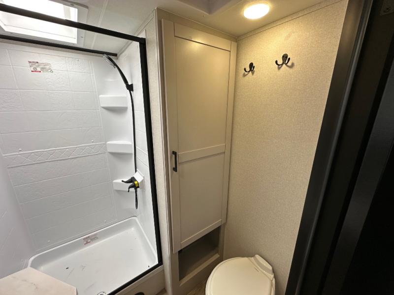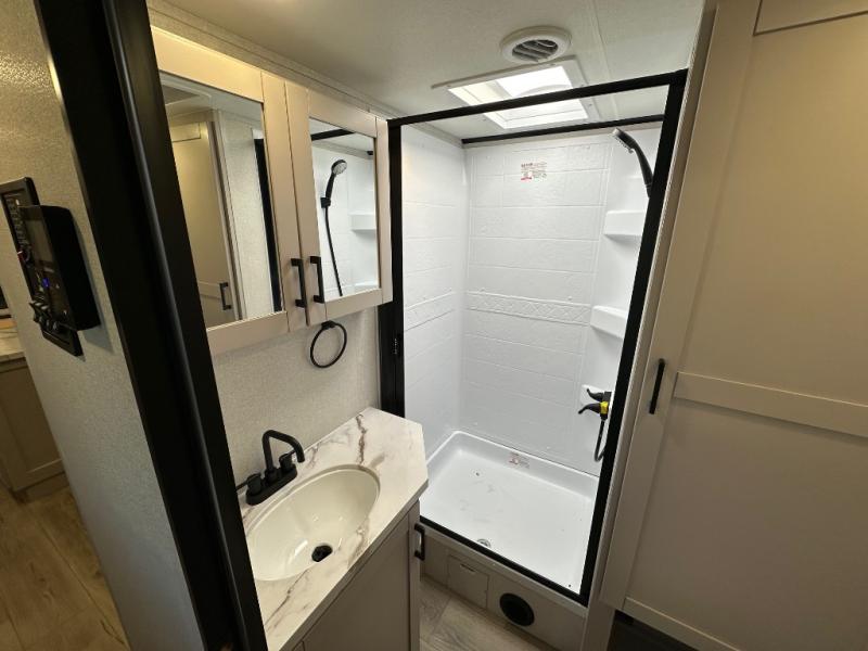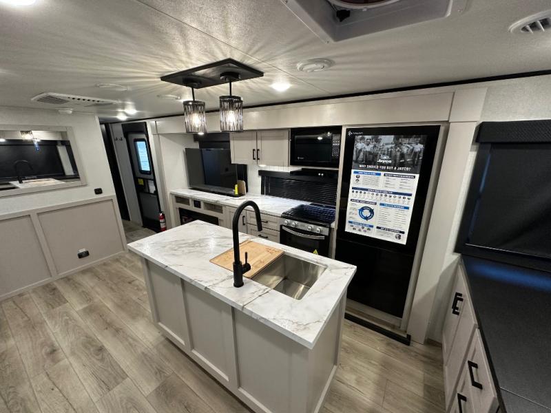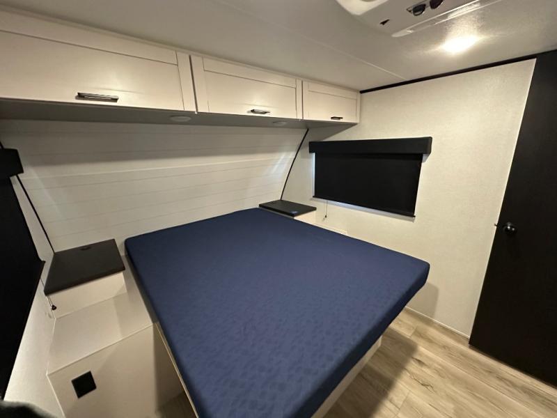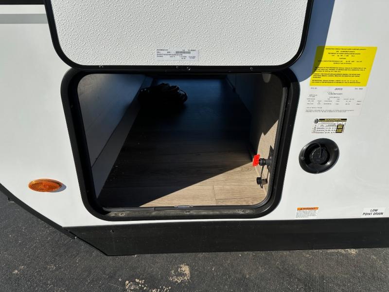With any Jay Feather travel trailer by Jayco, you will enjoy lightweight towing, convenient exterior amenities, and at-home comforts inside! The Overlander 1 Solar Package included within the Jay Sport Package comes with a 200W solar panel and a 30-amp digital controller so you can enjoy some off-grid camping. There is also a modern graphics package with a dual-colored sidewall, LCI Solid Step fold-down aluminum tread steps on the main entry door, and Climate Shield 0 -100° F tested weather insulation package that will allow you to camp in all sorts of climates. The Customer Value Package will make time outdoors easier than ever with a power tongue jack and a Rock Solid stabilizer system, plus American-made nitro-filled Goodyear tires with self-adjusting electric brakes. More exterior features include a Keyed-Alike locking system, marine grade exterior speakers, a Magnum Truss roof system, and the list goes on! And we haven't even touched on the interior comforts, like the residential style seamless countertops and vinyl flooring throughout, decorative backsplash, handcrafted hardwood door/drawer fronts, and multiple USB charging ports to keep you going!