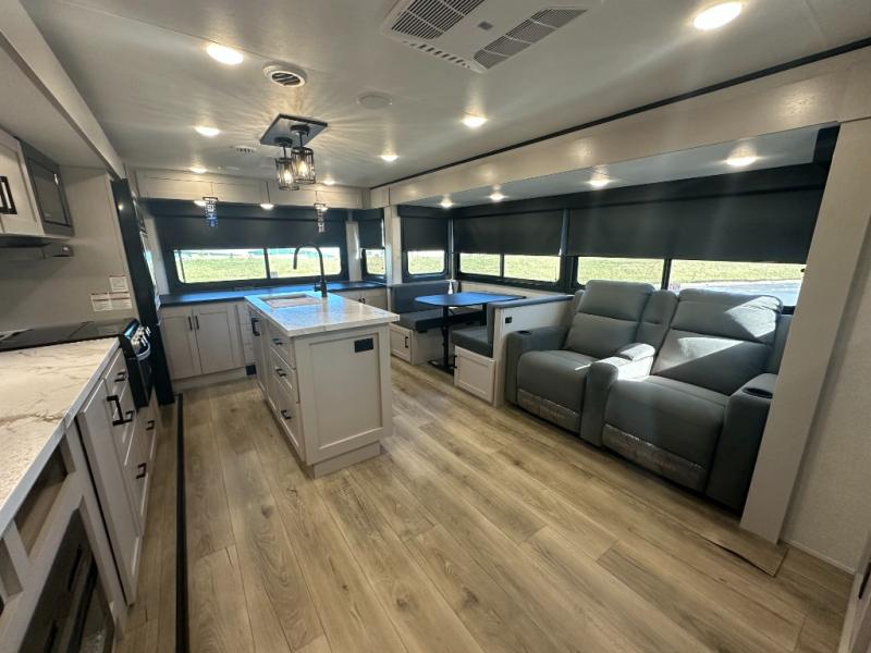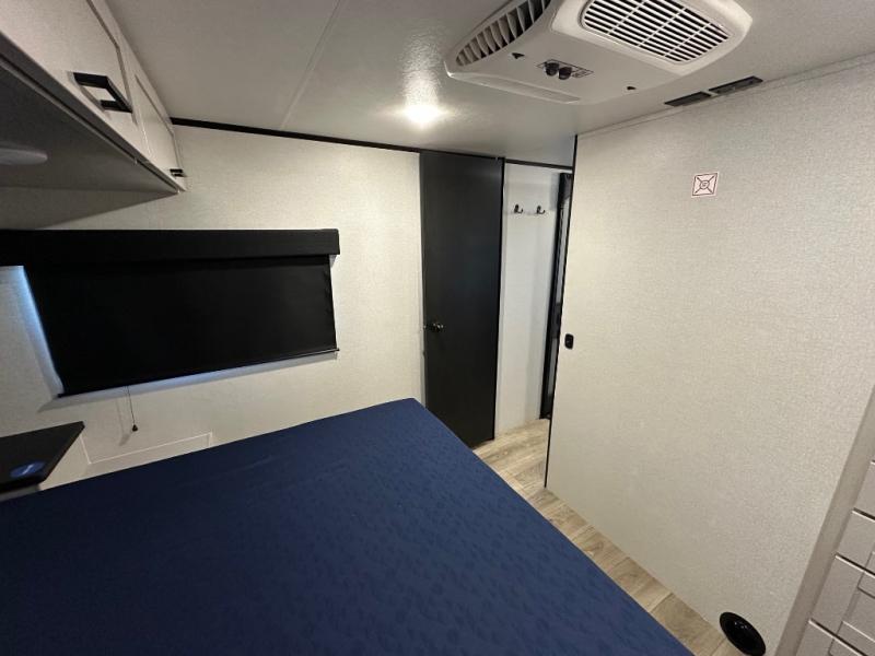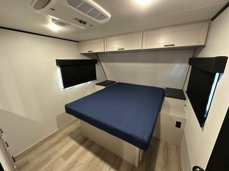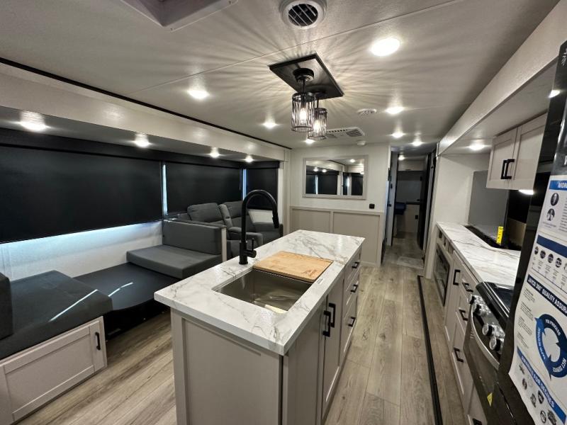Perfect for weekend trips or extended stays, this travel trailer is the one! You will find a rear desk with an ottoman plus overhead storage if you plan to work while you're away from home. The dual opposing slides in the combined kitchen and living area will create an open floorplan, and the kitchen island will provide the chef of your group with more counter space. There is a tri-fold sofa and booth dinette that double as seating and sleeping space, and the full bath onboard will keep everyone clean. Don't overlook the front private bedroom with a queen bed and plenty of storage space for your belongings!