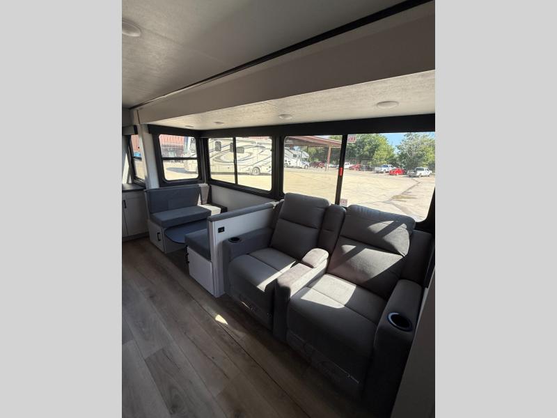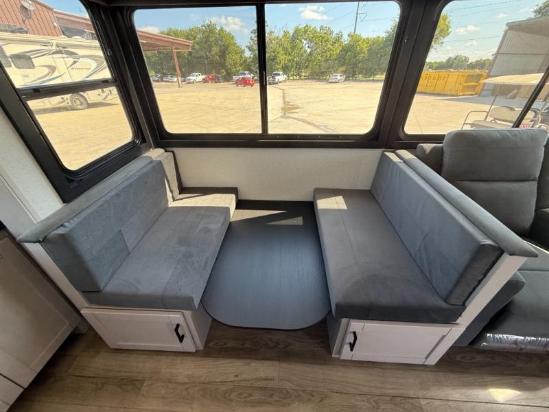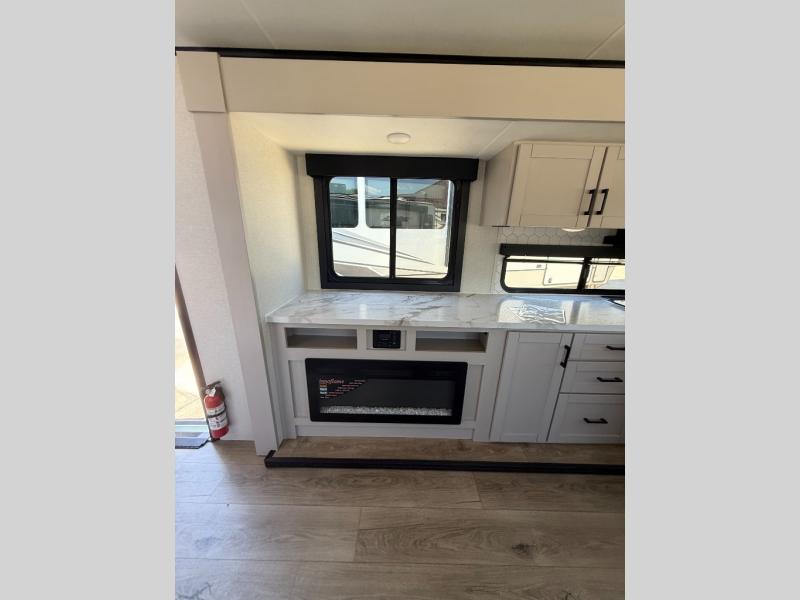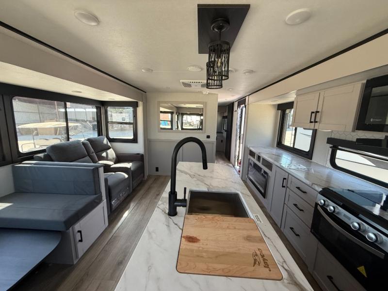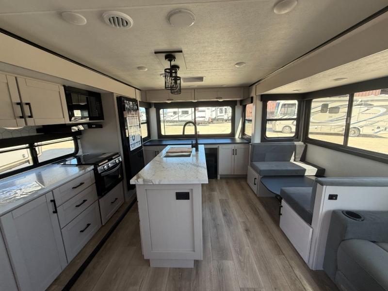 Perfect for weekend trips or extended stays, this travel trailer is the one! You will find a rear desk with an ottoman plus overhead storage if you plan to work while you're away from home. The dual opposing slides in the combined kitchen and living area will create an open floorplan, and the kitchen island will provide the chef of your group with more counter space. There is a tri-fold sofa and booth dinette that double as seating and sleeping space, and the full bath onboard will keep everyone clean. Don't overlook the front private bedroom with a queen bed and plenty of storage space for your belongings!