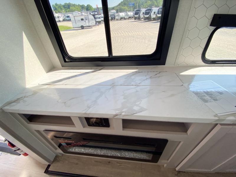 Perfect for weekend trips or extended stays, this travel trailer is the one! You will find a rear desk with an ottoman plus overhead storage if you plan to work while you're away from home. The dual opposing slides in the combined kitchen and living area will create an open floorplan, and the kitchen island will provide the chef of your group with more counter space. There is a tri-fold sofa and booth dinette that double as seating and sleeping space, and the full bath onboard will keep everyone clean. Don't overlook the front private bedroom with a queen bed and plenty of storage space for your belongings!