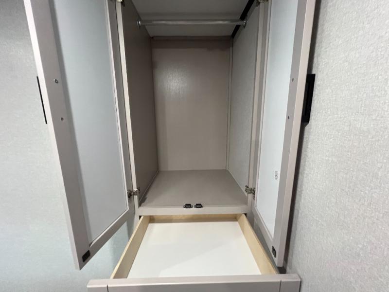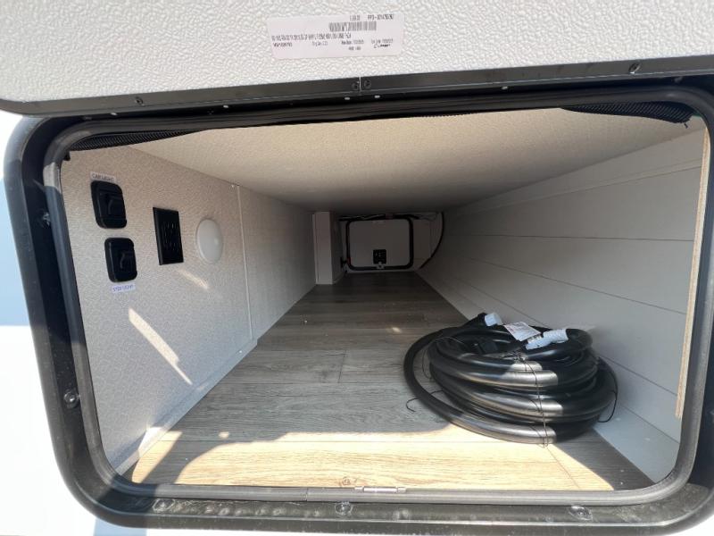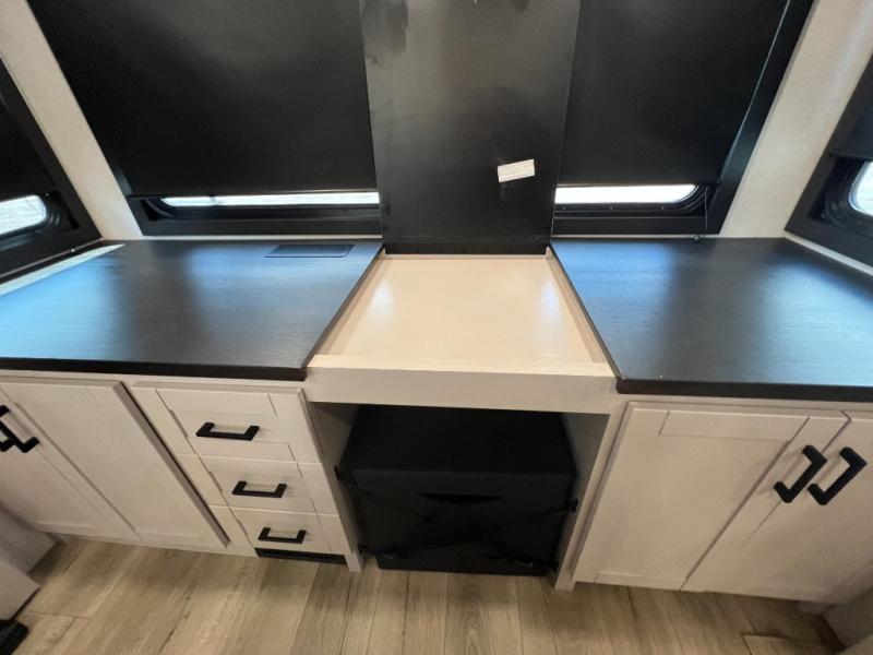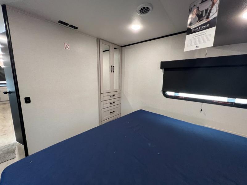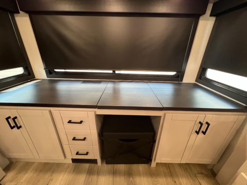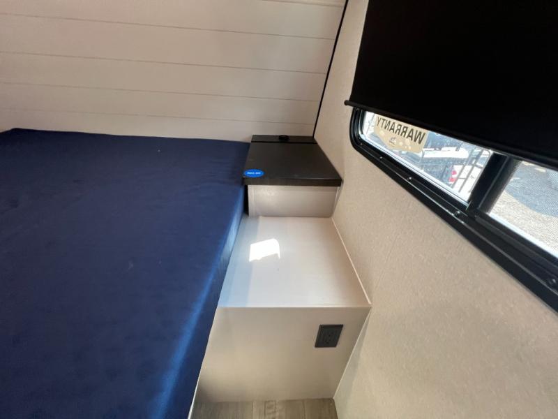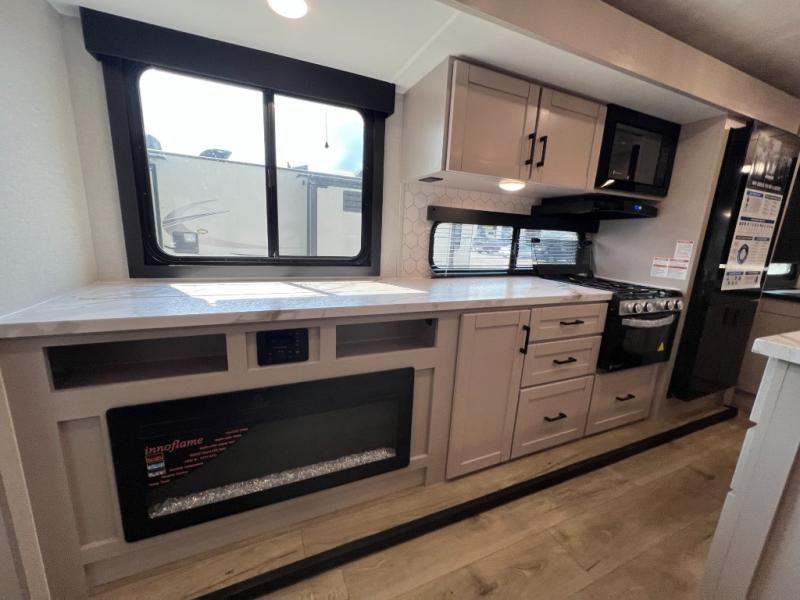 Perfect for weekend trips or extended stays, this travel trailer is the one! You will find a rear desk with an ottoman plus overhead storage if you plan to work while you're away from home. The dual opposing slides in the combined kitchen and living area will create an open floorplan, and the kitchen island will provide the chef of your group with more counter space. There is a tri-fold sofa and booth dinette that double as seating and sleeping space, and the full bath onboard will keep everyone clean. Don't overlook the front private bedroom with a queen bed and plenty of storage space for your belongings!