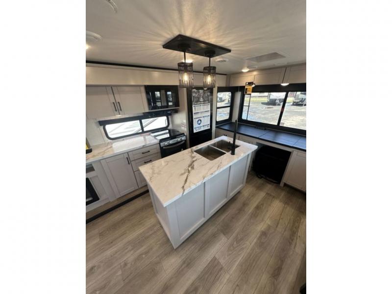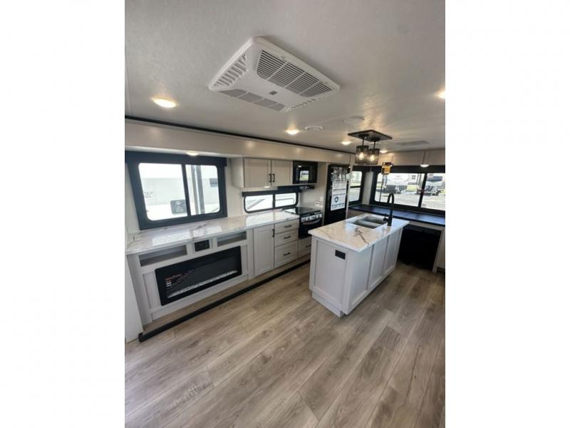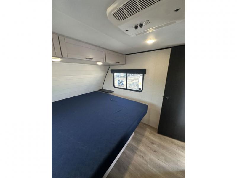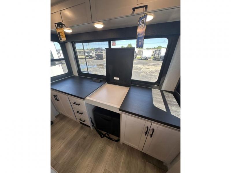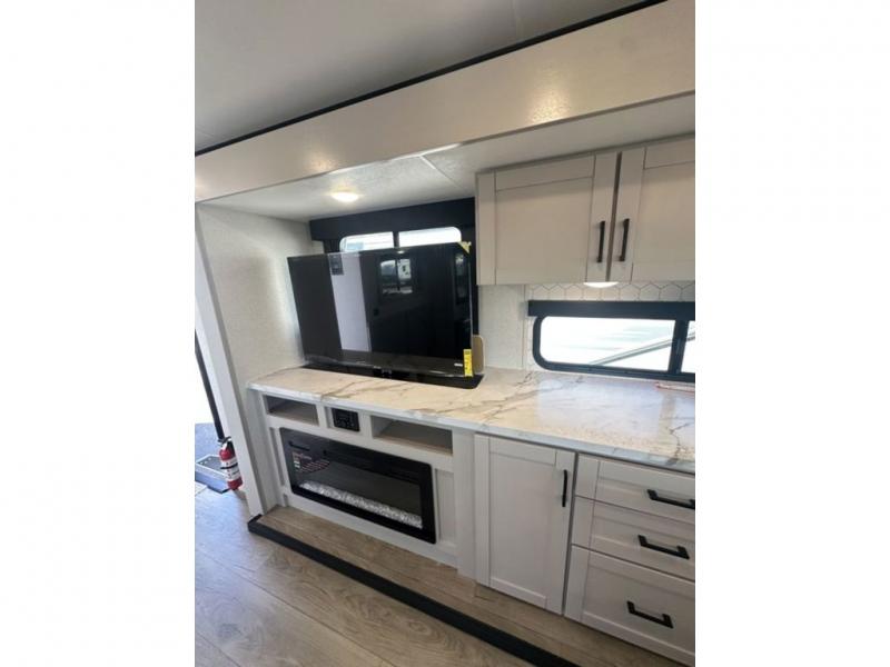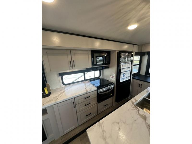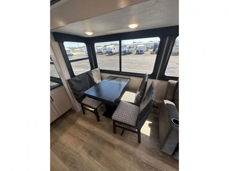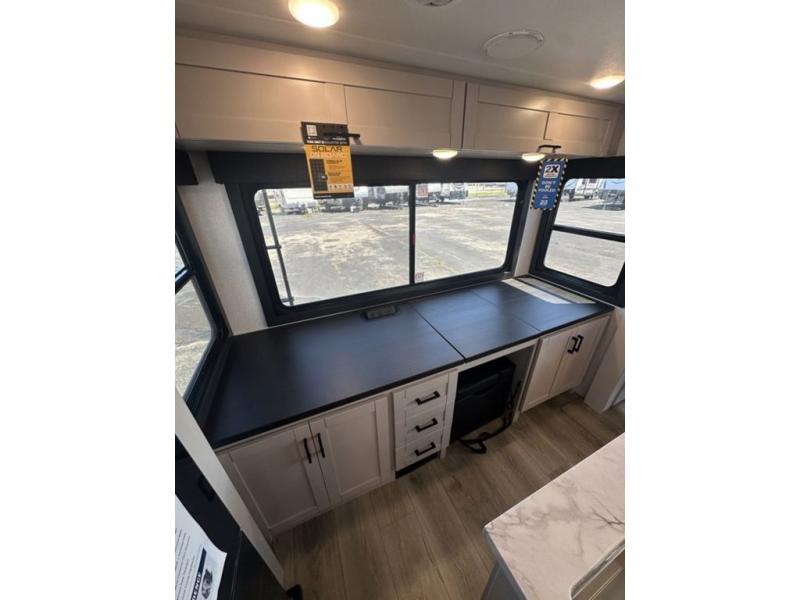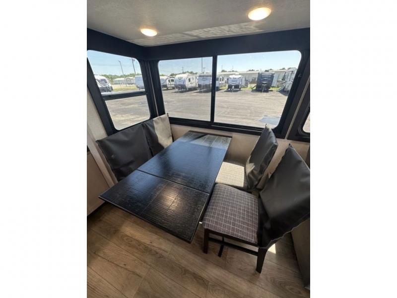 Perfect for weekend trips or extended stays, this travel trailer is the one! You will find a rear desk with an ottoman plus overhead storage if you plan to work while you're away from home. The dual opposing slides in the combined kitchen and living area will create an open floorplan, and the kitchen island will provide the chef of your group with more counter space. There is a tri-fold sofa and booth dinette that double as seating and sleeping space, and the full bath onboard will keep everyone clean. Don't overlook the front private bedroom with a queen bed and plenty of storage space for your belongings!