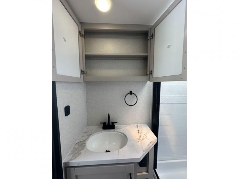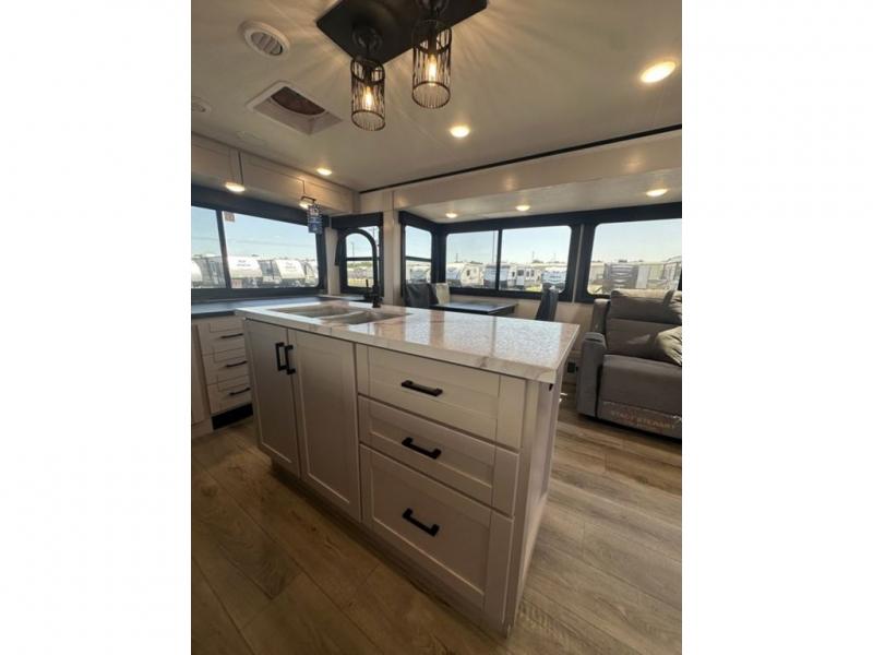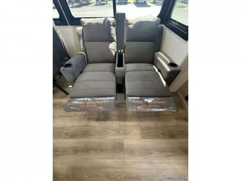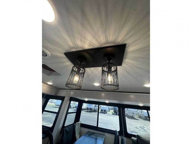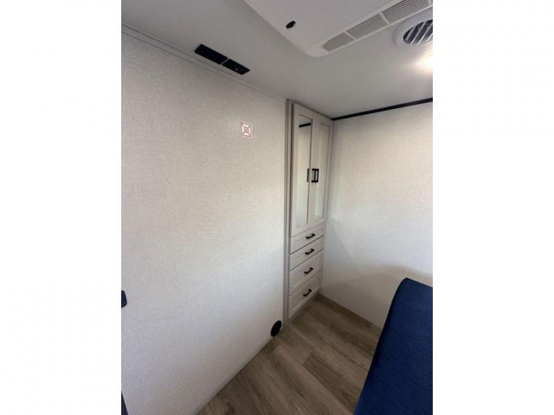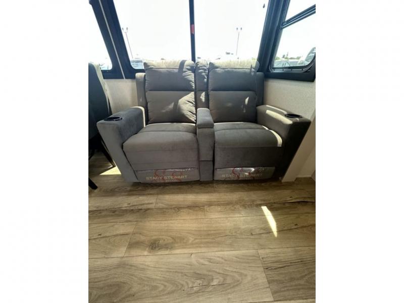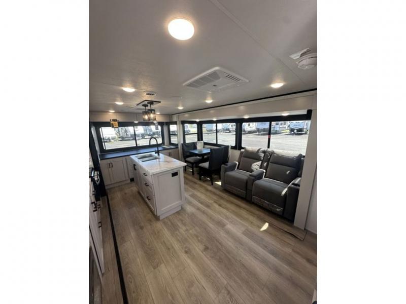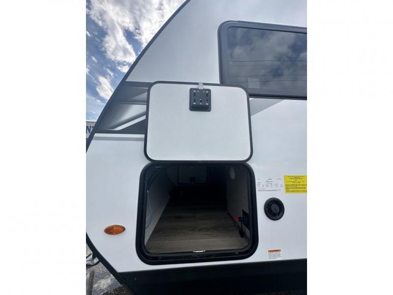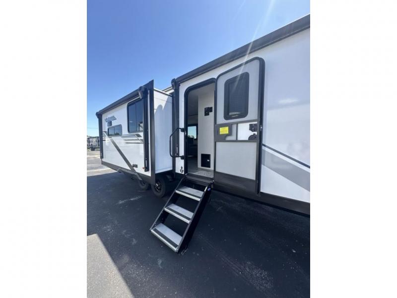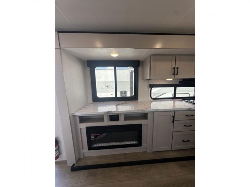 Perfect for weekend trips or extended stays, this travel trailer is the one! You will find a rear desk with an ottoman plus overhead storage if you plan to work while you're away from home. The dual opposing slides in the combined kitchen and living area will create an open floorplan, and the kitchen island will provide the chef of your group with more counter space. There is a tri-fold sofa and booth dinette that double as seating and sleeping space, and the full bath onboard will keep everyone clean. Don't overlook the front private bedroom with a queen bed and plenty of storage space for your belongings!